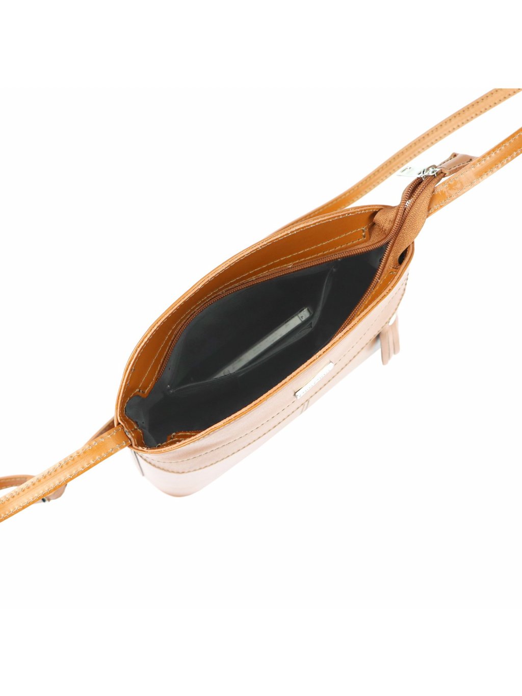 Tato menší kožená crossbody kabelka je ušitá z pravé hovězí kůže. Celá kabelka je zipově uzavíratelná a má jeden vnitřní prostor, ve kterém nalezneme praktickou zipem uzavíratelnou kapsičku. Další dvě menší kapsičky má kabelka na obou stranách. Stylový vzhled potrhuje decentní třáseň na přední straně. Kabelka má nastavitelný popruh pro pohodlné nošení jak přes rameno, tak do kříže.