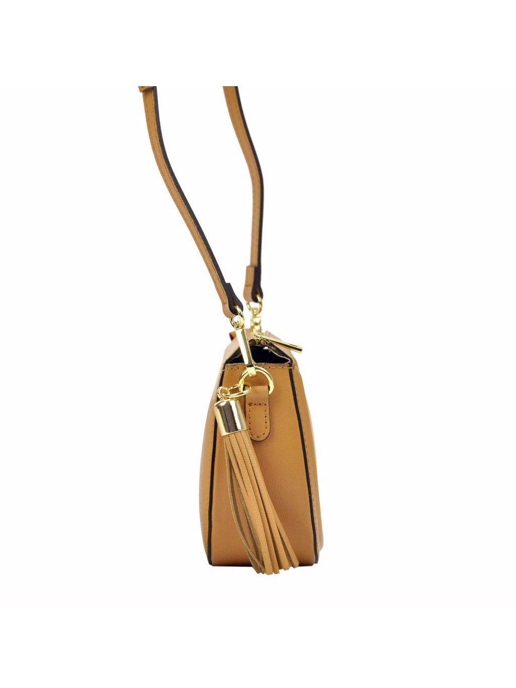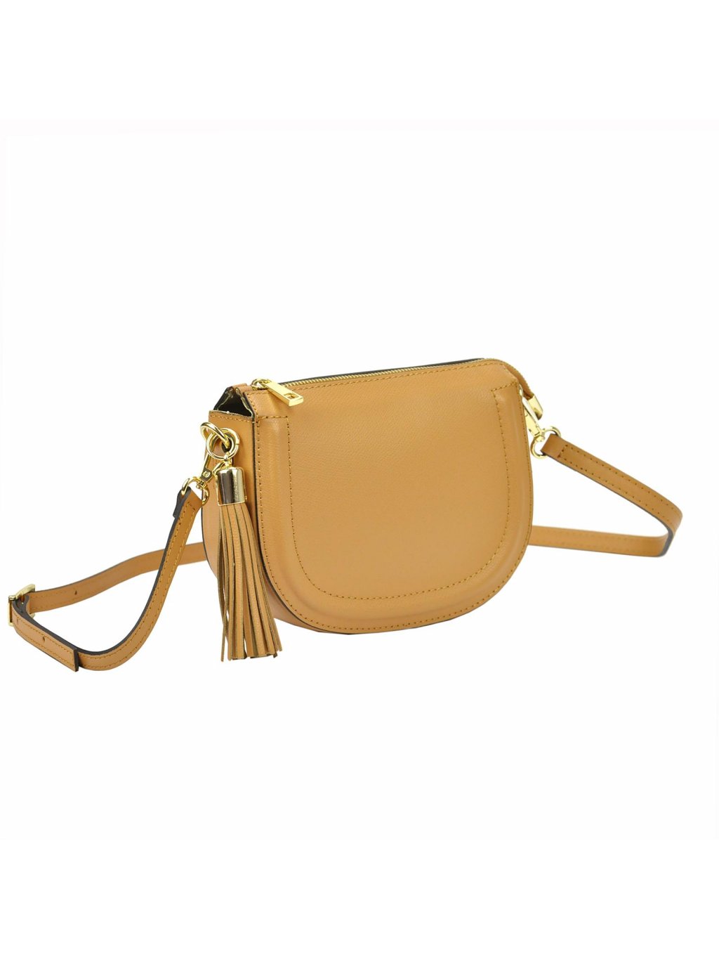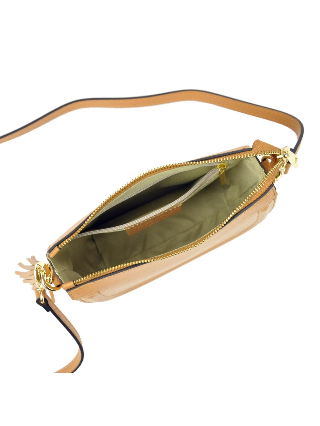 Elegantní dámská kožená crossbody kabelku ušitá z pravé hovězí kůže typu saffiano. Celá kabelka se uzavírá zipem, po jehož rozepnutí uvnitř objevíme hlavní přihrádku s pevnou látkovou přihrádkou a postranní zipem uzavíratelnou kapsičku. Výrazným prvkem kabelky je ozdobná třáseň umístěná na pravé straně. Nedílnou součástí je i nastavitelný popruh přes rameno. Kovaní na kabelce má zlatou barvu.