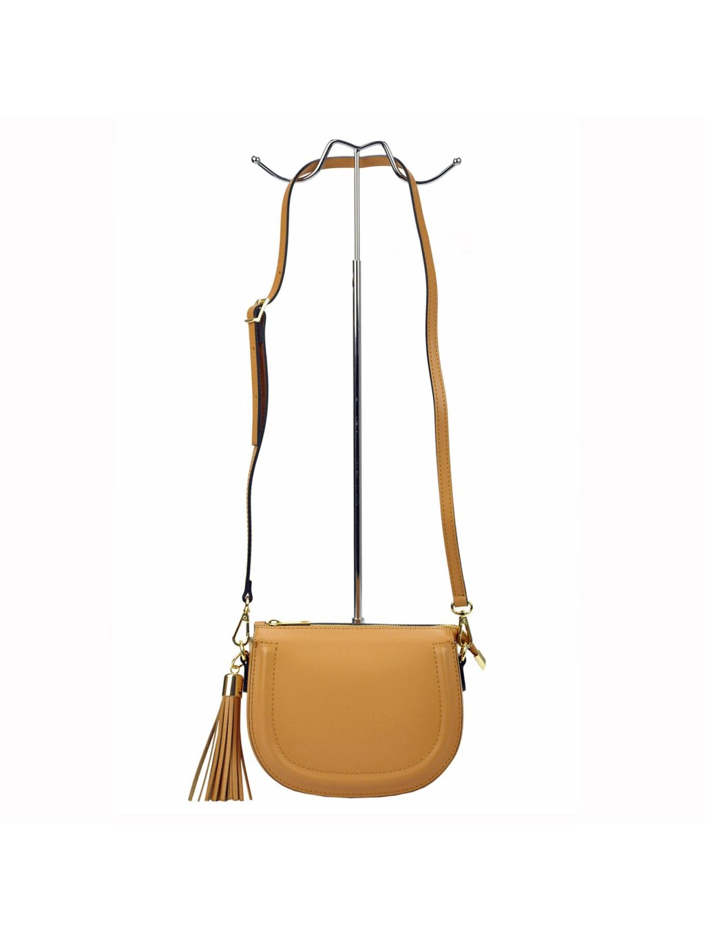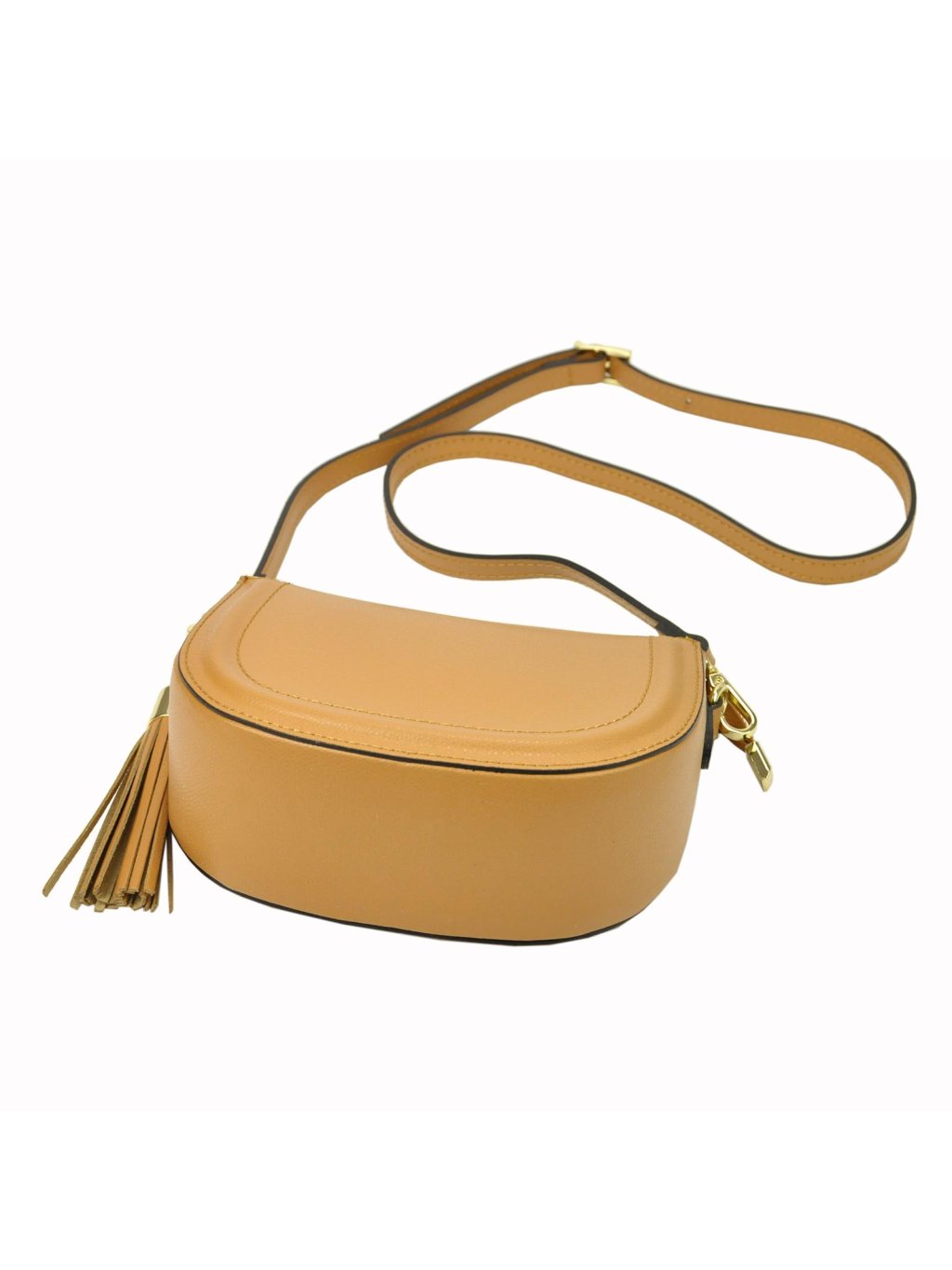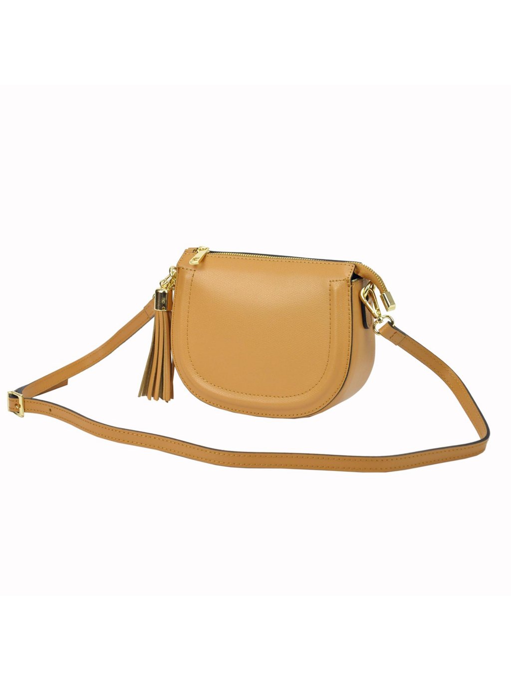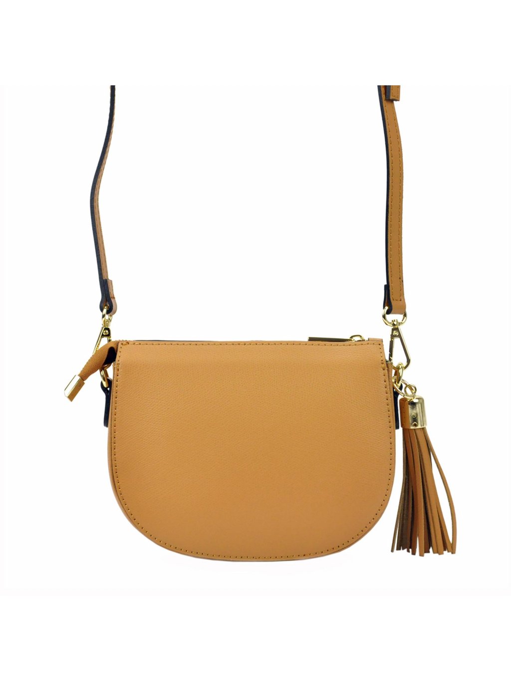 Elegantní dámská kožená crossbody kabelku ušitá z pravé hovězí kůže typu saffiano. Celá kabelka se uzavírá zipem, po jehož rozepnutí uvnitř objevíme hlavní přihrádku s pevnou látkovou přihrádkou a postranní zipem uzavíratelnou kapsičku. Výrazným prvkem kabelky je ozdobná třáseň umístěná na pravé straně. Nedílnou součástí je i nastavitelný popruh přes rameno. Kovaní na kabelce má zlatou barvu.