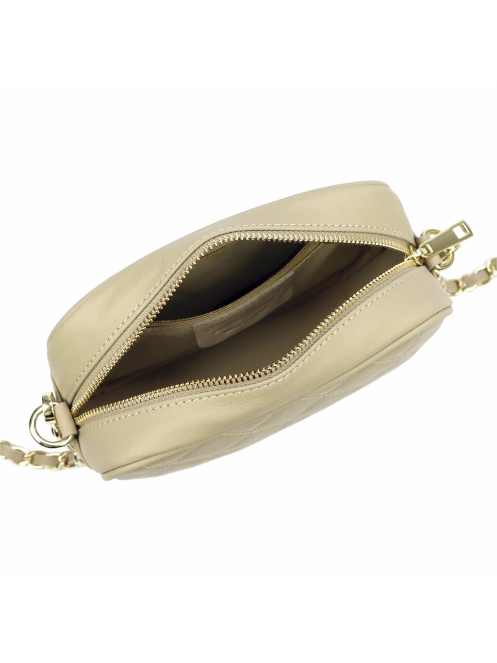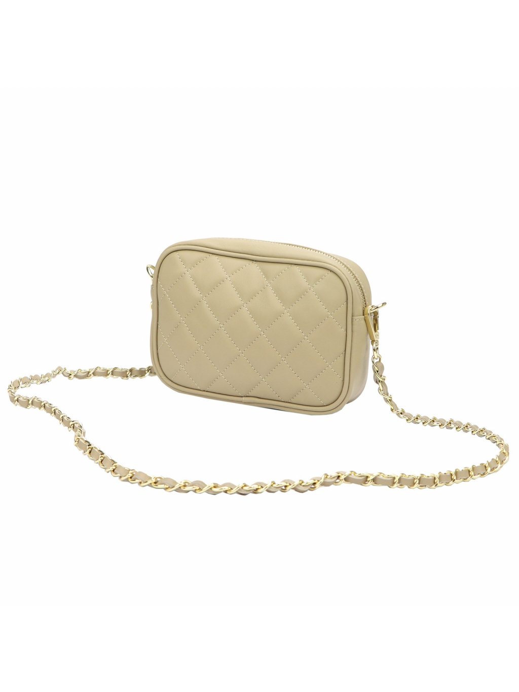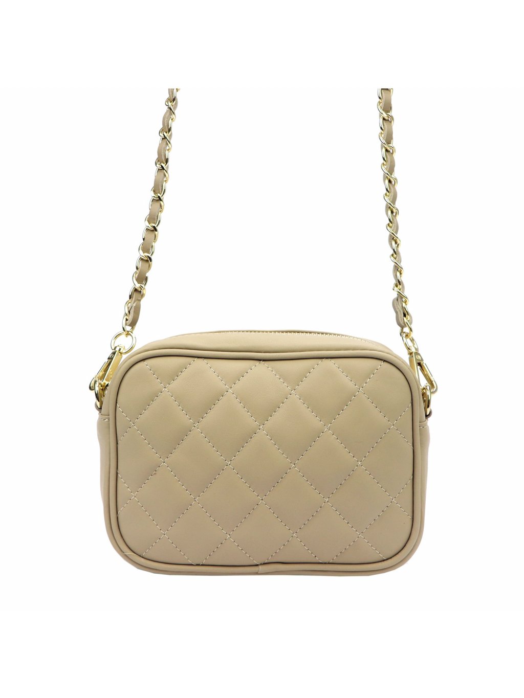 Italská kožená kabelka vyrobená z měkké přírodní hovězí kůže. Celá kabelka je prošívaná, což zdůrazňuje její originální vzhled. Model je jednokomorový, uzavíratelný na zip. Uvnitř se nachází látková podšívka a jedna otevřená kapsa. Zajímavým řešením je popruh ve formě řetízku ve zlaté barvě.