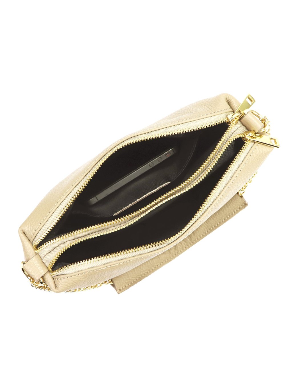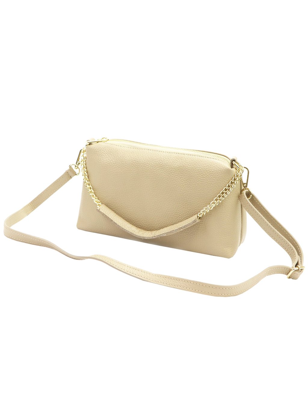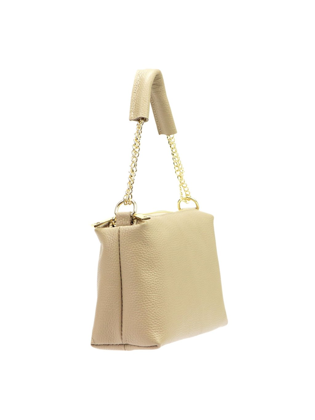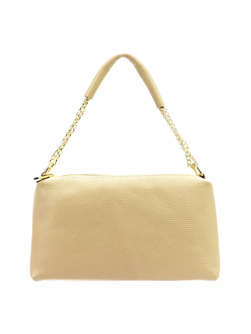 Italská kabelka ušitá z přírodní lícové kůže. Kabelka má klasický obdélníkový tvar a ucha ve formě řetízků. Celá kabelka má dvoukomorovou konstrukci. Uvnitř najdete kapsičkou na zip a kapsičku na telefon. Obě komory jsou uzavíratelné masivními kovovými zipy. Kabelka se dá nosit v ruce, na předloktí a dlouhý popruh umožňuje pohodlné nošení na rameni. Kovaní má zlatou barvu.