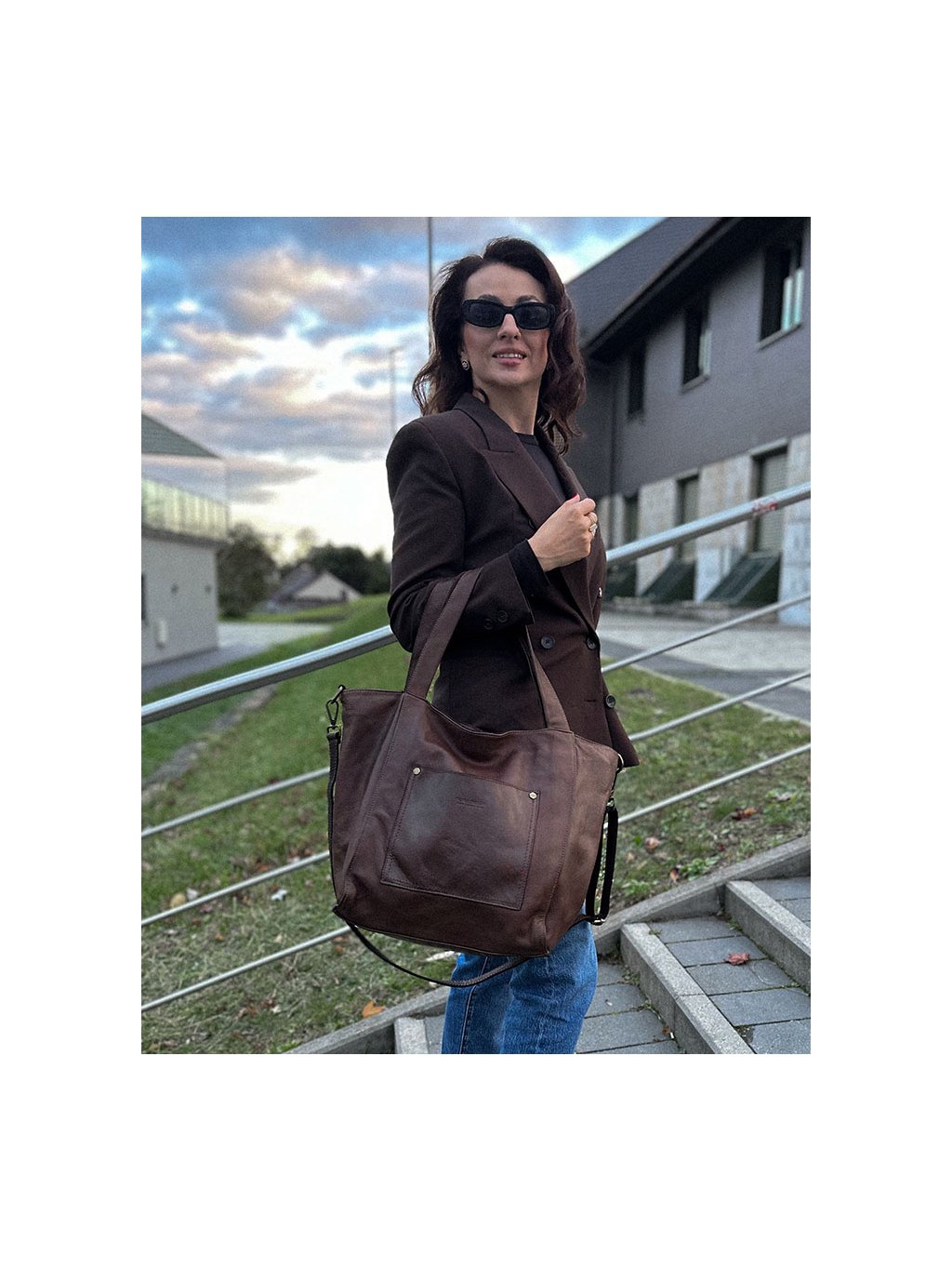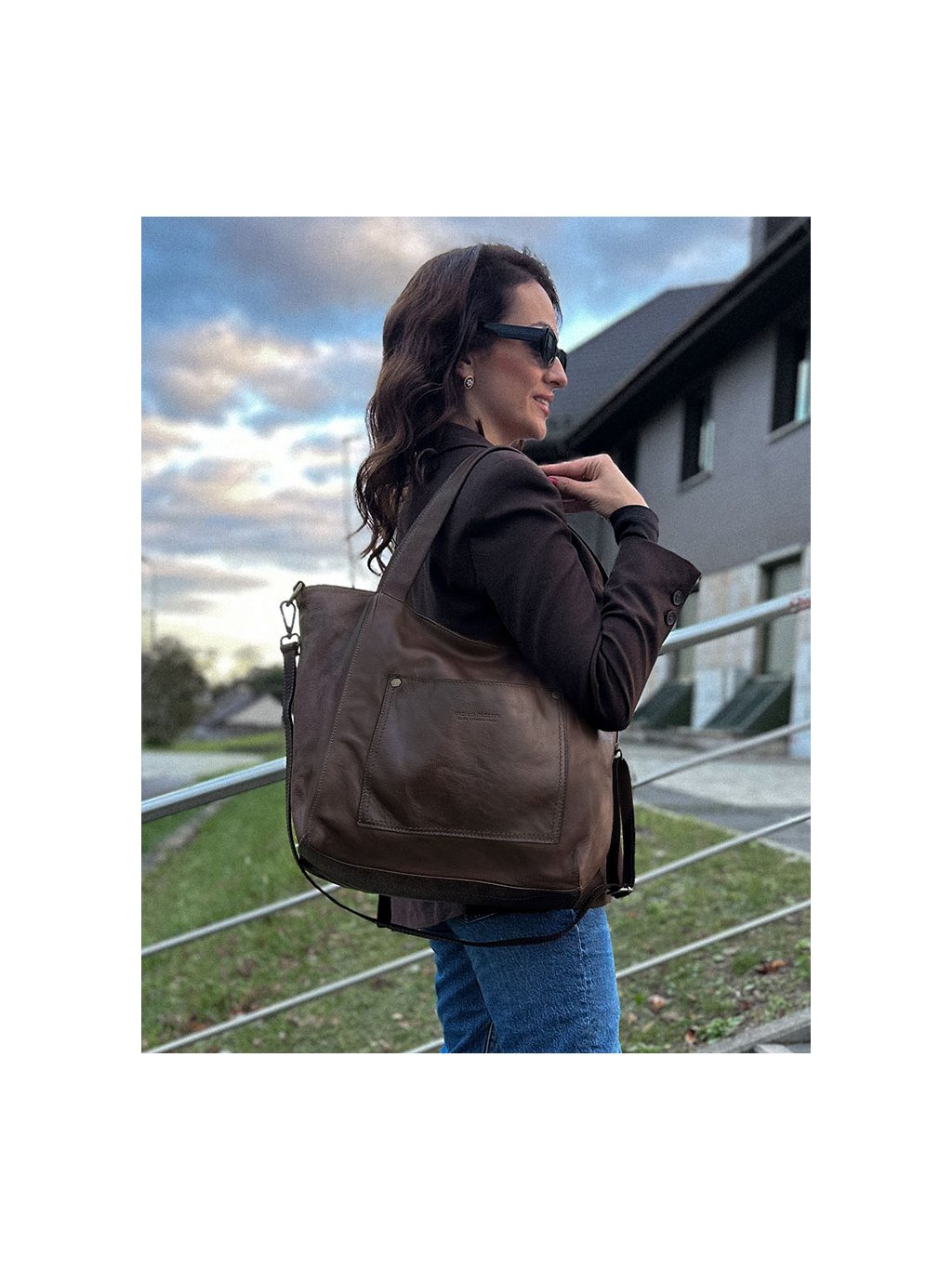 Tato elegantní kožená kabelka v moderním vintage stylu je přizpůsobená potřebám aktivní ženy. Je funkční, prostorná a díky širokým uchům i pohodlná. Vypadá dobře jak k elegantnímu, tak ležérnímu stylu. Taška je ručně šitá z měkké přírodní telecí kůže, která je ručně dobarvována. Přístup do vnitřního prostoru zajišťuje masivní mosazný zip. Uvnitř kabelky je pevná látková podšívka, 3 kapsy, z toho jedna se zapíná zipem. Další designovou kapsičku nalezneme na přední straně a jednu prostornou zipem uzavíratelnou kapsu vzadu. Do kabelky se vejde i formát A4.