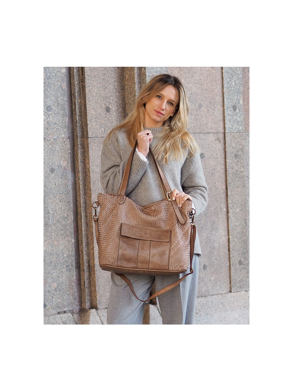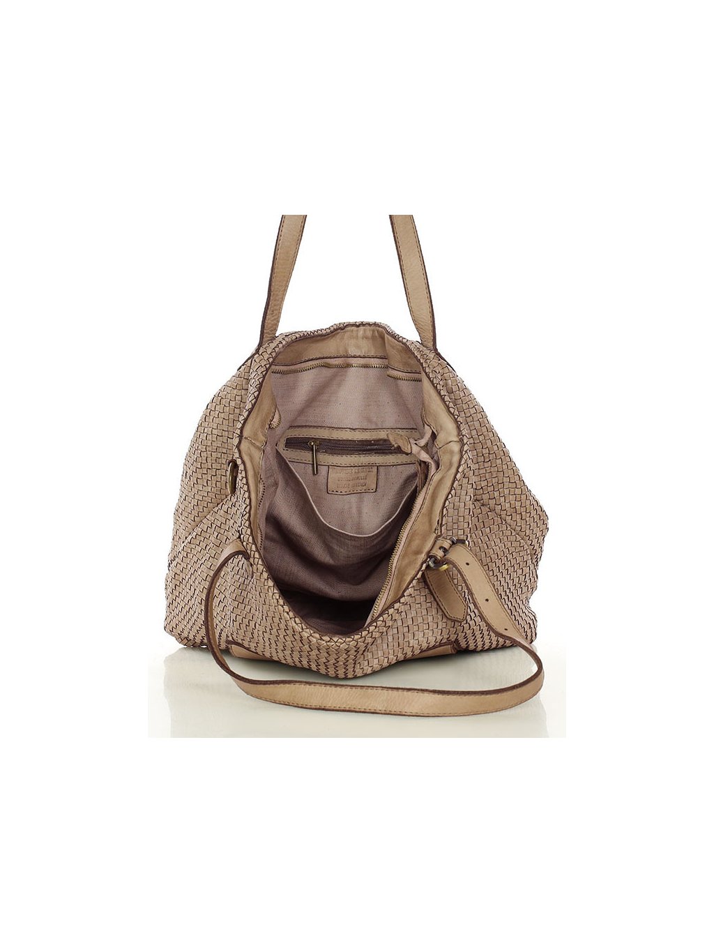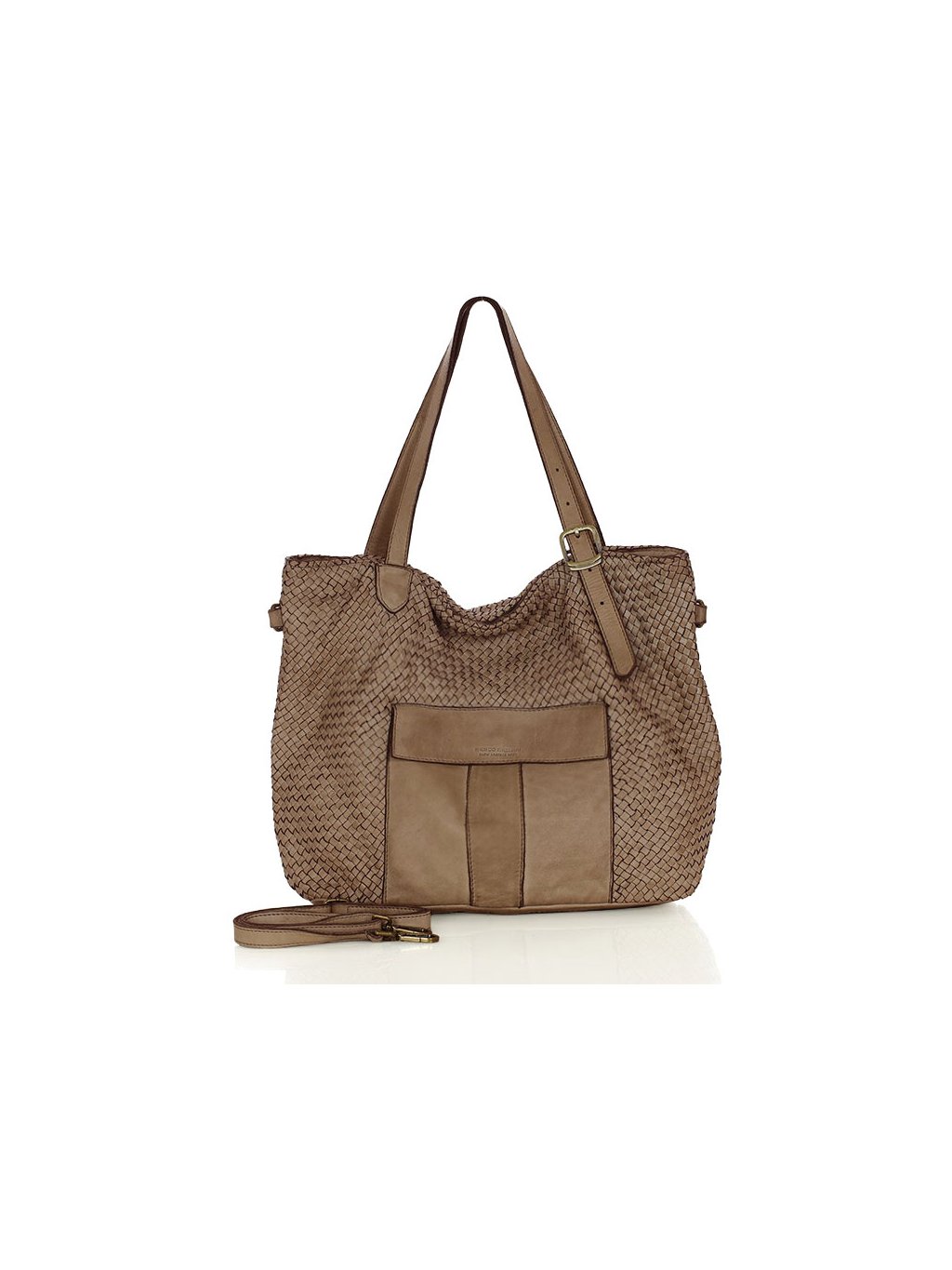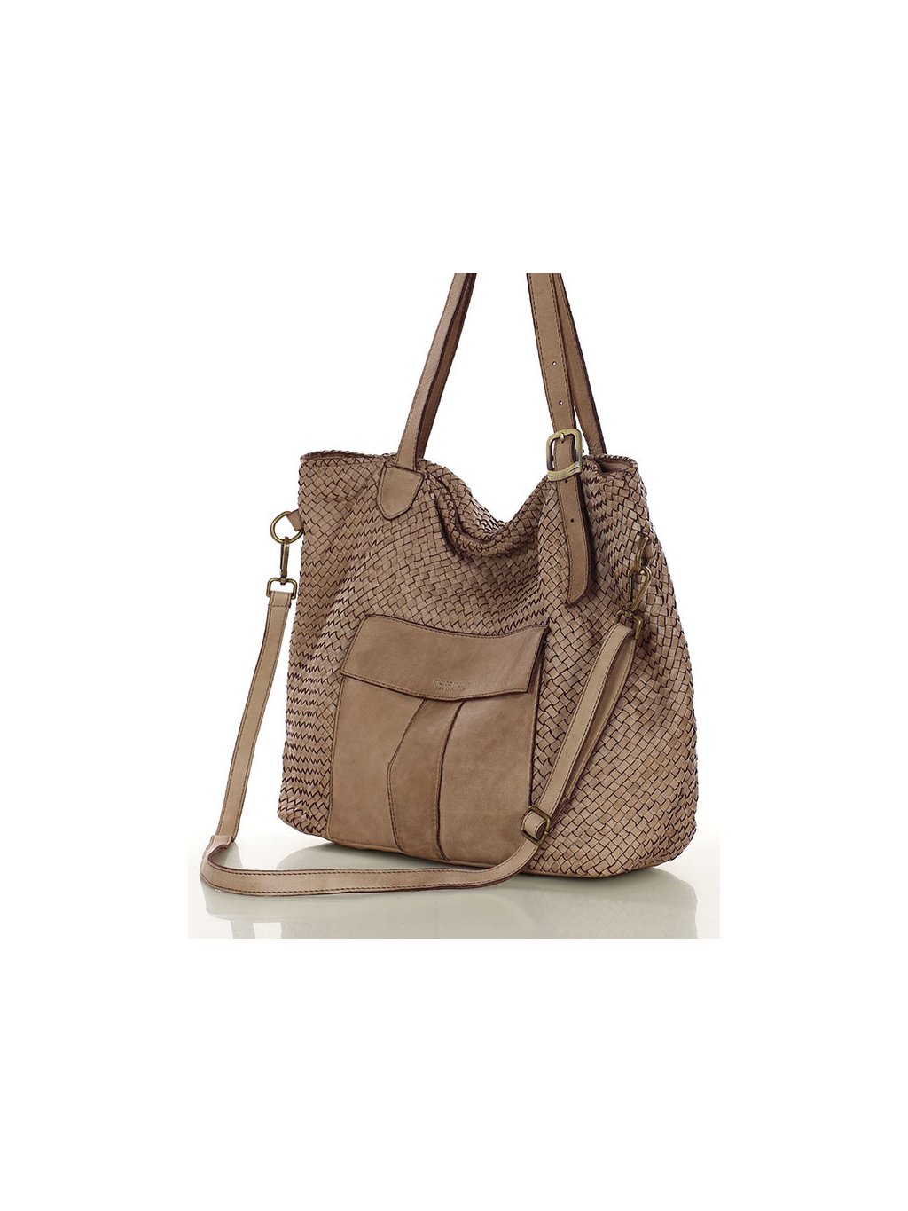 Tato prostorná proplétaná kožená kabelka z provenience firmy Marco Mazzini je ušitá z pravé přírodní kůže. Díky dvojitým uchům a přiloženému nastavitelnému popruhu je vhodná jak na nošení v ruce, tak přes rameno i do kříže. Hlavní prostor je chráněn zipem, uvnitř se nachází praktická kapsa na zip a dvě otevřené přihrádky. Vnitřek je podšitý jemnou látkovou podšívkou. Na přední straně kabelky je navíc vnější kapsa se zapínáním na magnet, která umožňuje rychlý přístup k drobnostem. Přírodní hovězí kůže je ručně činěná a barvená, přičemž pochází z italských koželužen. Jemné odchylky v barvě a struktuře dodávají každému kusu autentický vzhled, který je výsledkem pečlivé ruční práce. Stylová a zároveň praktická volba pro každodenní nošení.
