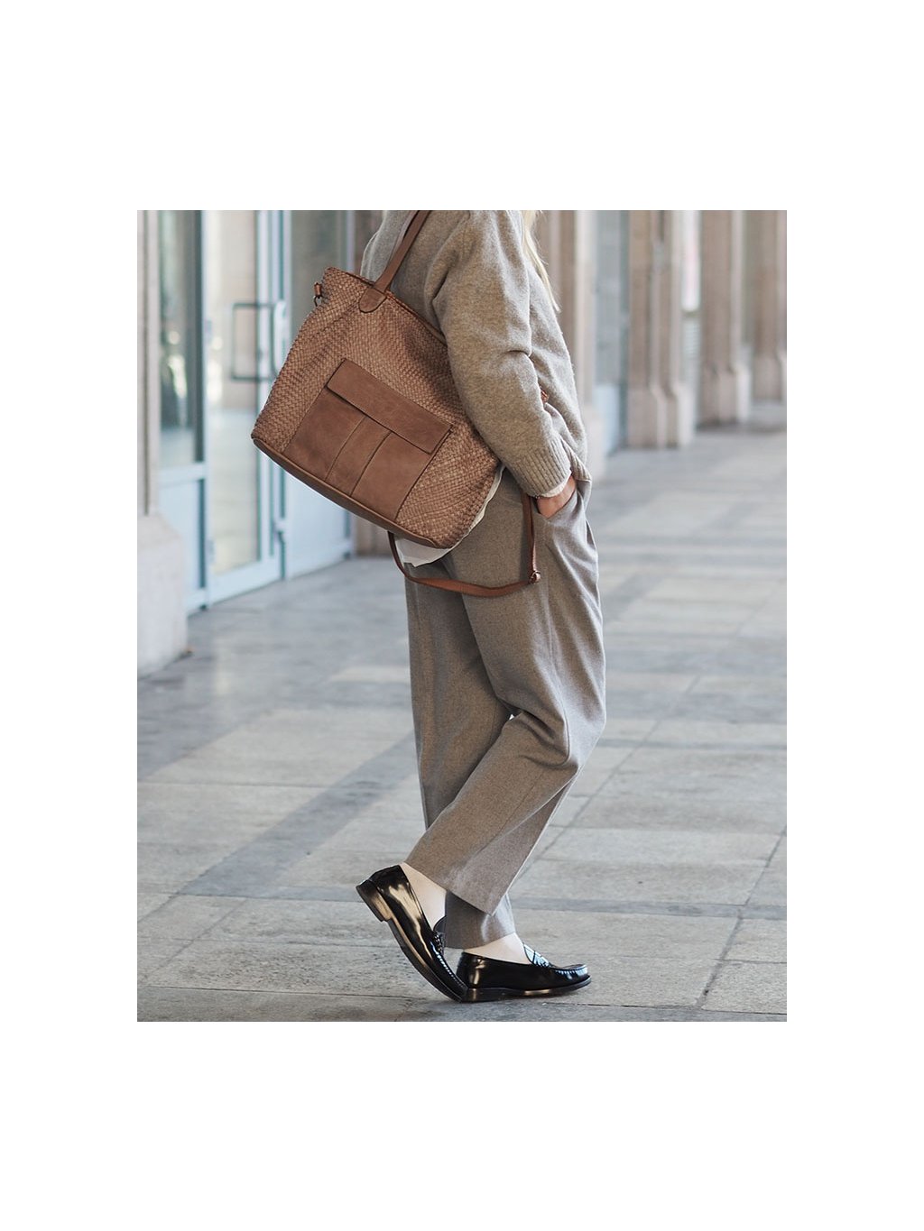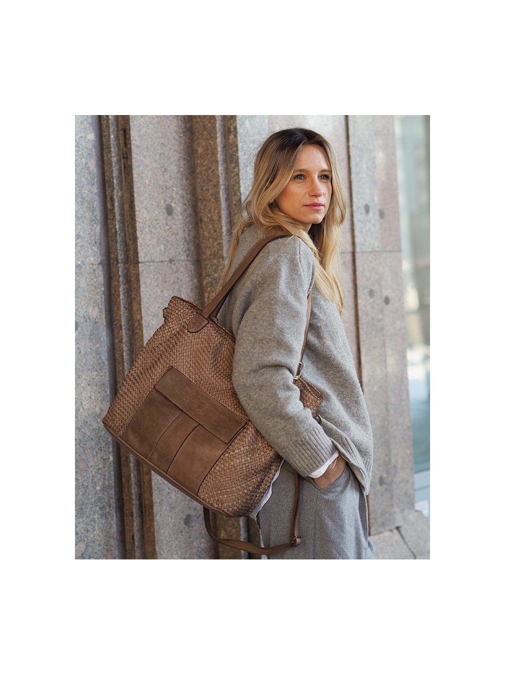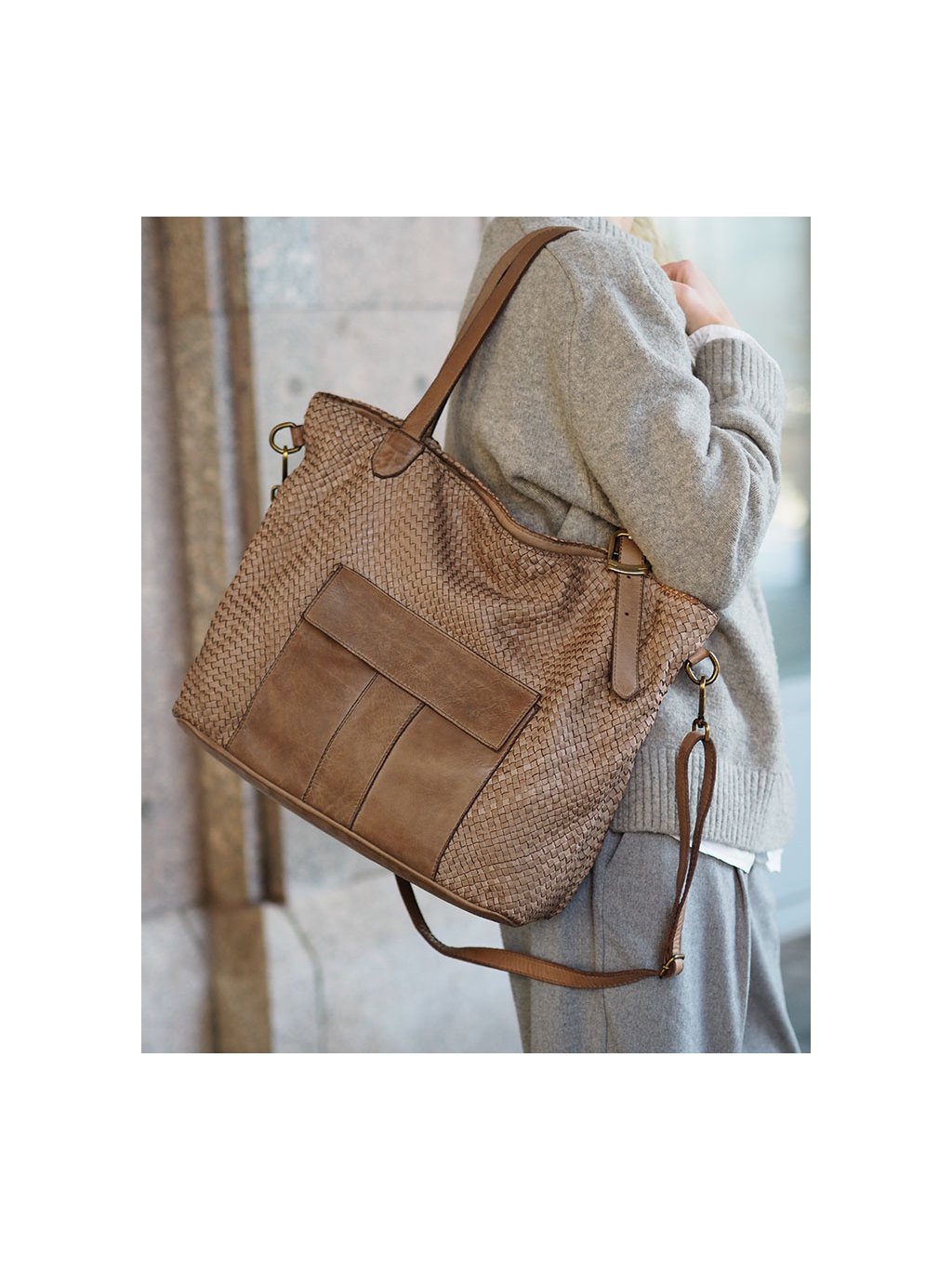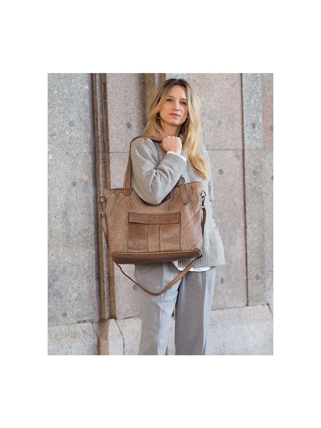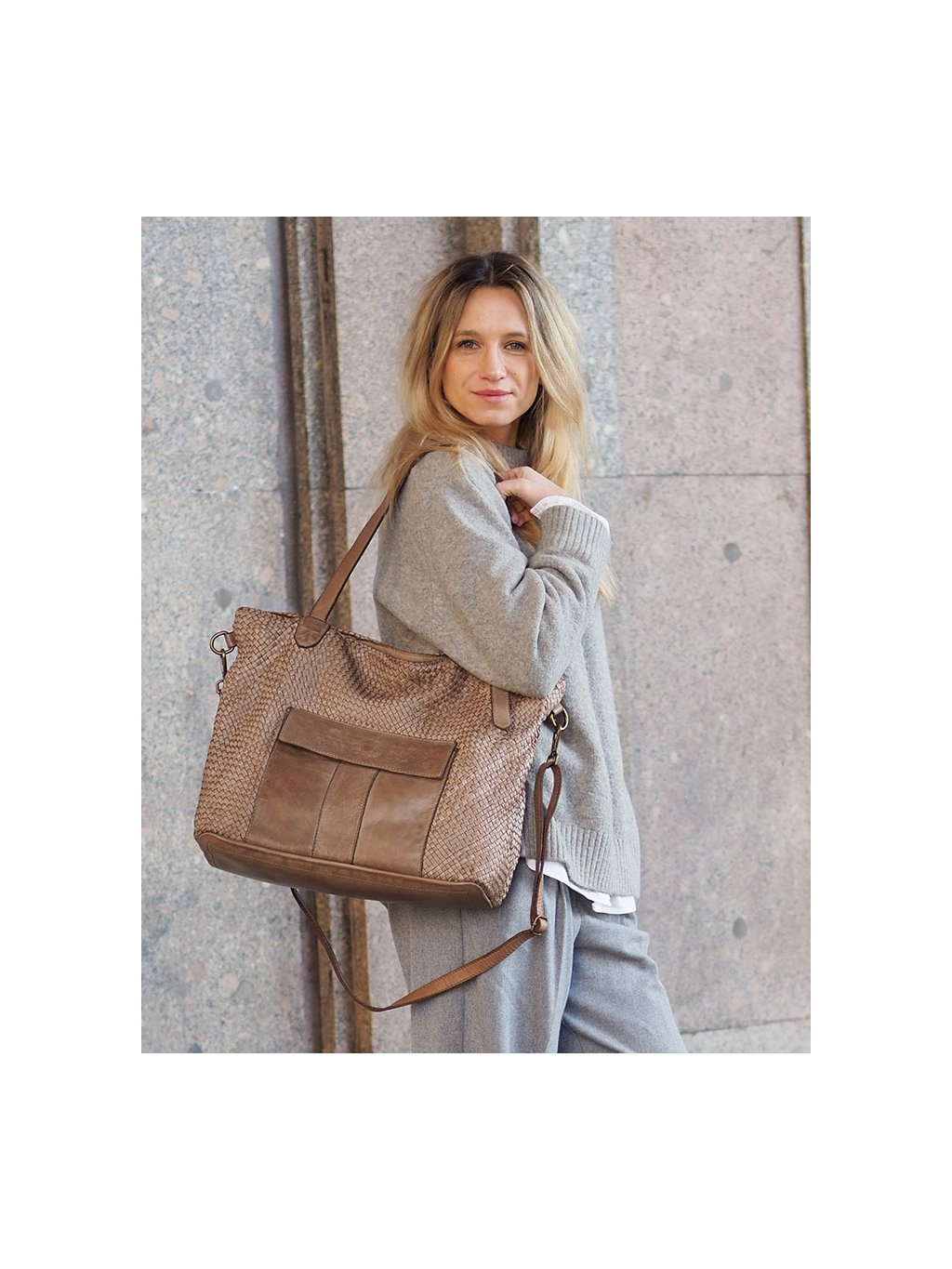 Tato prostorná proplétaná kožená kabelka z provenience firmy Marco Mazzini je ušitá z pravé přírodní kůže. Díky dvojitým uchům a přiloženému nastavitelnému popruhu je vhodná jak na nošení v ruce, tak přes rameno i do kříže. Hlavní prostor je chráněn zipem, uvnitř se nachází praktická kapsa na zip a dvě otevřené přihrádky. Vnitřek je podšitý jemnou látkovou podšívkou. Na přední straně kabelky je navíc vnější kapsa se zapínáním na magnet, která umožňuje rychlý přístup k drobnostem. Přírodní hovězí kůže je ručně činěná a barvená, přičemž pochází z italských koželužen. Jemné odchylky v barvě a struktuře dodávají každému kusu autentický vzhled, který je výsledkem pečlivé ruční práce. Stylová a zároveň praktická volba pro každodenní nošení.