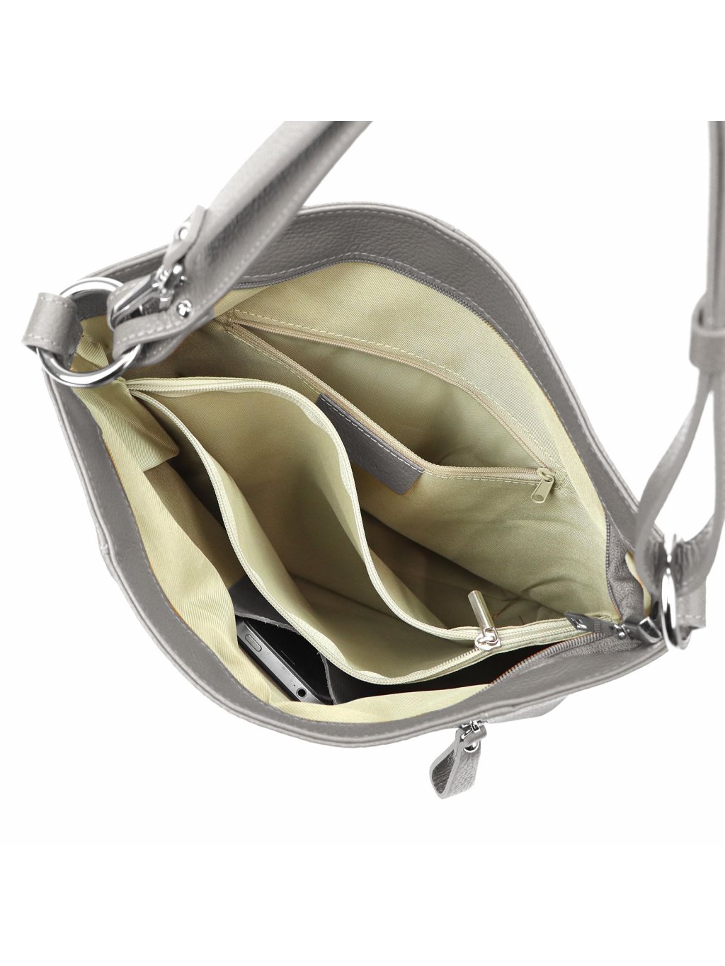Kožená kabelka MiaMore ušitá z pravé přírodní kůže nabízí praktické členění a nadčasový styl. Hlavní prostor je podšitý pevnou látkovou podšívkou, rozdělený zipovou přepážkou a doplněný o kapsu na zip a otevřenou kapsičku na telefon. Další úložné kapsy se nacházejí na přední i zadní straně kabelky. Model se uzavírá zipem a je vybaven dlouhým uchem, které umožňuje pohodlné nošení na rameni. Rozepnutím zipu uprostřed se délka ucha zdvojnásobí, což umožňuje i pohodlné nošení křížem přes tělo.