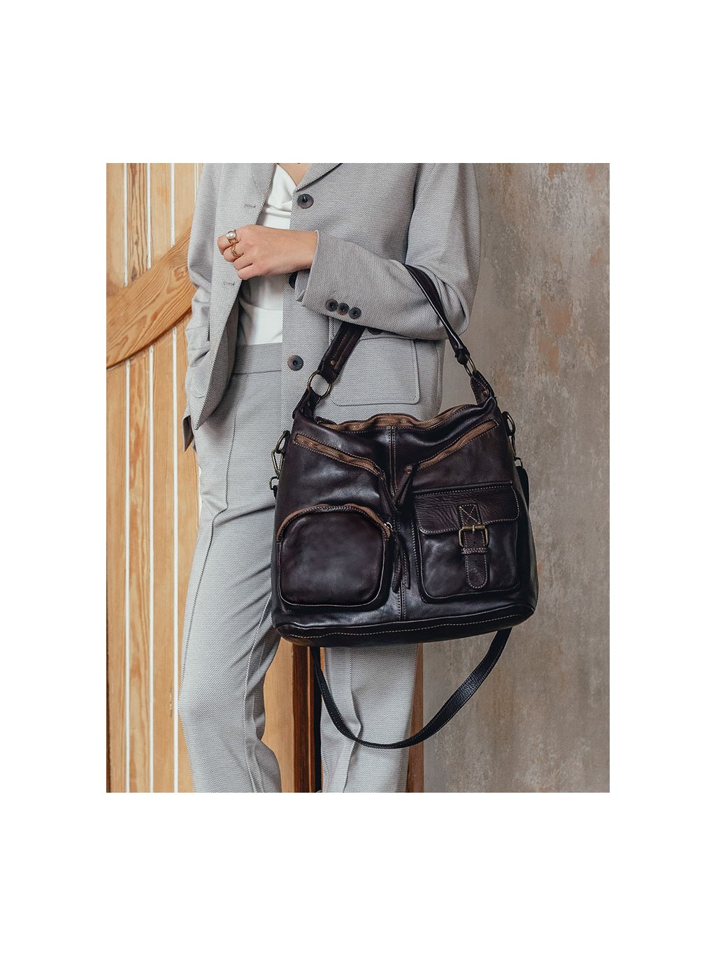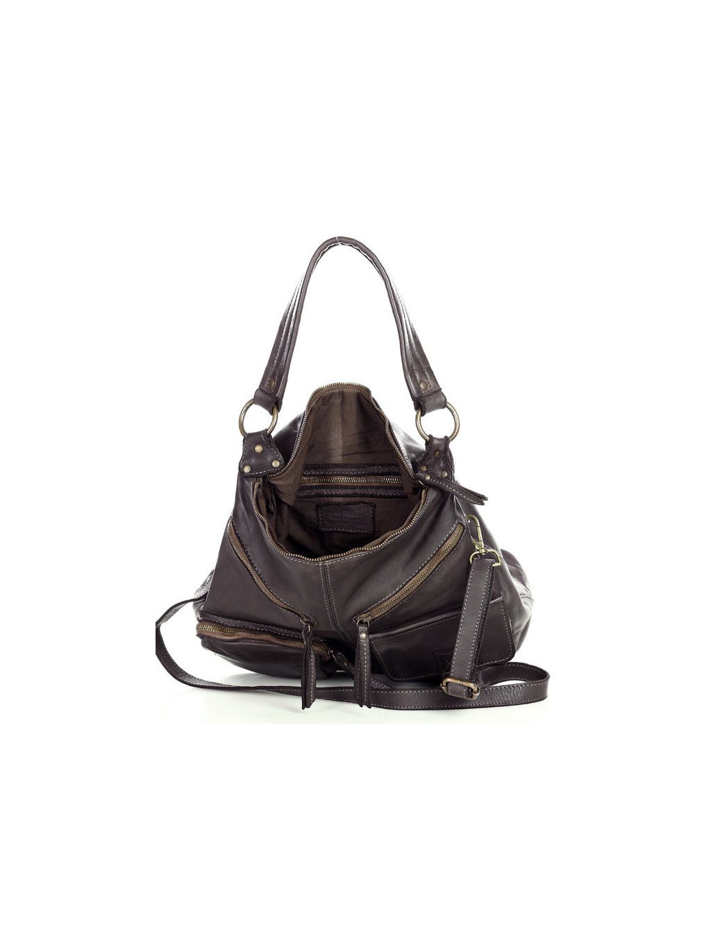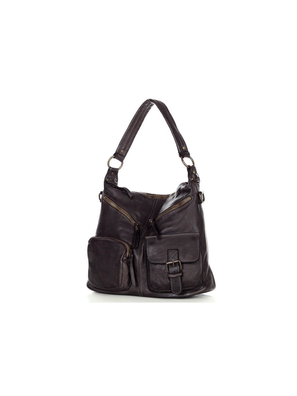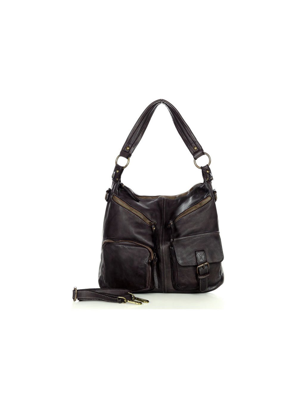 Italští návrháři znají tajemství dokonalé kabelky! Ženám, které mají rády nadčasový styl a'la moda italiana a praktický doplněk pro každý den v týdnu, doporučujeme tuto značkovou italskou kabelku. Taška je vyrobena z kvalitní přírodní kůže typu vintage. Taška je ručně šitá a barvená podle nejnovějších trendů v nejlepších italských koželužnách, díky čemuž je každý exemplář výjimečný a jedinečný. Přístup do vnitřního prostoru je chráněn masivním mosazným zipem. Na přední straně kabelky jsou 4 kapsy, do kterých můžete libovolně umístit všechny drobnosti, které chcete mít vždy po ruce. Uvnitř kabelky jsou další 3 kapsy, z toho je jedna na zip. Do tašky se vejde i formát A4, proto je ideální jako kabelka do práce. Taška je dodávána s dlouhým popruhem, po jehož připevnění ji můžete nosit pohodlně na rameni.