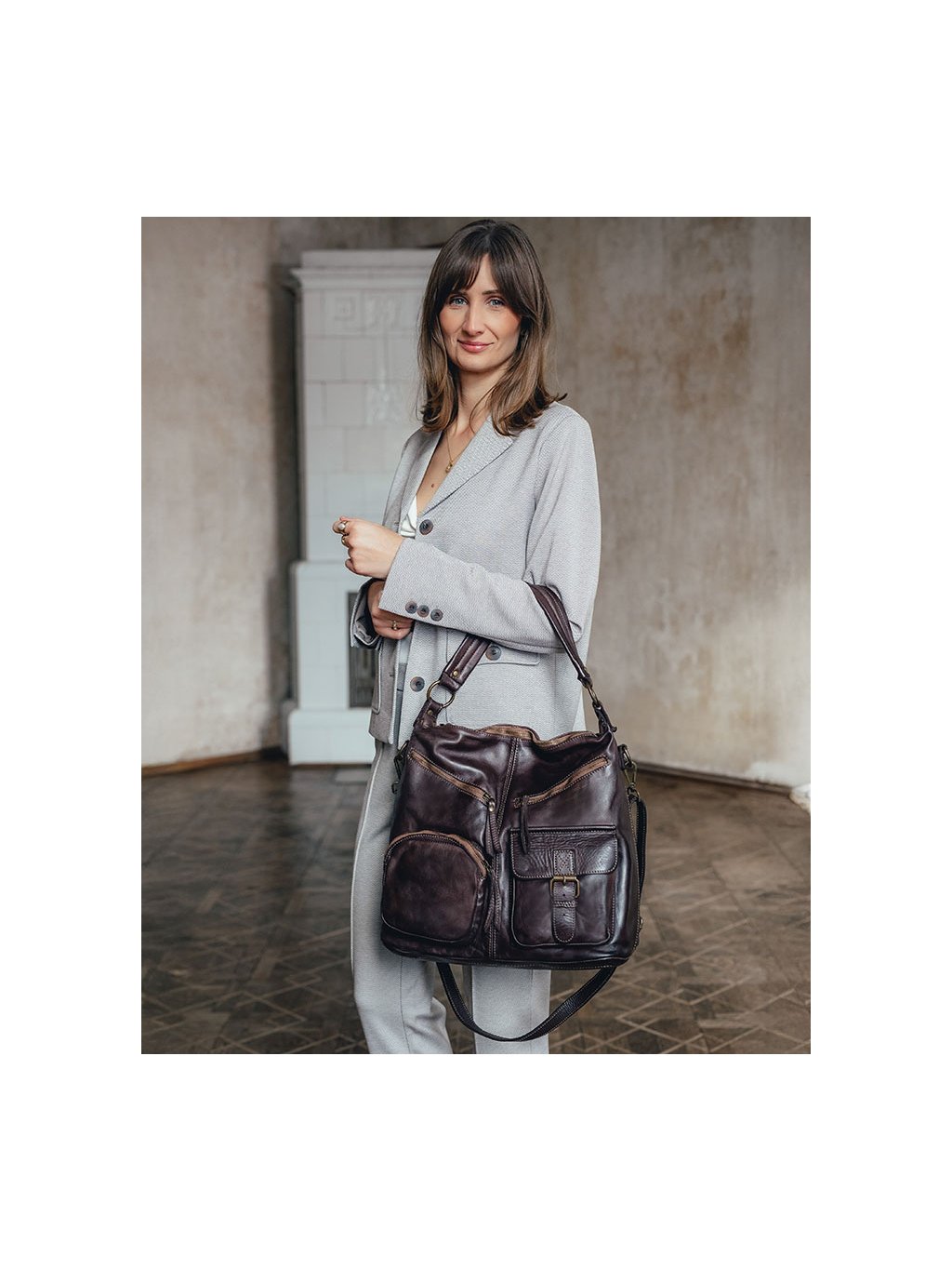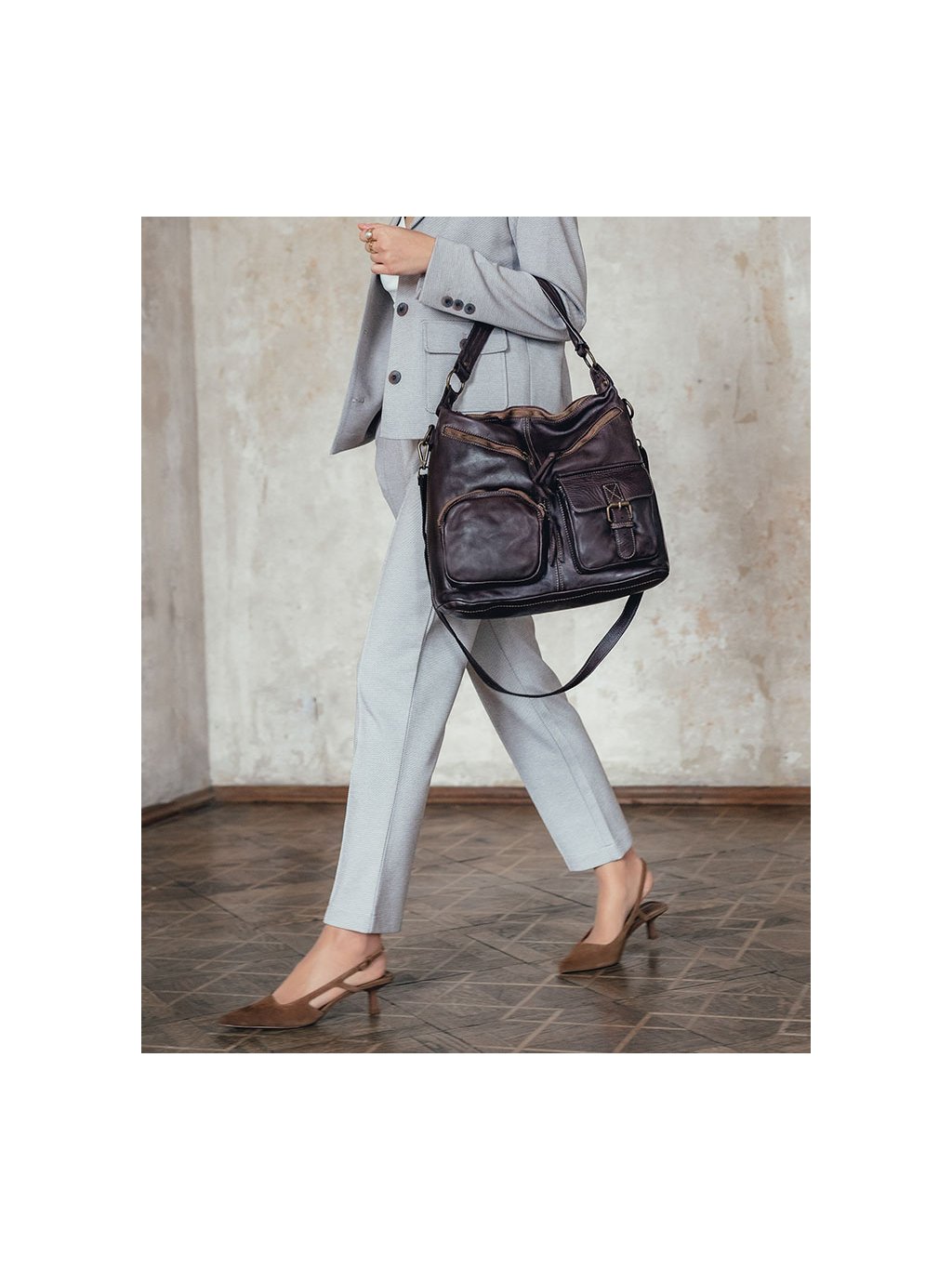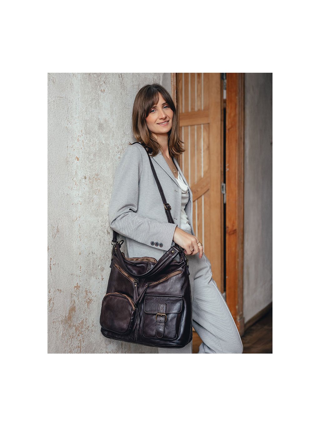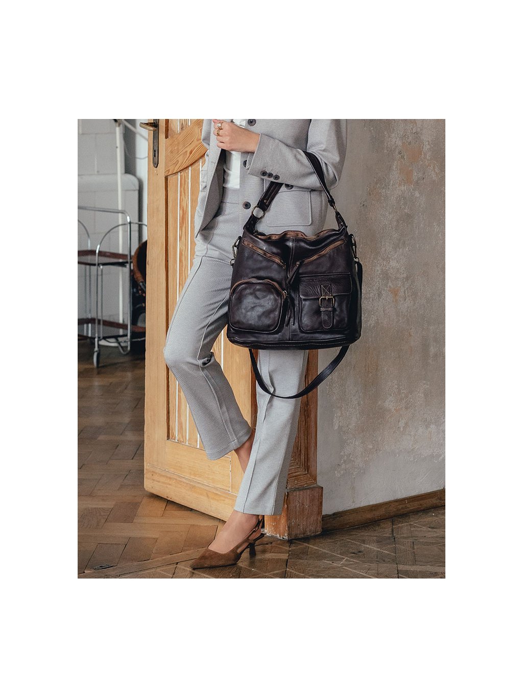 Italští návrháři znají tajemství dokonalé kabelky! Ženám, které mají rády nadčasový styl a'la moda italiana a praktický doplněk pro každý den v týdnu, doporučujeme tuto značkovou italskou kabelku. Taška je vyrobena z kvalitní přírodní kůže typu vintage. Taška je ručně šitá a barvená podle nejnovějších trendů v nejlepších italských koželužnách, díky čemuž je každý exemplář výjimečný a jedinečný. Přístup do vnitřního prostoru je chráněn masivním mosazným zipem. Na přední straně kabelky jsou 4 kapsy, do kterých můžete libovolně umístit všechny drobnosti, které chcete mít vždy po ruce. Uvnitř kabelky jsou další 3 kapsy, z toho je jedna na zip. Do tašky se vejde i formát A4, proto je ideální jako kabelka do práce. Taška je dodávána s dlouhým popruhem, po jehož připevnění ji můžete nosit pohodlně na rameni.