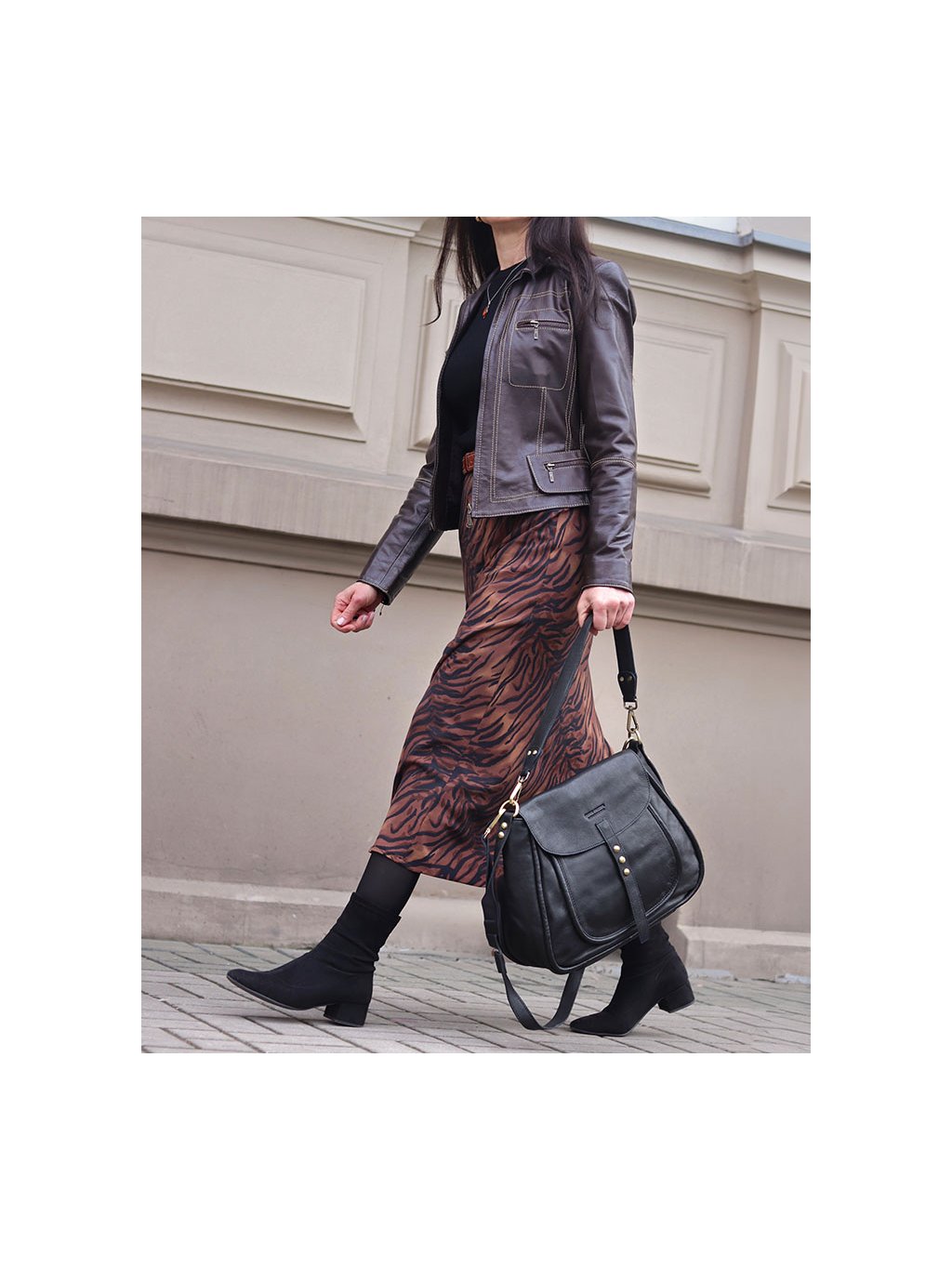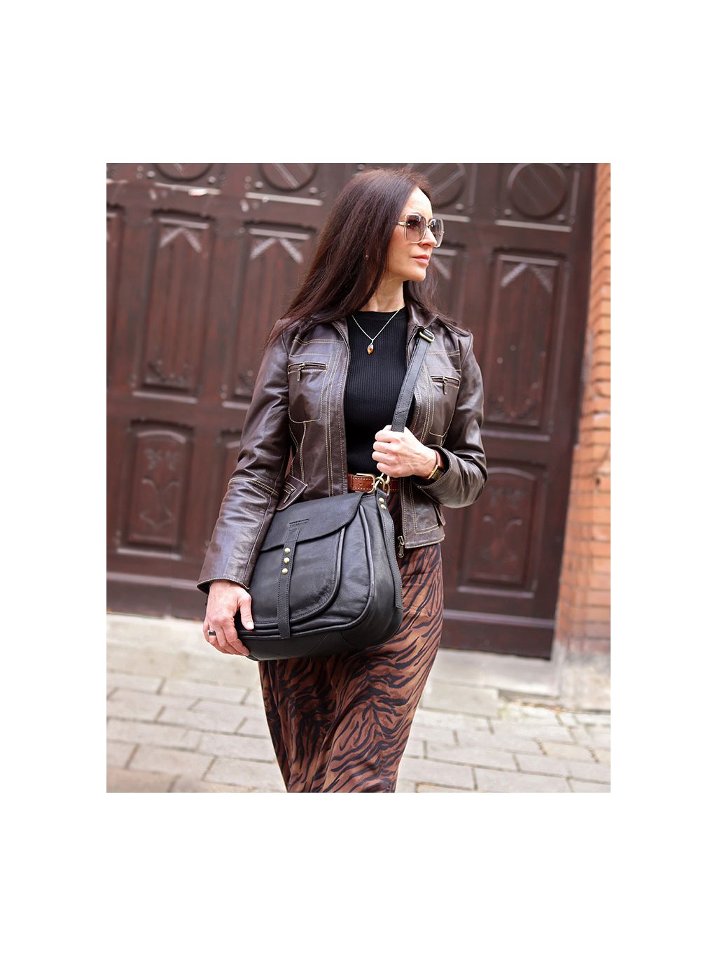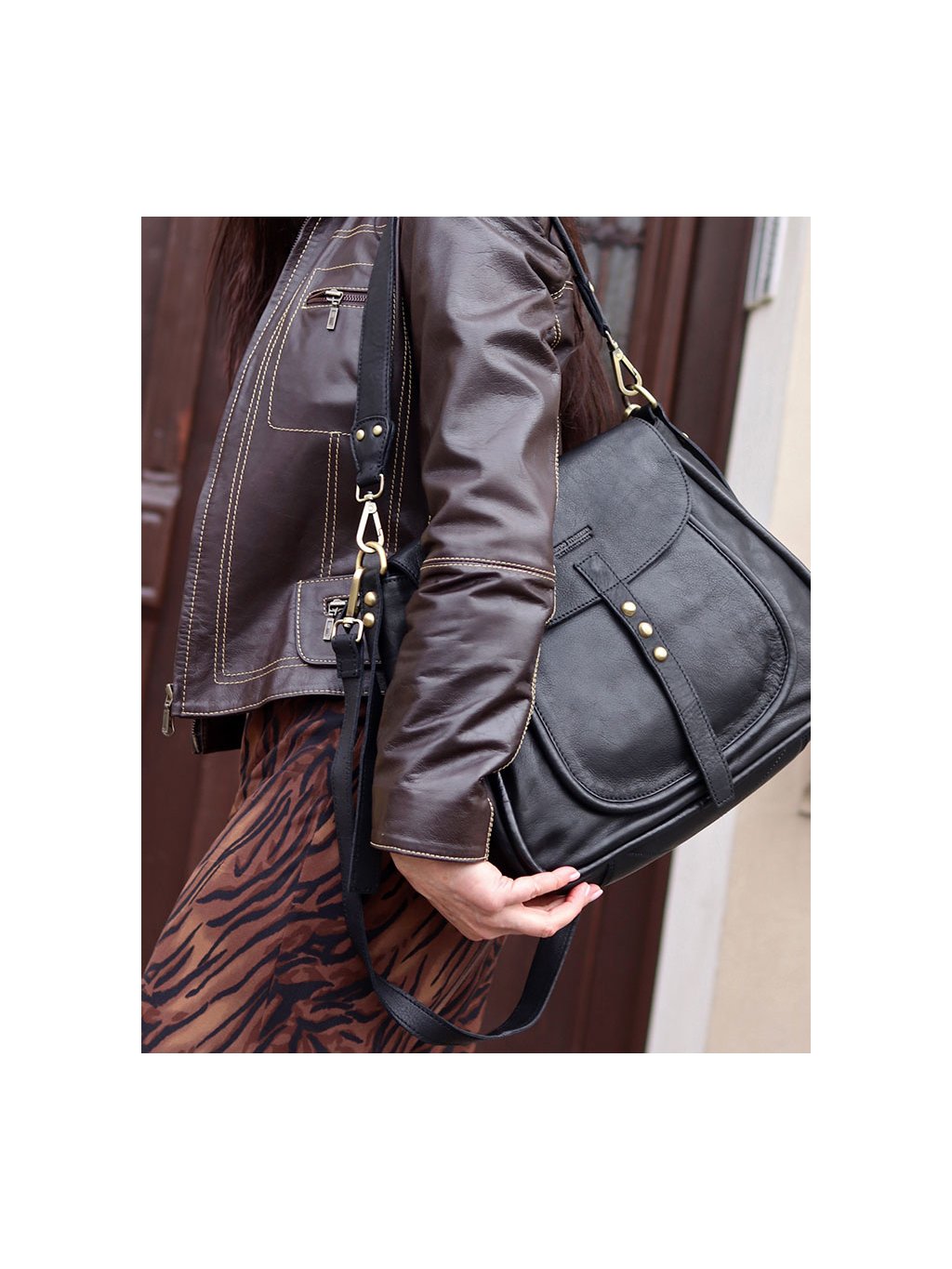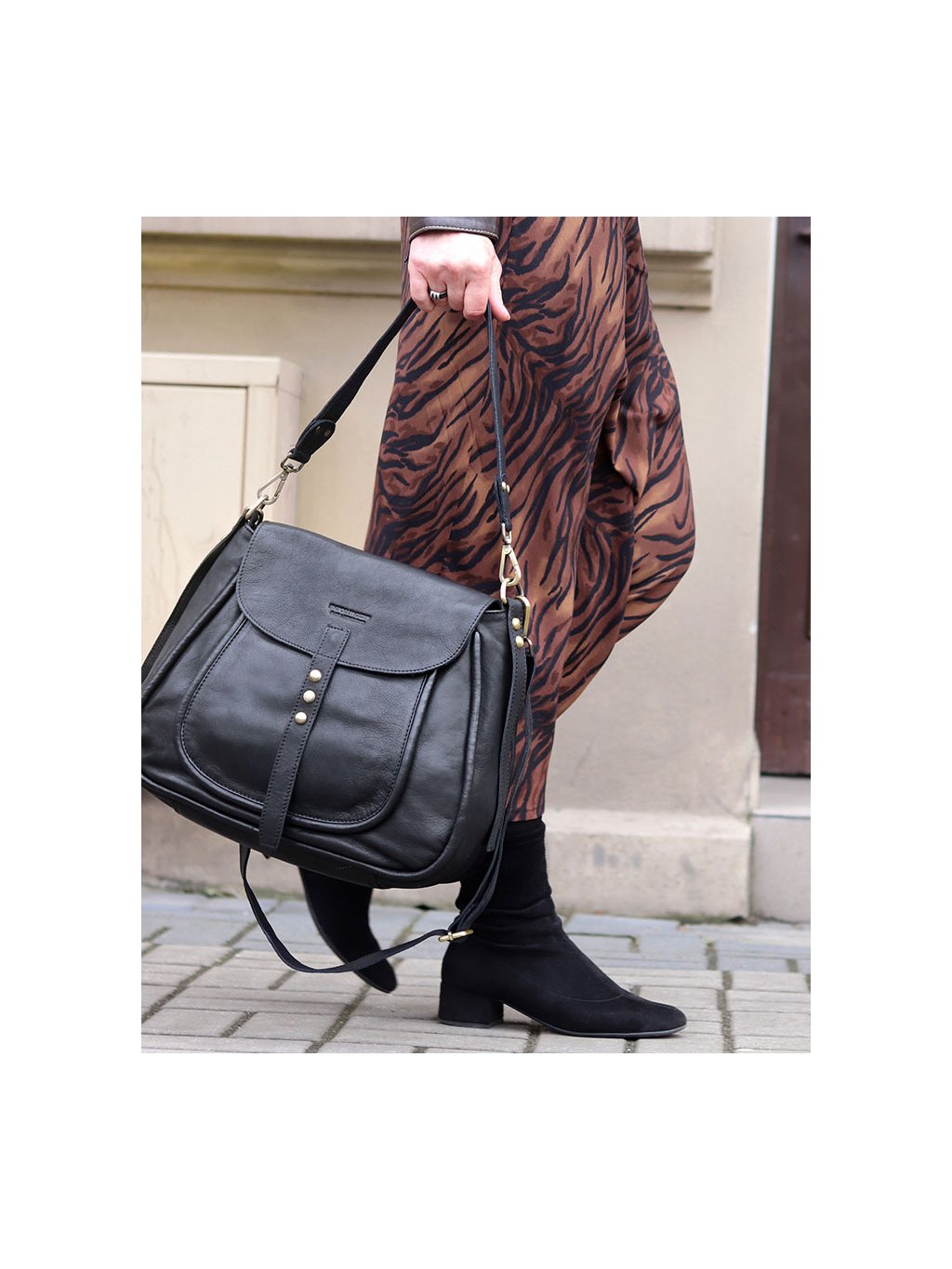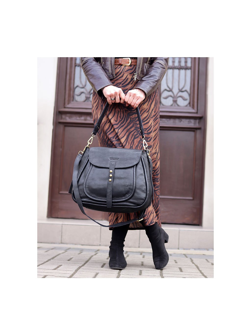 Stylová sedlová kabelka střední velikosti je ručně šitá z měkké přírodní kůže a zaujme nadčasovým tvarem inspirovaným klasickým jezdeckým stylem. Zavírání je řešeno klopou s magnetickým zapínáním, pod kterou se nachází zip pro bezpečné uzavření. Vnitřní prostor je podšitý bavlněnou podšívkou a vybaven třemi kapsami: jedna je na zip a dvě jsou otevřené. Další praktické kapsy se nacházejí zvenku pod klopou a na zadní straně kabelky. Model je doplněn o nastavitelný a odnímatelný popruh, který umožňuje nošení přes rameno i do kříže. Díky univerzálnímu formátu a preciznímu zpracování se hodí jak do práce, tak i na běžné nošení ve městě. Snadno ji sladíte s klasickým kabátem, sakem i volnějšími outfity.