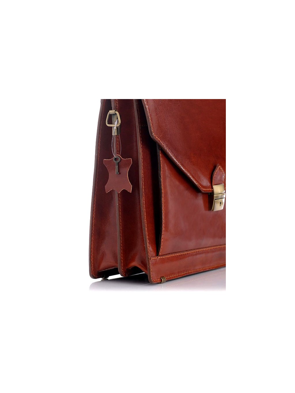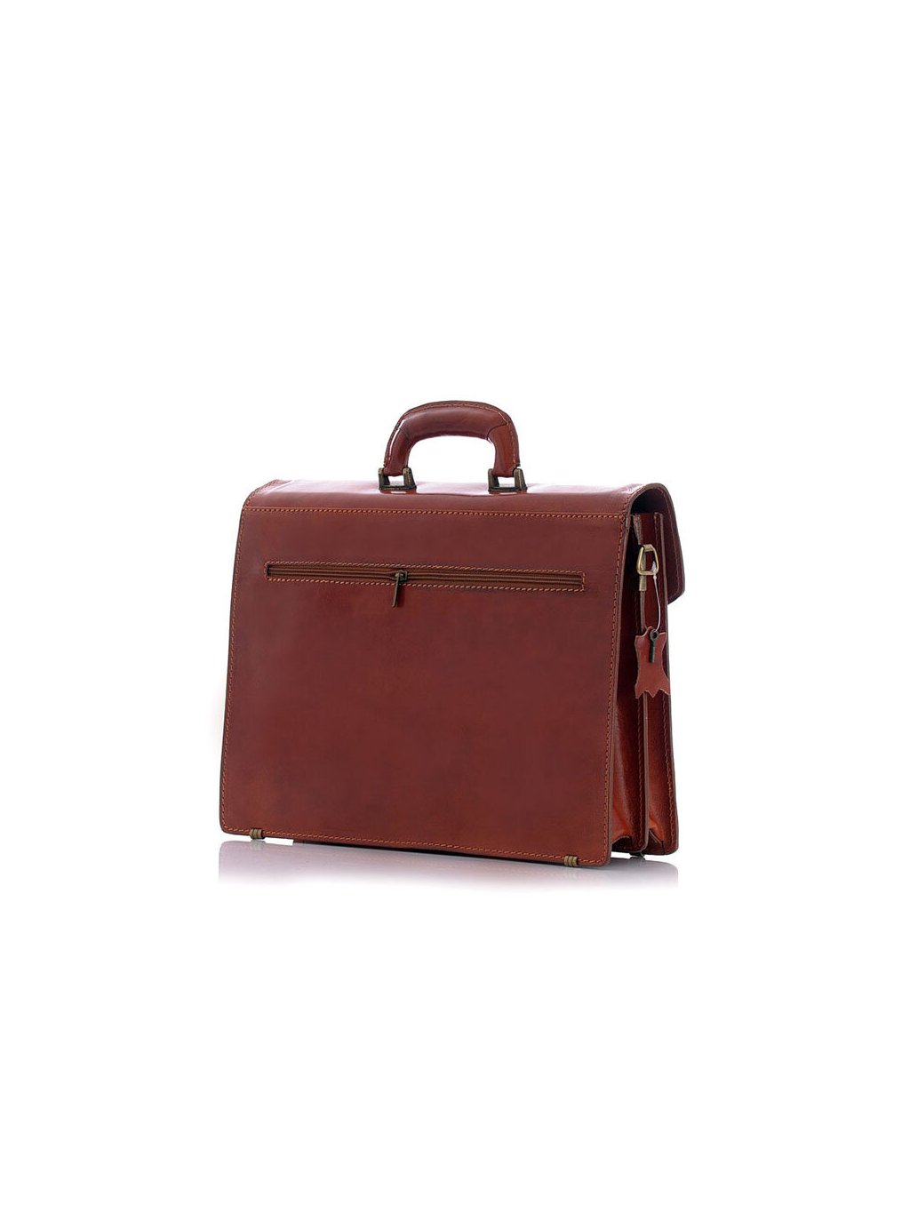 Elegantní pánská kožená aktovka ušitá z pravé hovězí kůže v klasickém střihu. Aktovka se uzavírá klopou s klasickým kovovým zapínáním na zámek. Uvnitř má aktovka dva samostatné fochy, které jsou rozděleny zipovou separaci. Nechybí přihrádka na kreditní karty, mobilní telefon a ani poutka na psací potřeby. Praktické kapsy kapsy na dokumenty jsou jak na přední, tak na zadní straně. Patičky chránící aktovku proti odření a odnímatelné poutko pro pohodlné nošení na rameni jsou u tohoto kousku samozřejmostí.