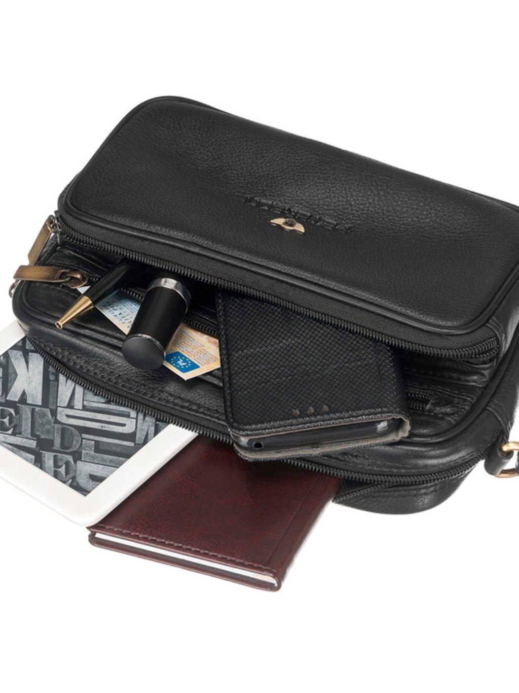 Elegantní pánské kožené etue vyrobené z měkké přírodní kůže je ideálním doplňkem pro každodenní použití. Hlavní prostor se uzavírá pevným zipem a spolehlivě pojme věci jako klíče mobil nebo peněženku. praktické kapsy na přední a zadní straně napomáhají organizaci celé tašky. Etue se dá nosit v ruce, ale obsahuje i praktický řemínek na zápěstí.