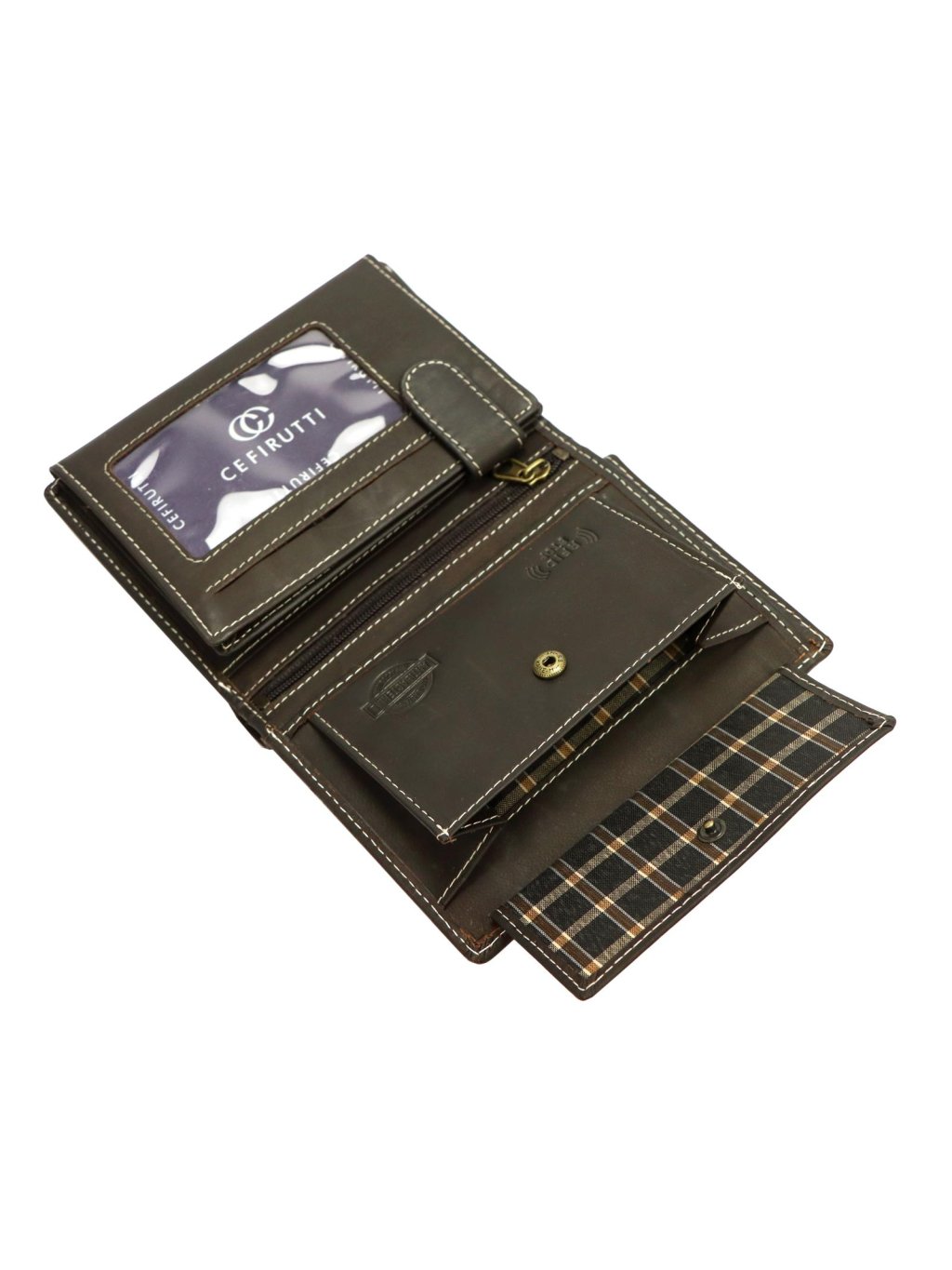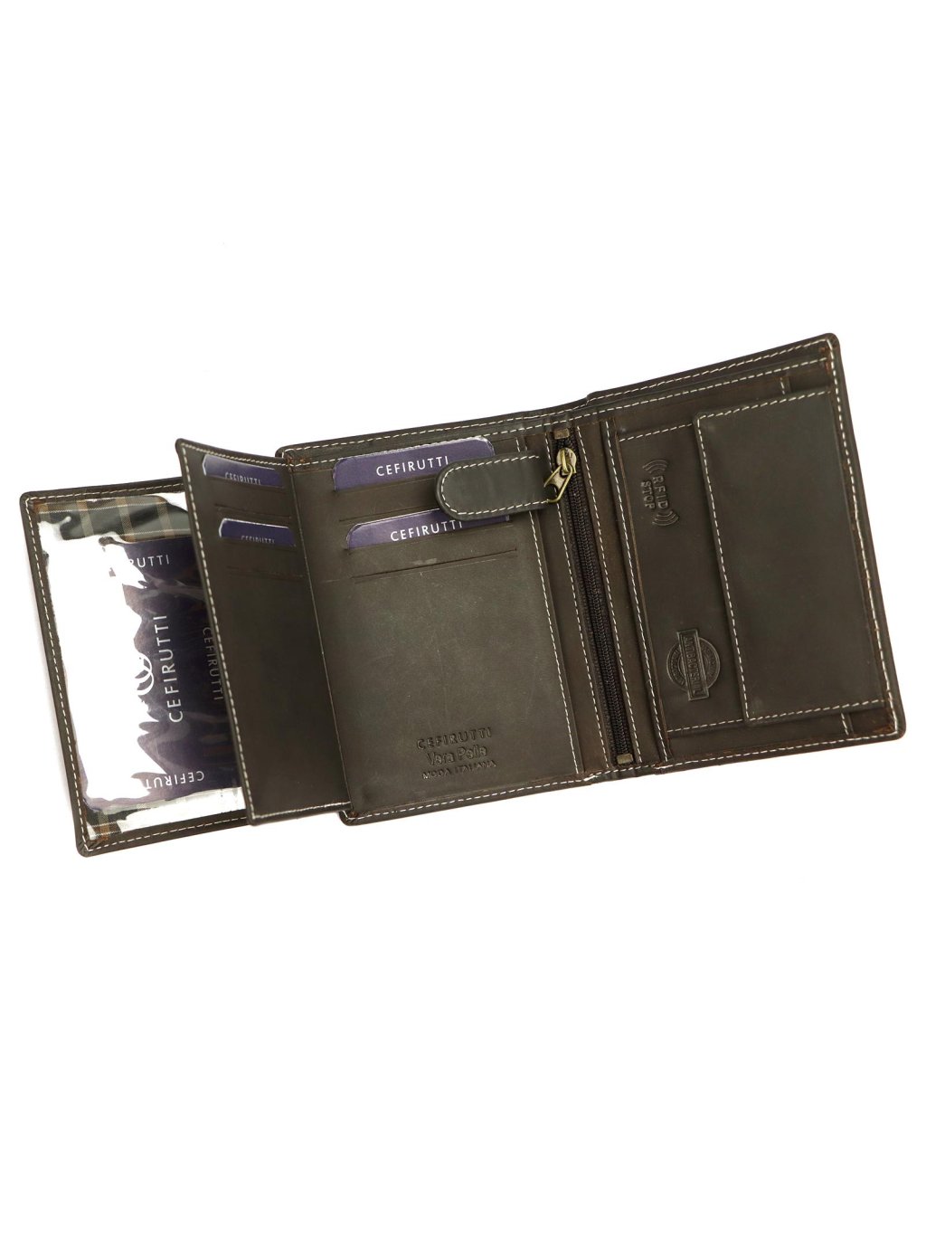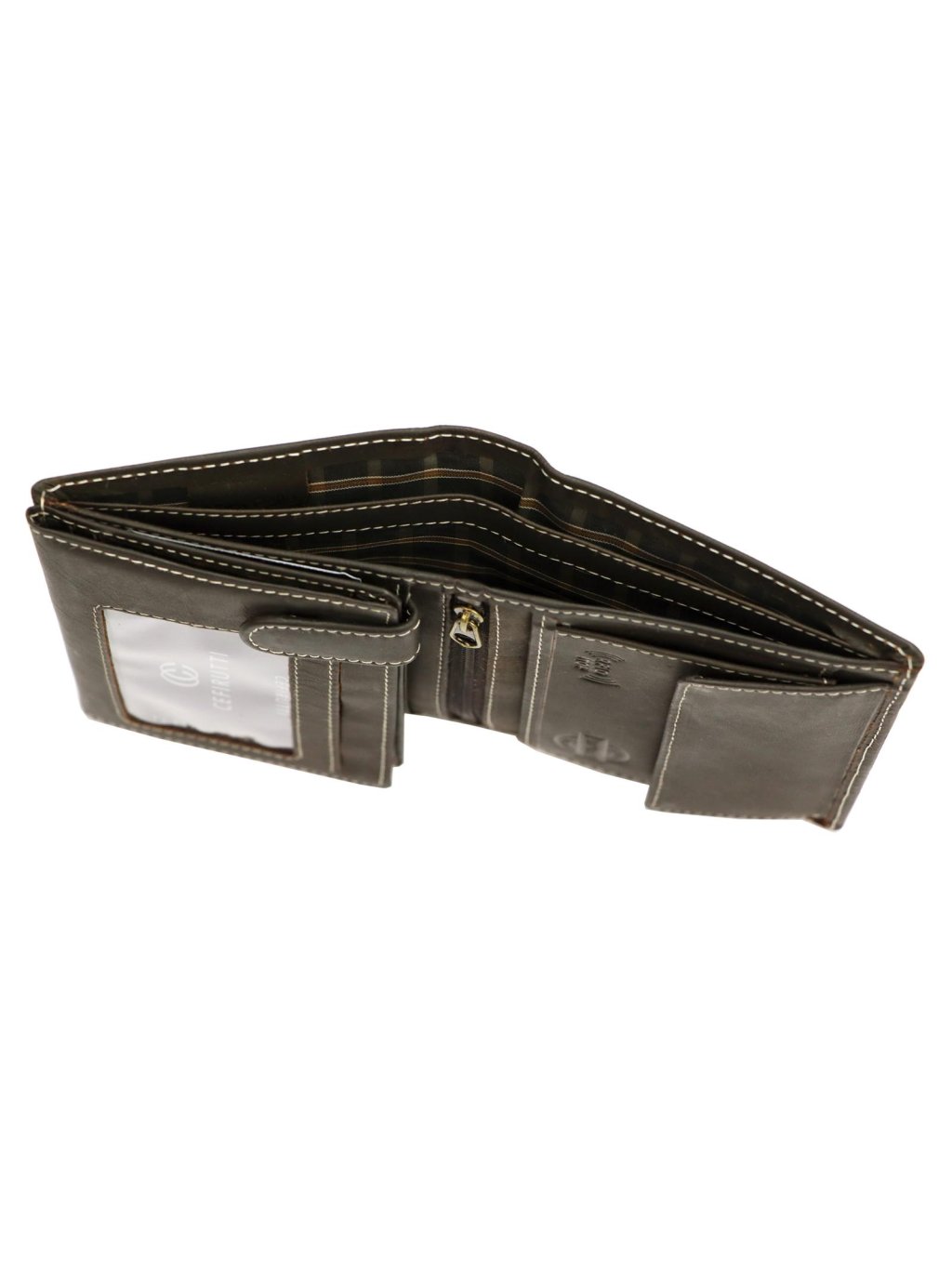 Pánská kožená na výšku orientovaná peněženka značky Cefirutti. Uvnitř peněženky najdete malou kapsičku na mince se zapínáním na druk, přihrádky na doklady, věrnostní karty a kreditní karty. V horní části peněženky jsou fochy na papírové bankovky, které jsou podšité látkovou podšívkou. Peněženka je ušita z kvalitní pravé kůže a po obvodu prošita silnou nití, což zvyšuje její odolnost.