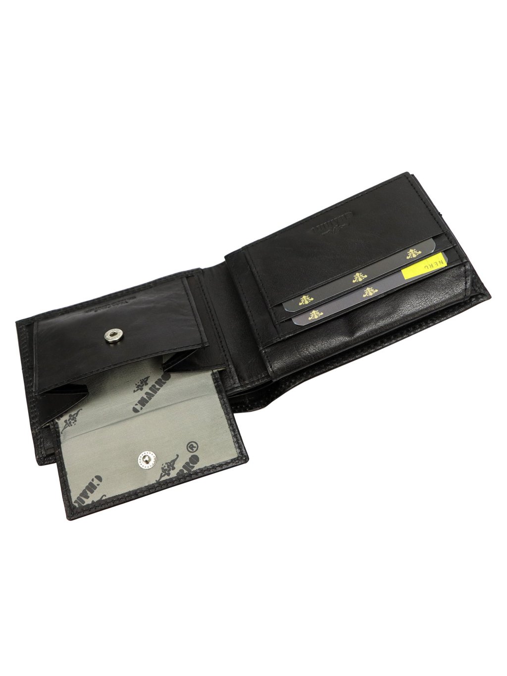 Pánská kožená na šířku orientovaná peněženka značky Charro. Uvnitř peněženky najdete malou kapsičku na mince se zapínáním na druk, přihrádky na doklady, věrnostní karty a kreditní karty. V horní části peněženky jsou fochy na papírové bankovky, které jsou podšité látkovou podšívkou. Peněženka je ušita z kvalitní pravé kůže a po obvodu prošita silnou nití, což zvyšuje její odolnost.