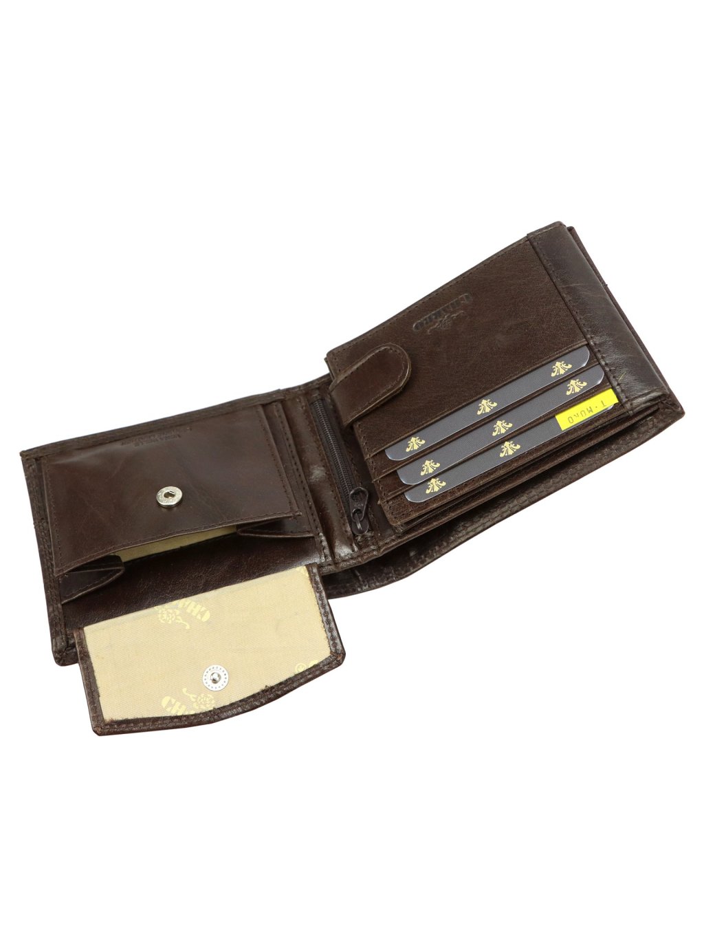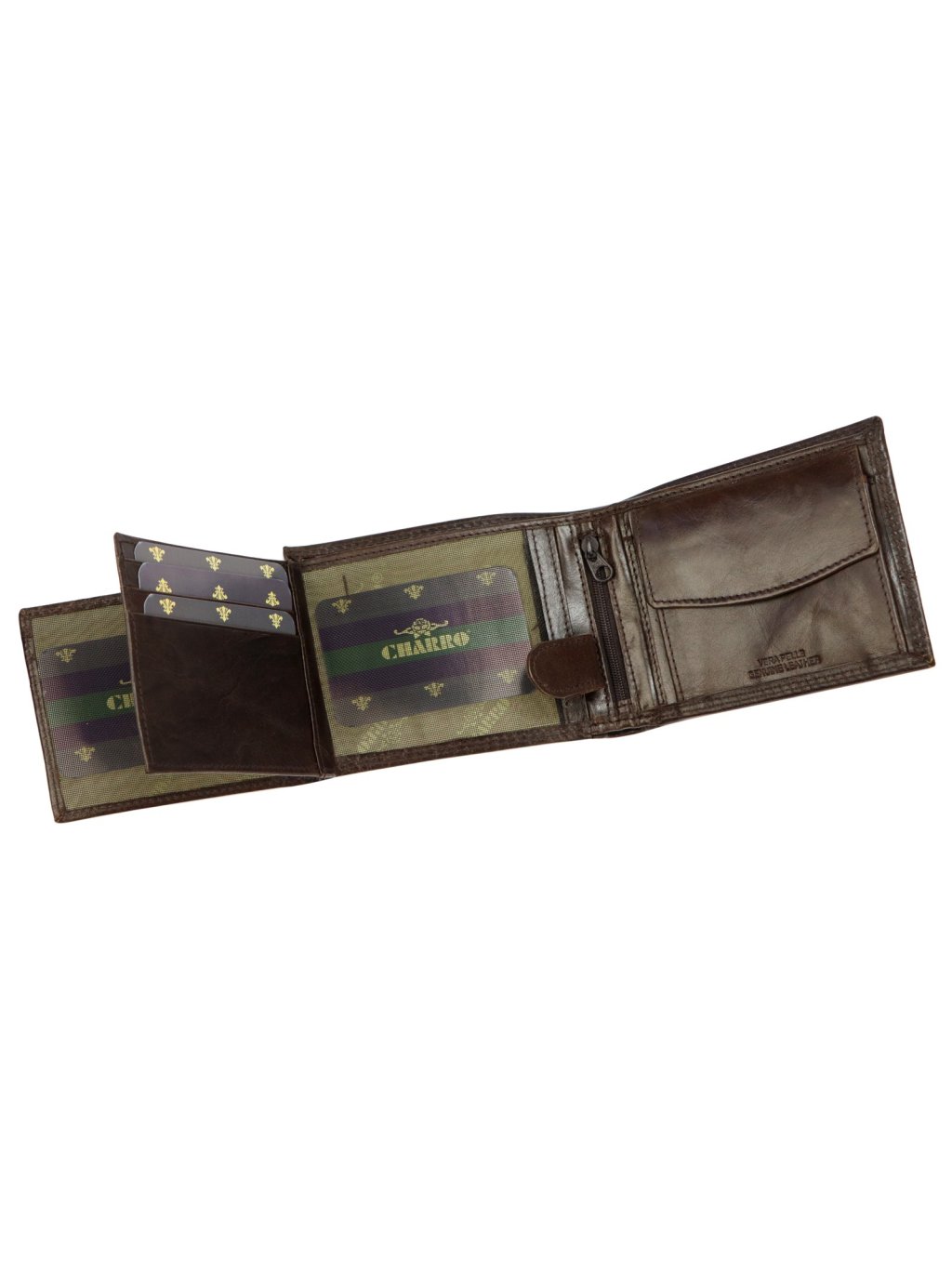 Pánská kožená na šířku orientovaná peněženka značky Charro. Uvnitř peněženky najdete malou kapsičku na mince se zapínáním na druk, přihrádky na doklady, věrnostní karty a kreditní karty. V horní části peněženky jsou fochy na papírové bankovky, které jsou podšité látkovou podšívkou. Peněženka je ušita z kvalitní pravé kůže a po obvodu prošita silnou nití, což zvyšuje její odolnost.