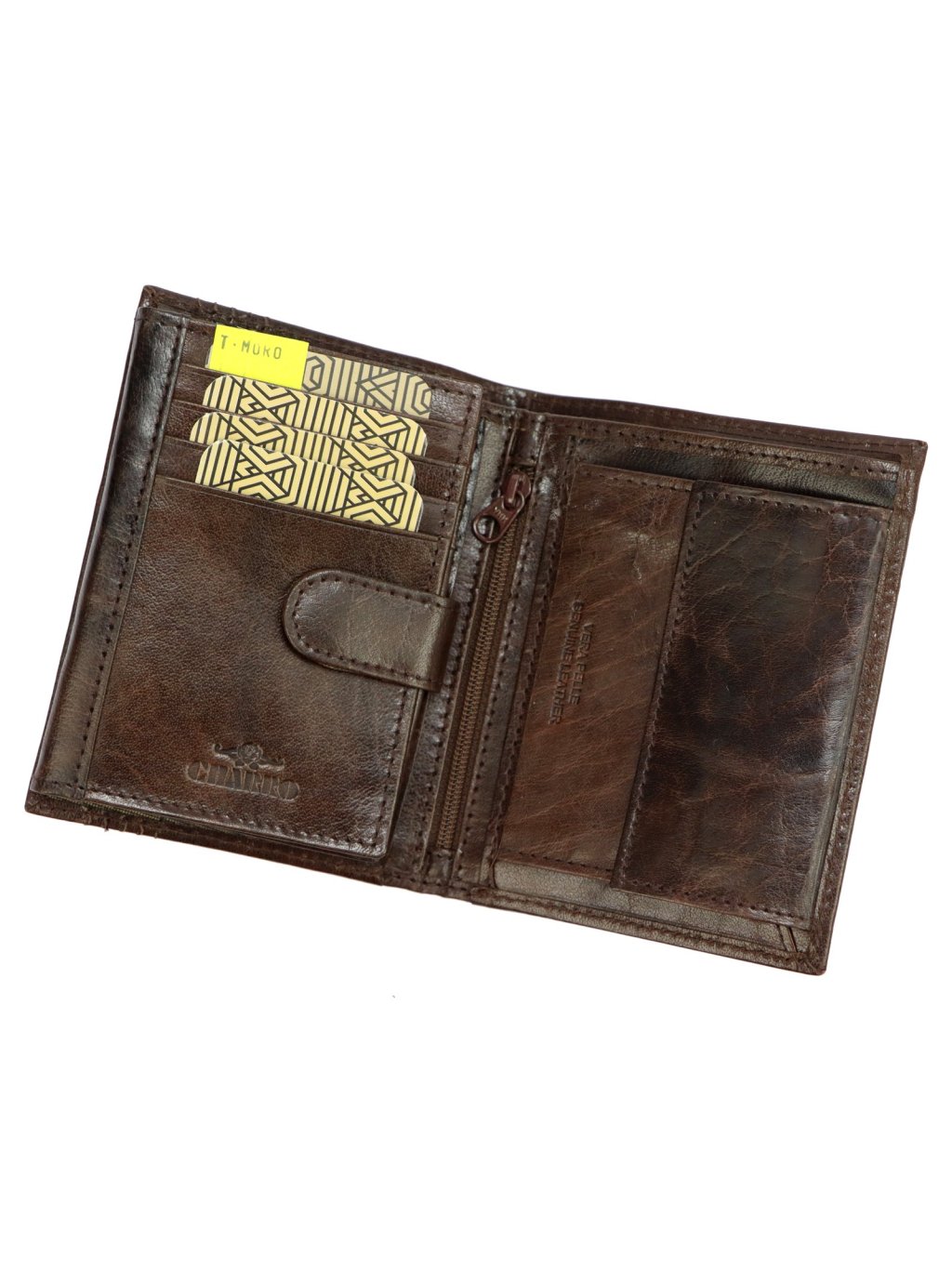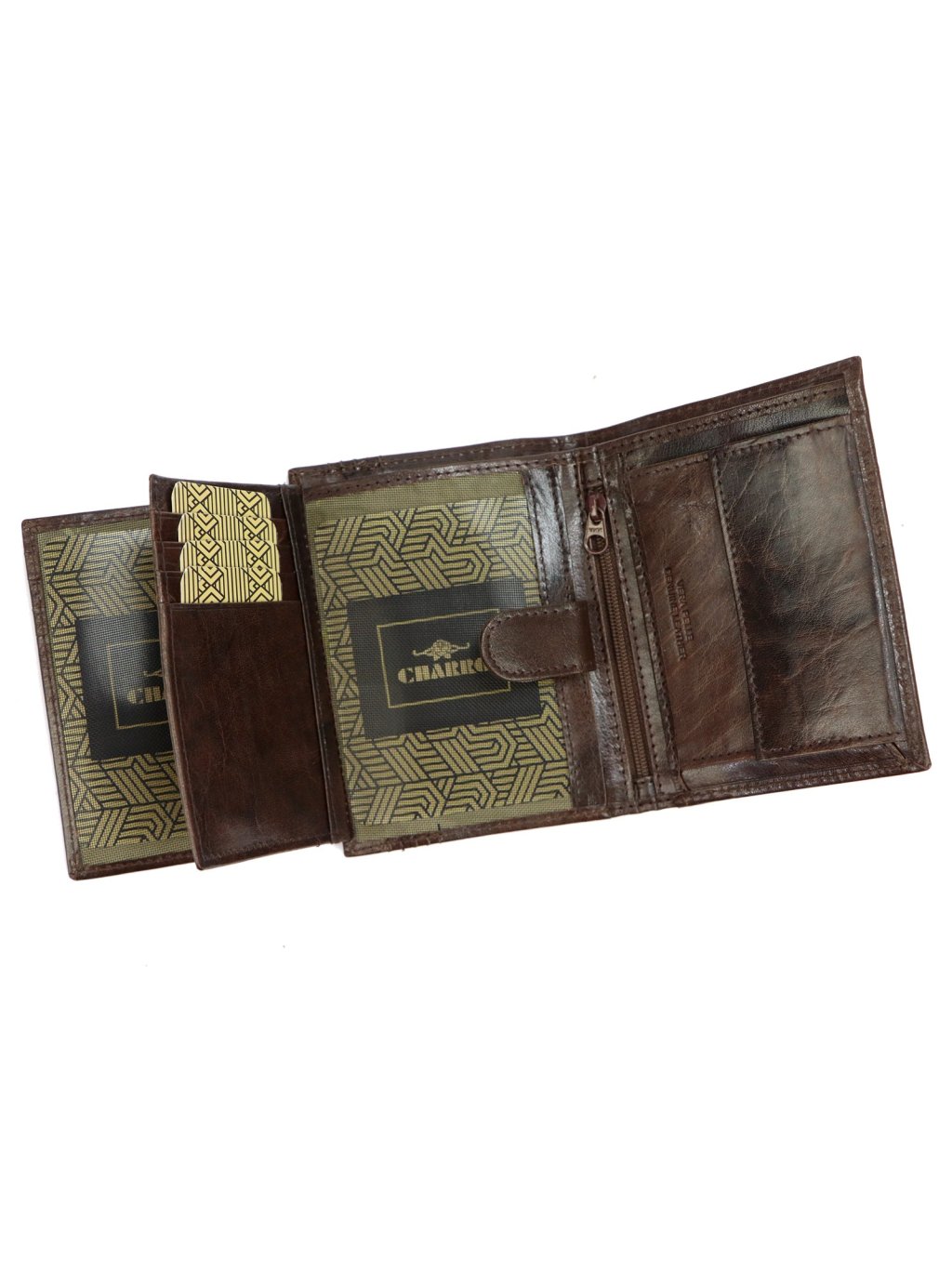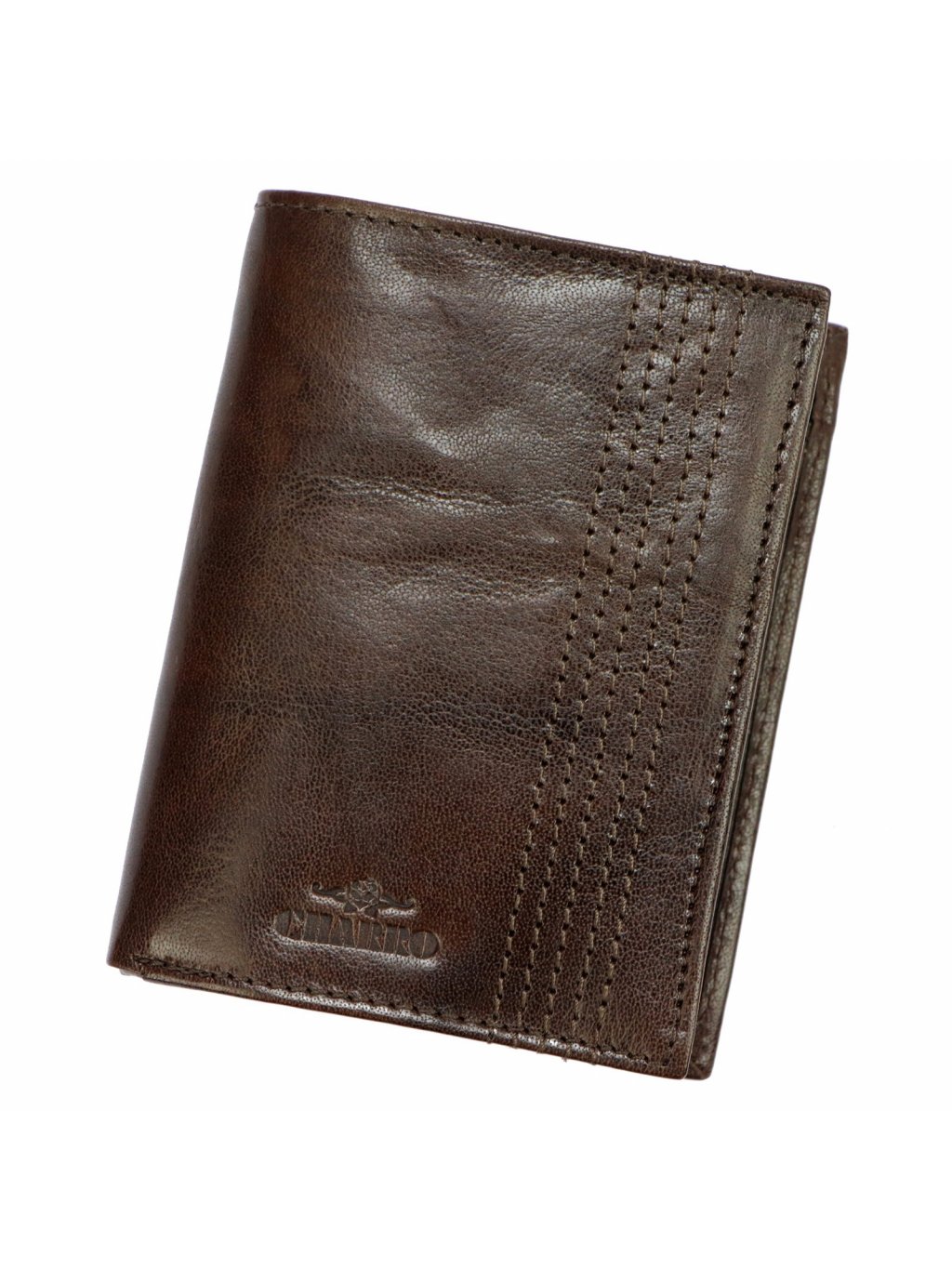 Pánská kožená na výšku orientovaná peněženka značky Charro. Uvnitř peněženky najdete malou kapsičku na mince se zapínáním na druk, přihrádky na doklady, věrnostní karty a kreditní karty. V horní části peněženky jsou fochy na papírové bankovky, které jsou podšité látkovou podšívkou. Peněženka je ušita z kvalitní pravé kůže a po obvodu prošita silnou nití, což zvyšuje její odolnost.