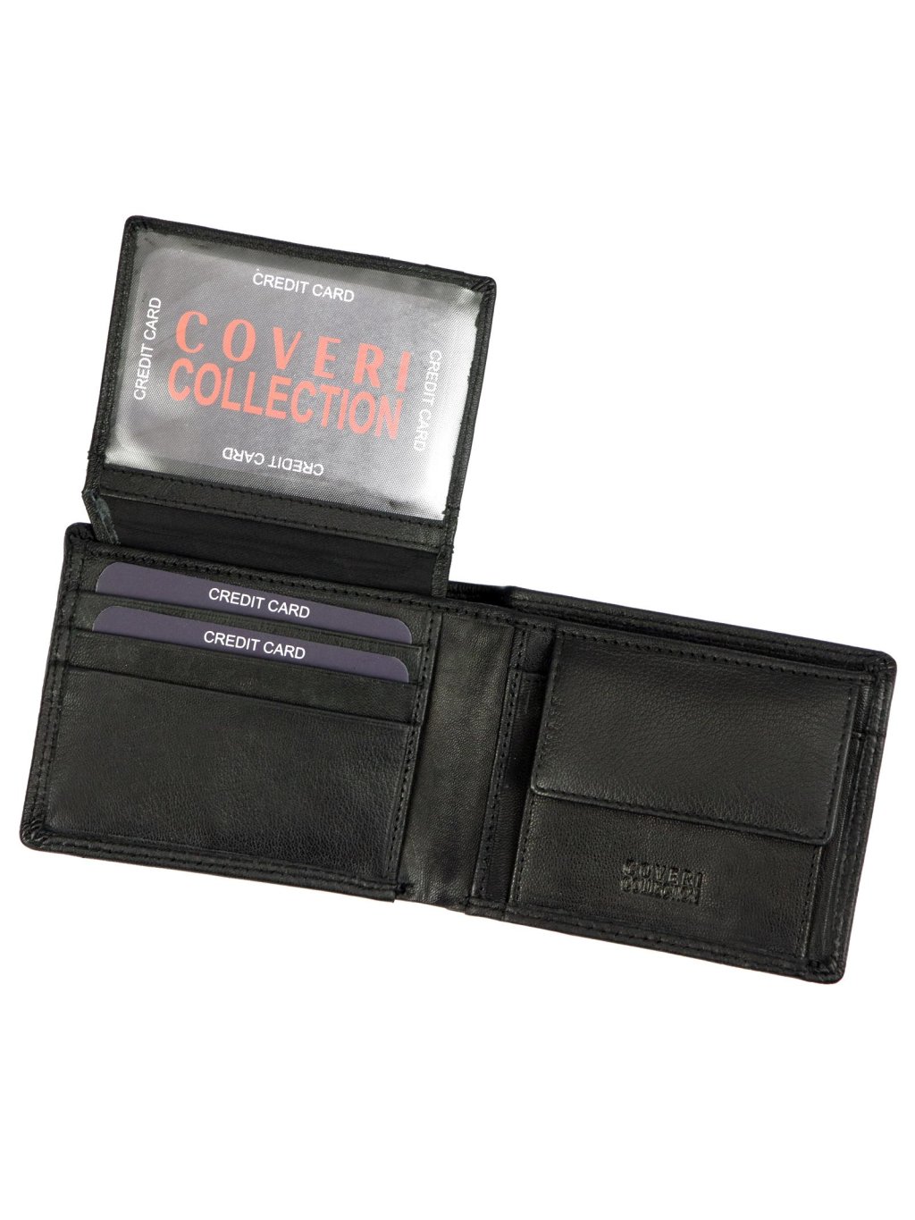 Elegantní pánská kožená peněženka značky Coveri. Uvnitř peněženky najdete drukem uzavíratelnou kapsičku na drobné mince, přihrádky na doklady, věrnostní karty i platební karty. Fochy na papírové bankovky jsou podšité látkovou podšívkou. Peněženka je ušitá z kvalitní přírodní kůže a je po obvodu prošitá pevnou nití, což zvyšuje její životnost.