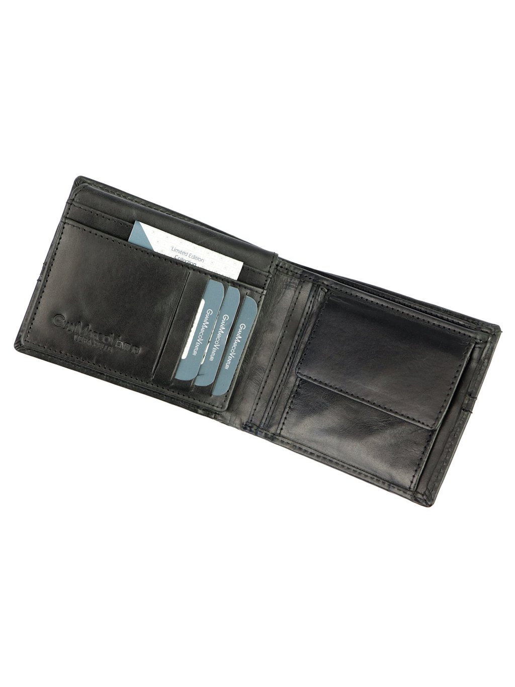Pánská kožená na šířku orientovaná peněženka značky Gian Marco Venturi. Uvnitř peněženky najdete malou kapsičku na mince se zapínáním na druk, přihrádky na doklady, věrnostní karty a kreditní karty. V horní části peněženky jsou fochy na papírové bankovky, které jsou podšité látkovou podšívkou. Peněženka je ušita z kvalitní pravé kůže a po obvodu prošita silnou nití, což zvyšuje její odolnost.