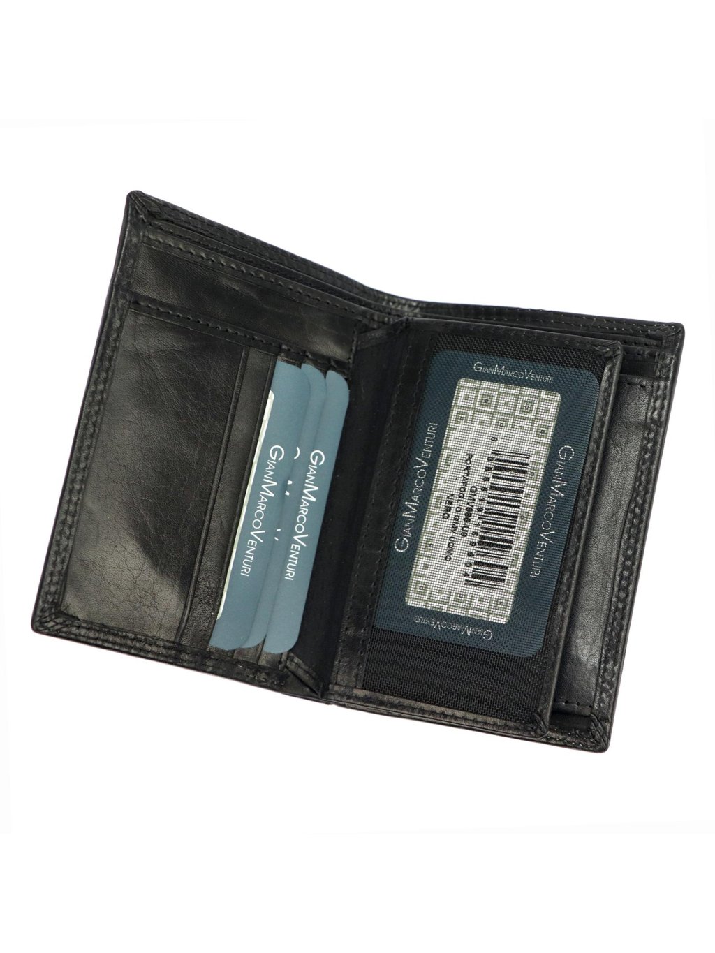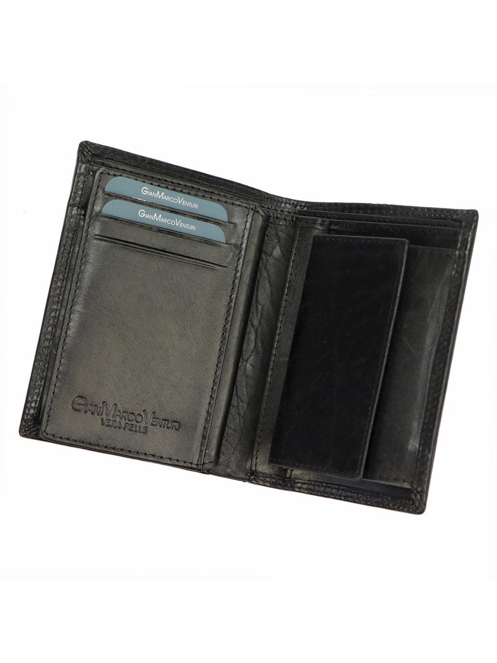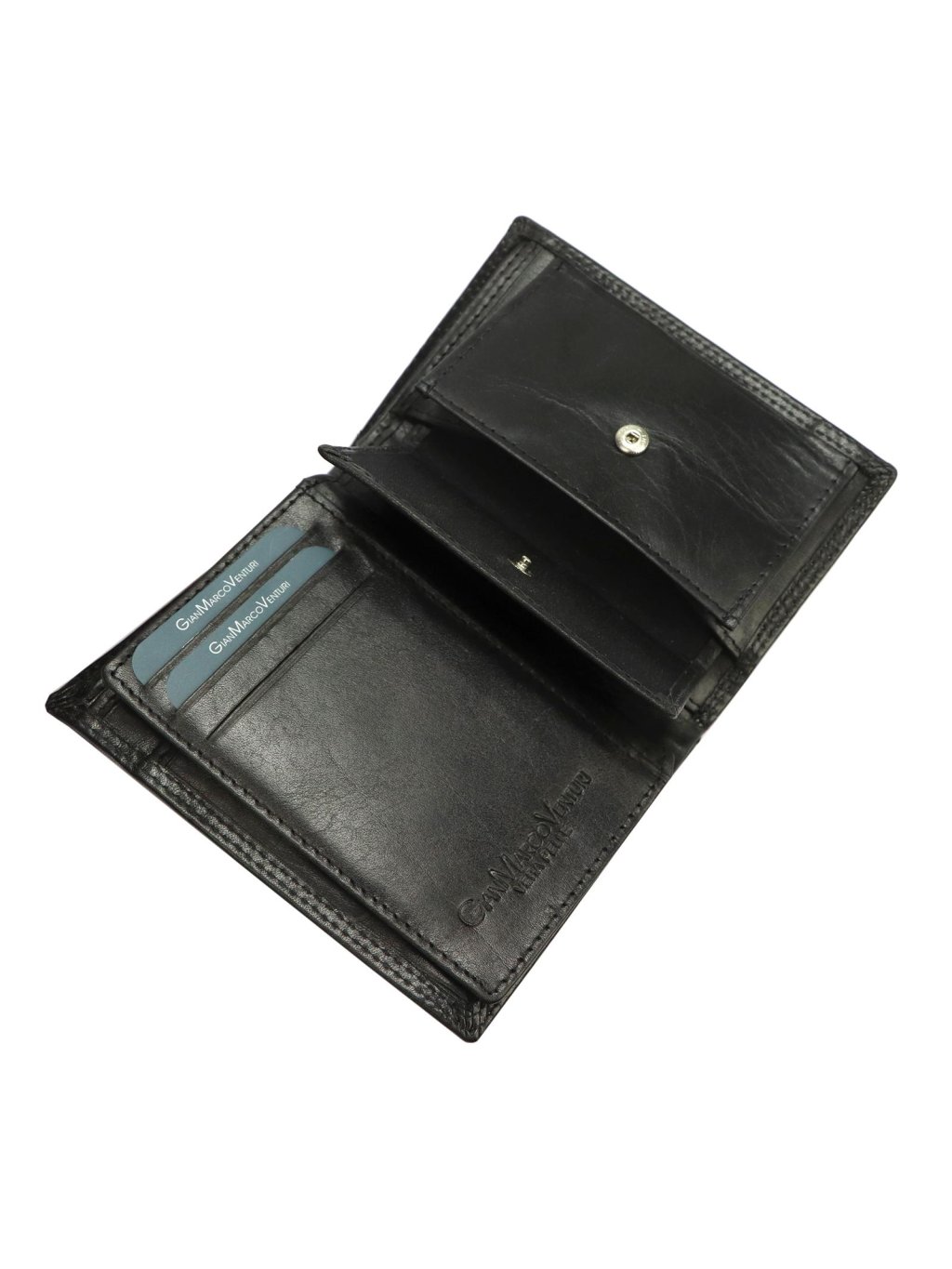 Pánská kožená na výšku orientovaná peněženka značky Gian Marco Venturi. Uvnitř peněženky najdete malou kapsičku na mince se zapínáním na druk, přihrádky na doklady, věrnostní karty a kreditní karty. V horní části peněženky jsou fochy na papírové bankovky, které jsou podšité látkovou podšívkou. Peněženka je ušita z kvalitní pravé kůže a po obvodu prošita silnou nití, což zvyšuje její odolnost.