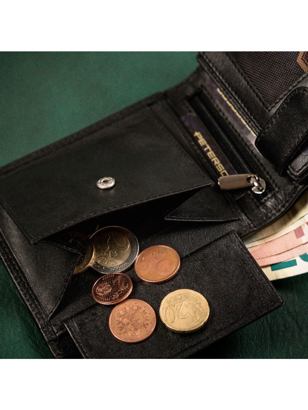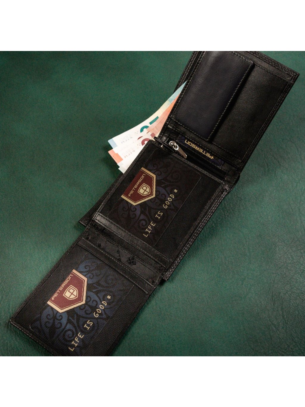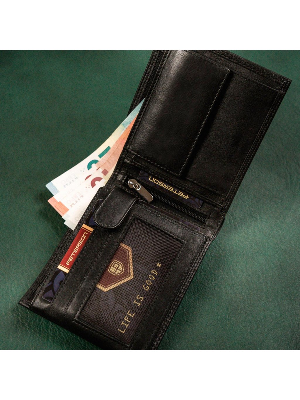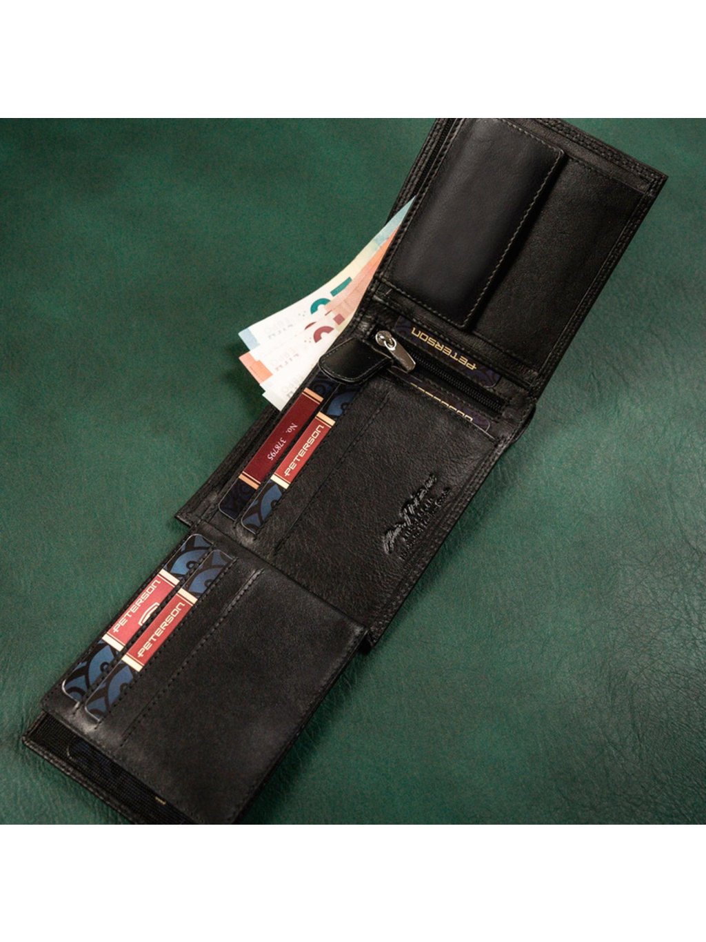 Pánská kožená na šířku orientovaná peněženka značky Peterson. Uvnitř peněženky najdete kapsičku na mince se zapínáním na druk, přihrádky na doklady, věrnostní i kreditní malou karty. V horní části peněženky jsou fochy na papírové bankovky, které jsou podšité látkovou podšívkou. Peněženka je ušita z kvalitní pravé kůže a po obvodu prošita silnou nití, což zvyšuje její odolnost.