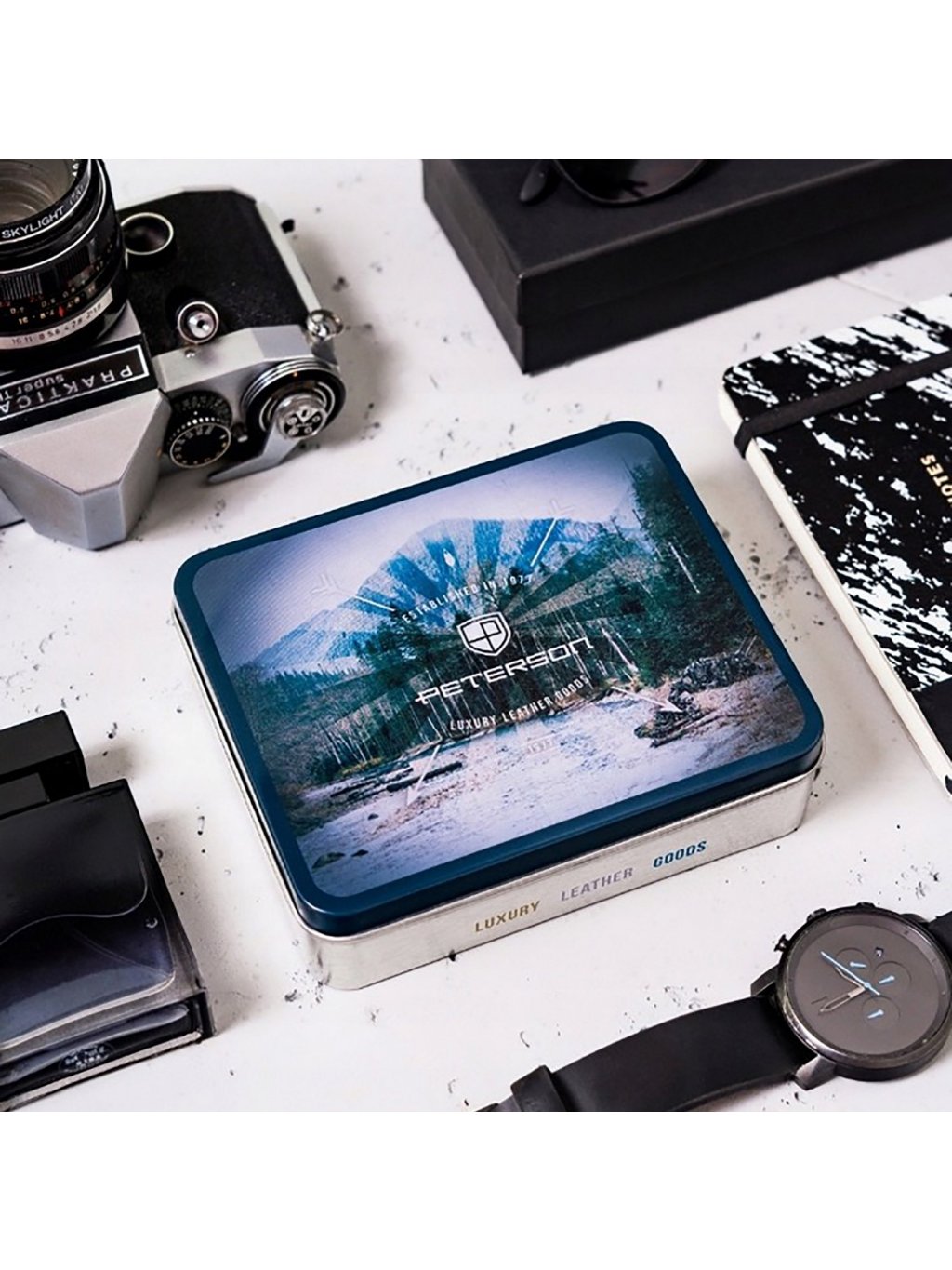 Pánská kožená na výšku orientovaná peněženka značky Peterson. Uvnitř peněženky najdete malou kapsičku na mince se zapínáním na druk, přihrádky na doklady, věrnostní i kreditní karty. V horní části peněženky jsou fochy na papírové bankovky, které jsou podšité látkovou podšívkou. Peněženka je ušita z kvalitní pravé kůže a po obvodu prošita silnou nití, což zvyšuje její odolnost. Peněženka je dodávaná v hliníkové krabičce, díky které se z ní může stát úžasný dárek.