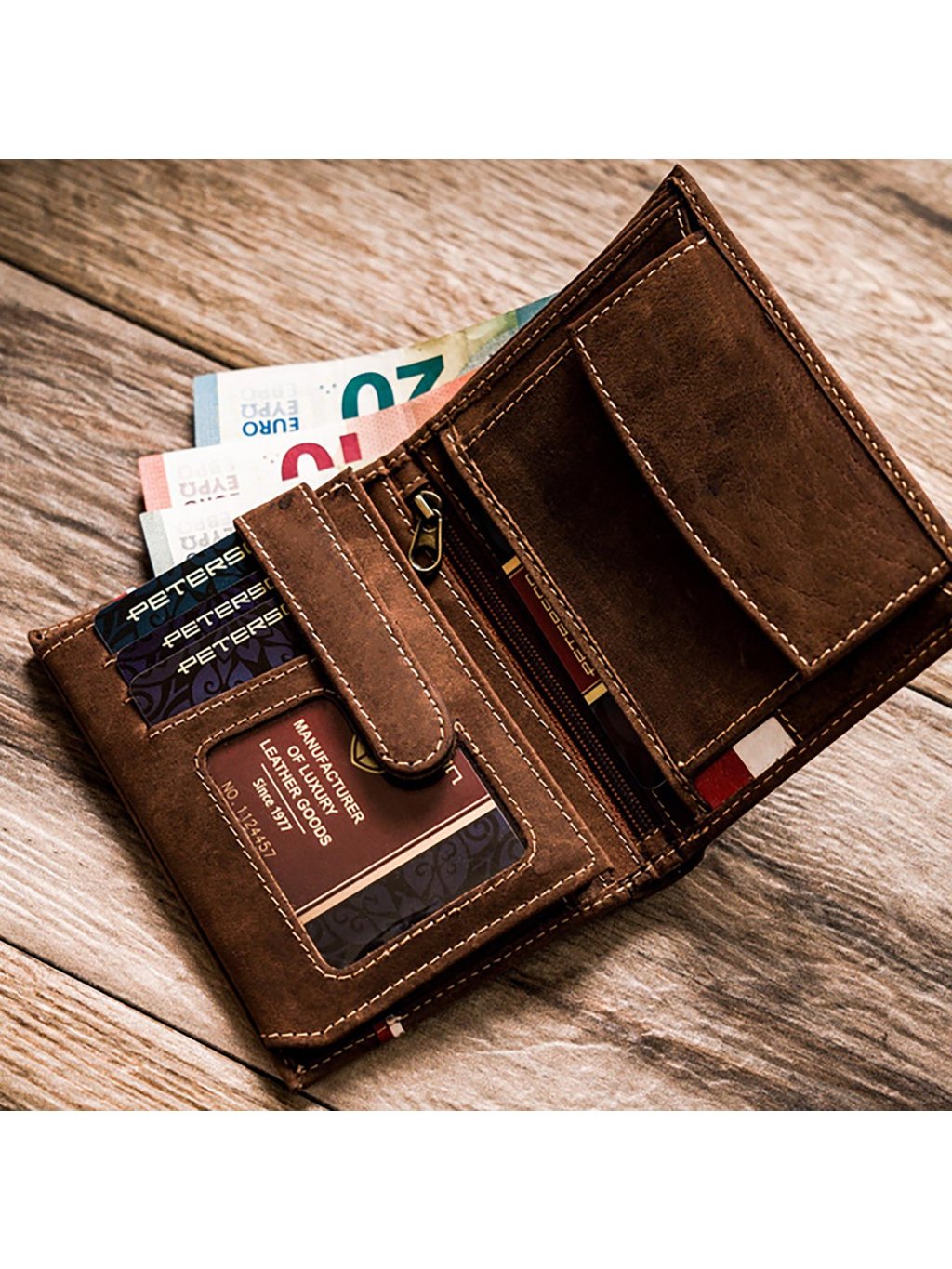 Elegantní pánská na výšku, orientovaná peněženka ušitá z pravé kůže, nabízí kombinaci klasického designu s praktičnosti. Uvnitř peněženky se nachází malý mincovník na drobné mince se zapínáním na patentku. V další části najdete přihrádky na doklady, věrnostní i kreditní karty. V horní části peněženky jsou fochy na papírové bankovky, podšité látkovou podšívkou.