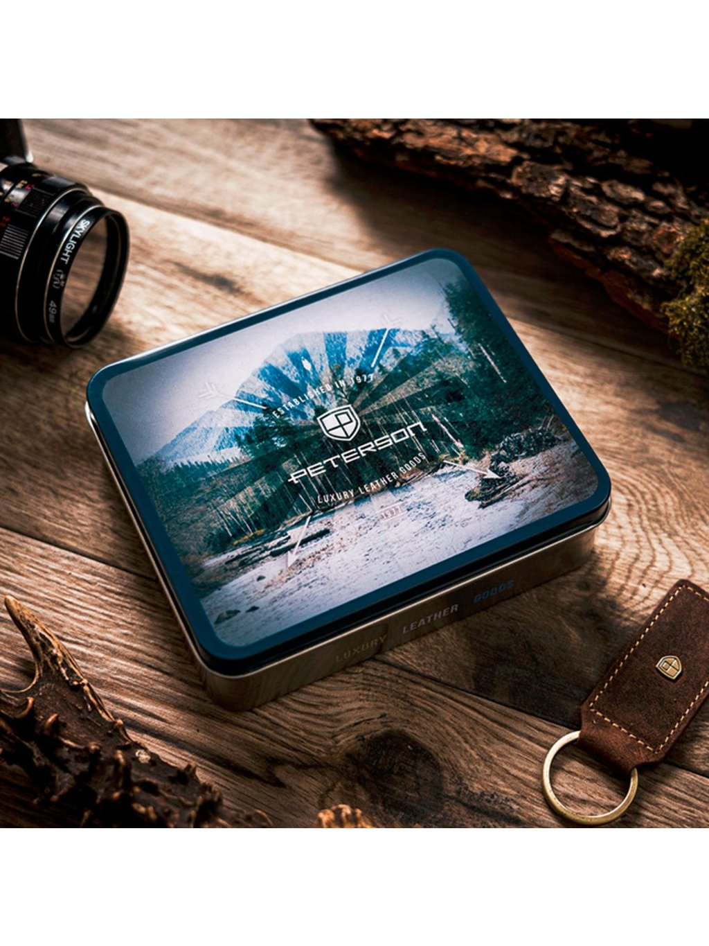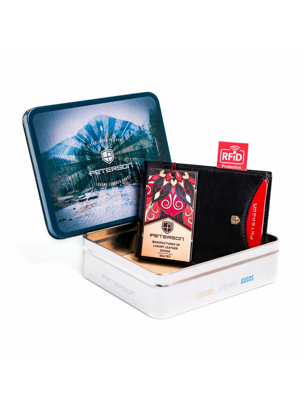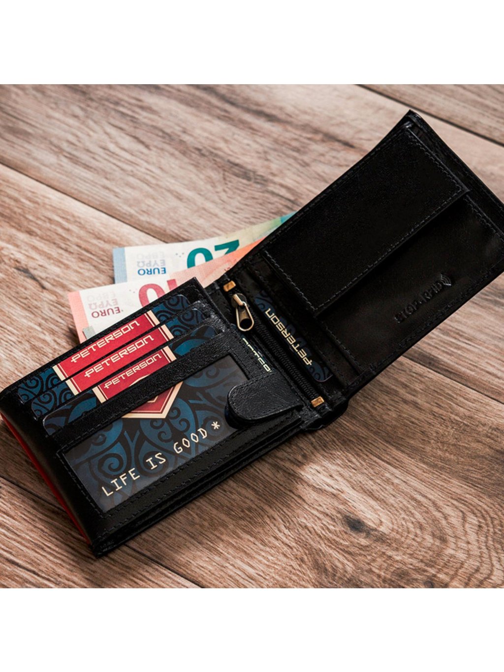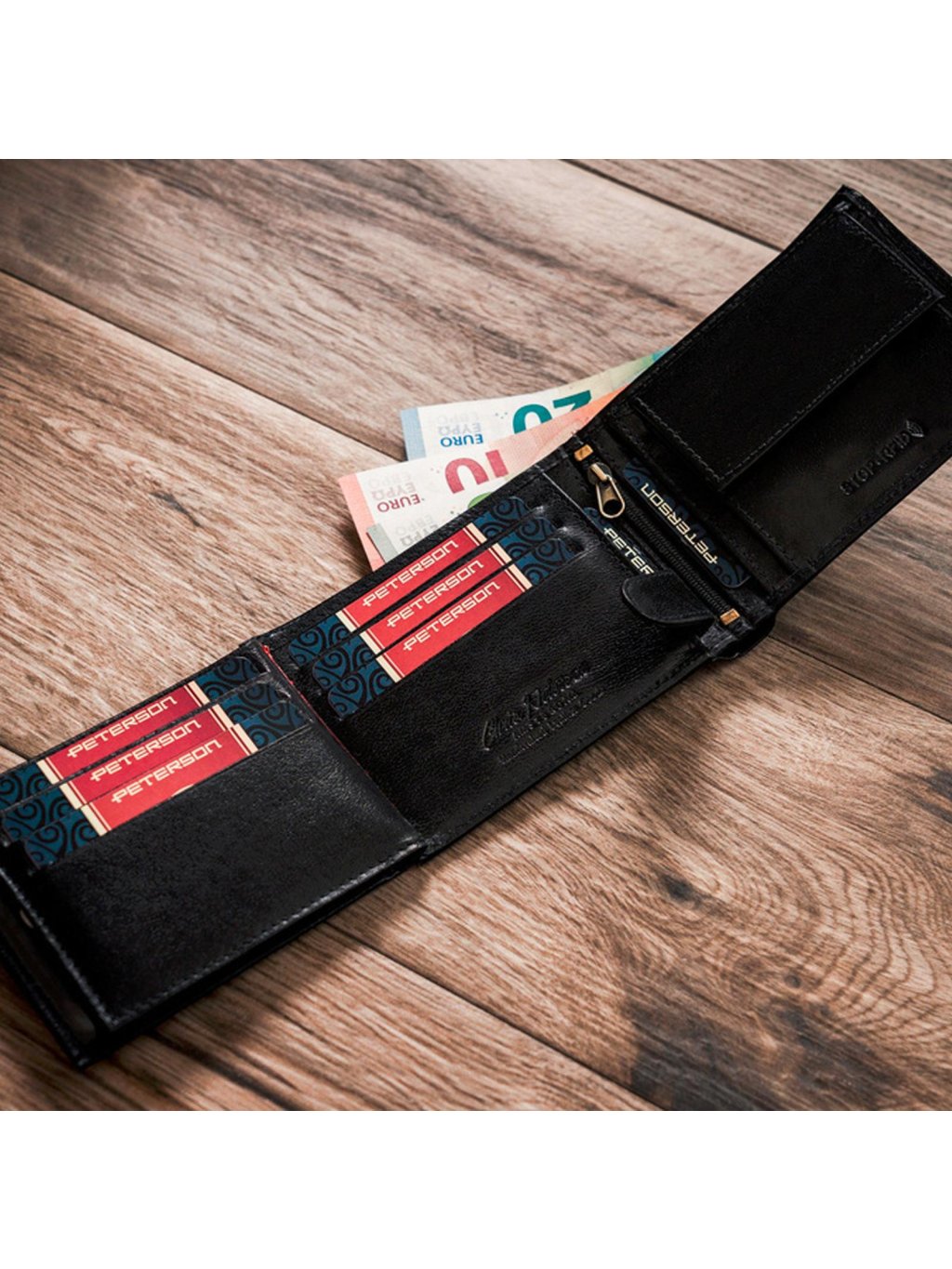 Pánská kožená na šířku orientovaná peněženka značky Peterson. Uvnitř peněženky najdete malou kapsičku na mince se zapínáním na druk či zip, přihrádky na doklady, věrnostní karty a kreditní karty. V horní části peněženky jsou fochy na papírové bankovky, které jsou podšité látkovou podšívkou. Peněženka je ušita z kvalitní pravé kůže a po obvodu prošita silnou nití, což zvyšuje její odolnost.