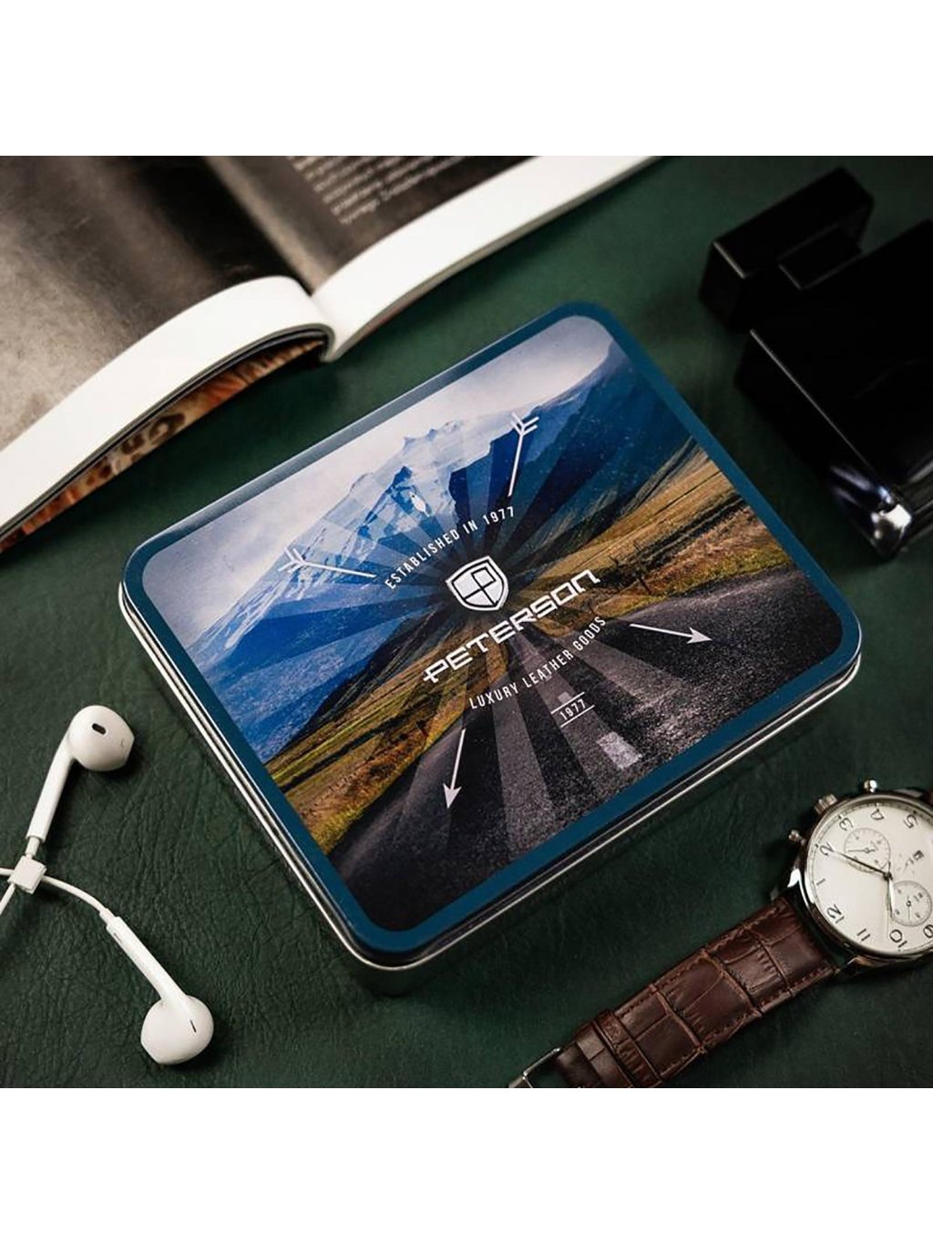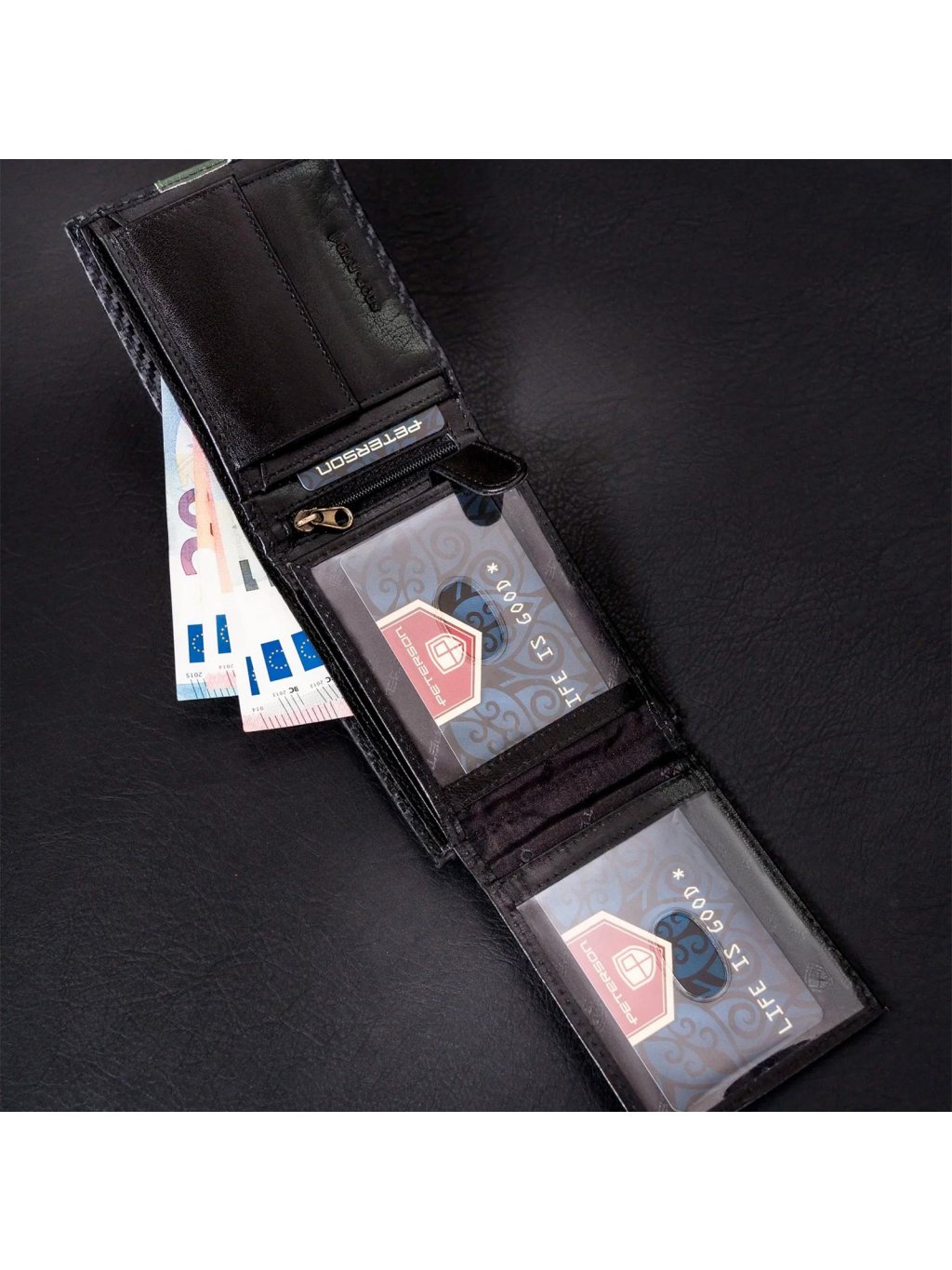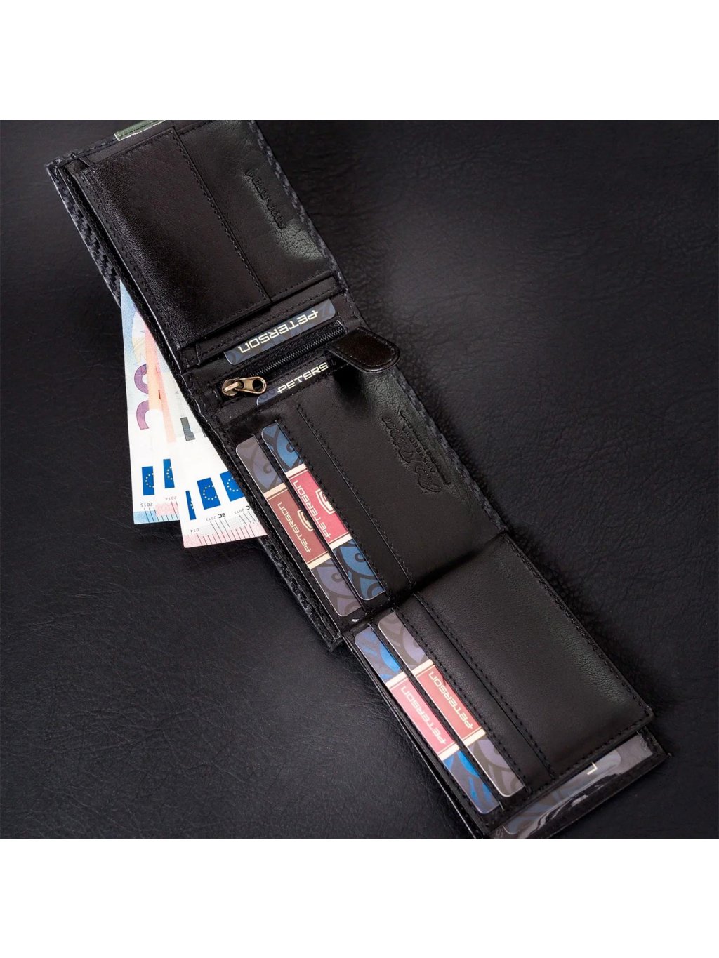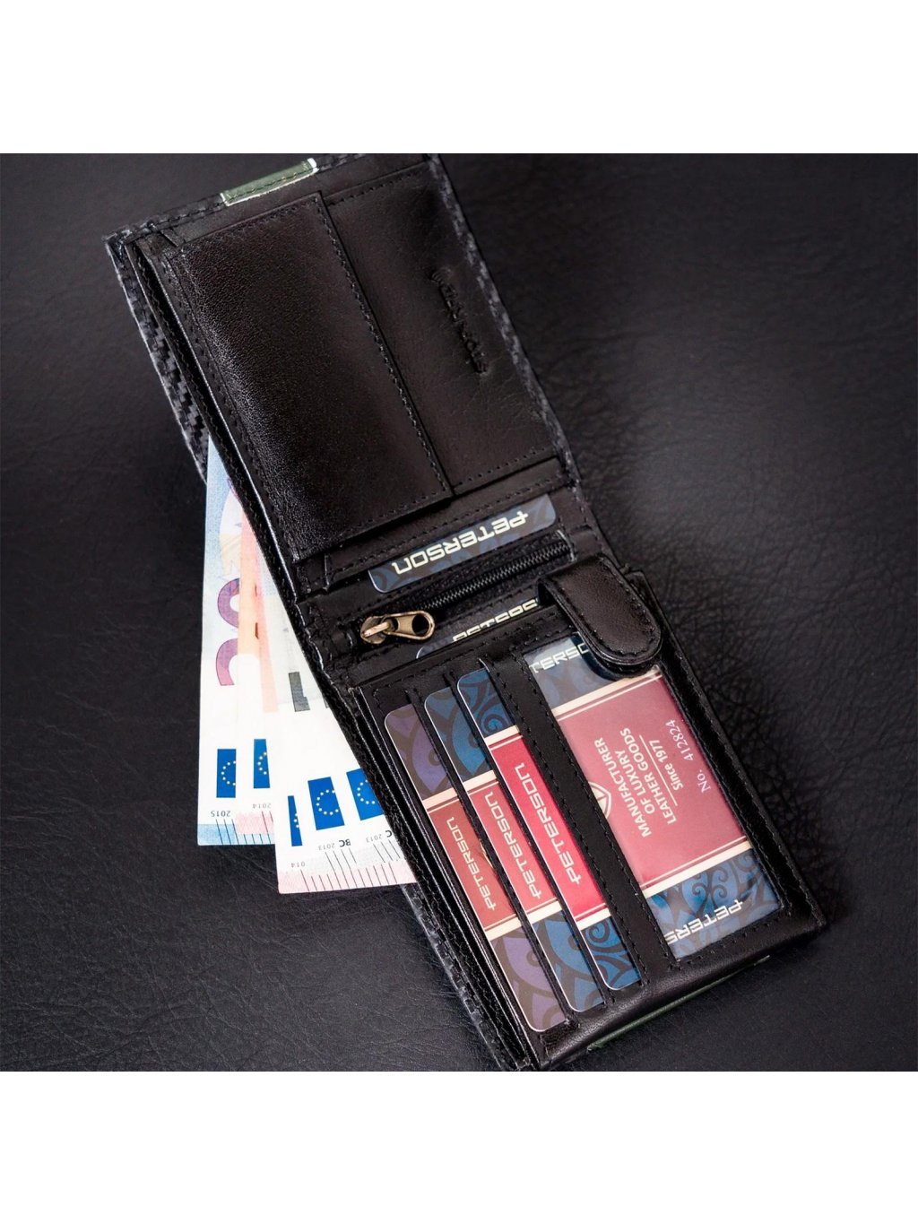 Pánská kožená na šířku orientovaná peněženka značky Peterson. Uvnitř peněženky najdete kapsičku na mince se zapínáním na druk, přihrádky na doklady, věrnostní i kreditní malou karty. V horní části peněženky jsou fochy na papírové bankovky, které jsou podšité látkovou podšívkou. Peněženka je ušita z kvalitní pravé kůže a po obvodu prošita silnou nití, což zvyšuje její odolnost. Peněženka je dodávaná v hliníkové krabičce, díky které se z ní může stát úžasný dárek.