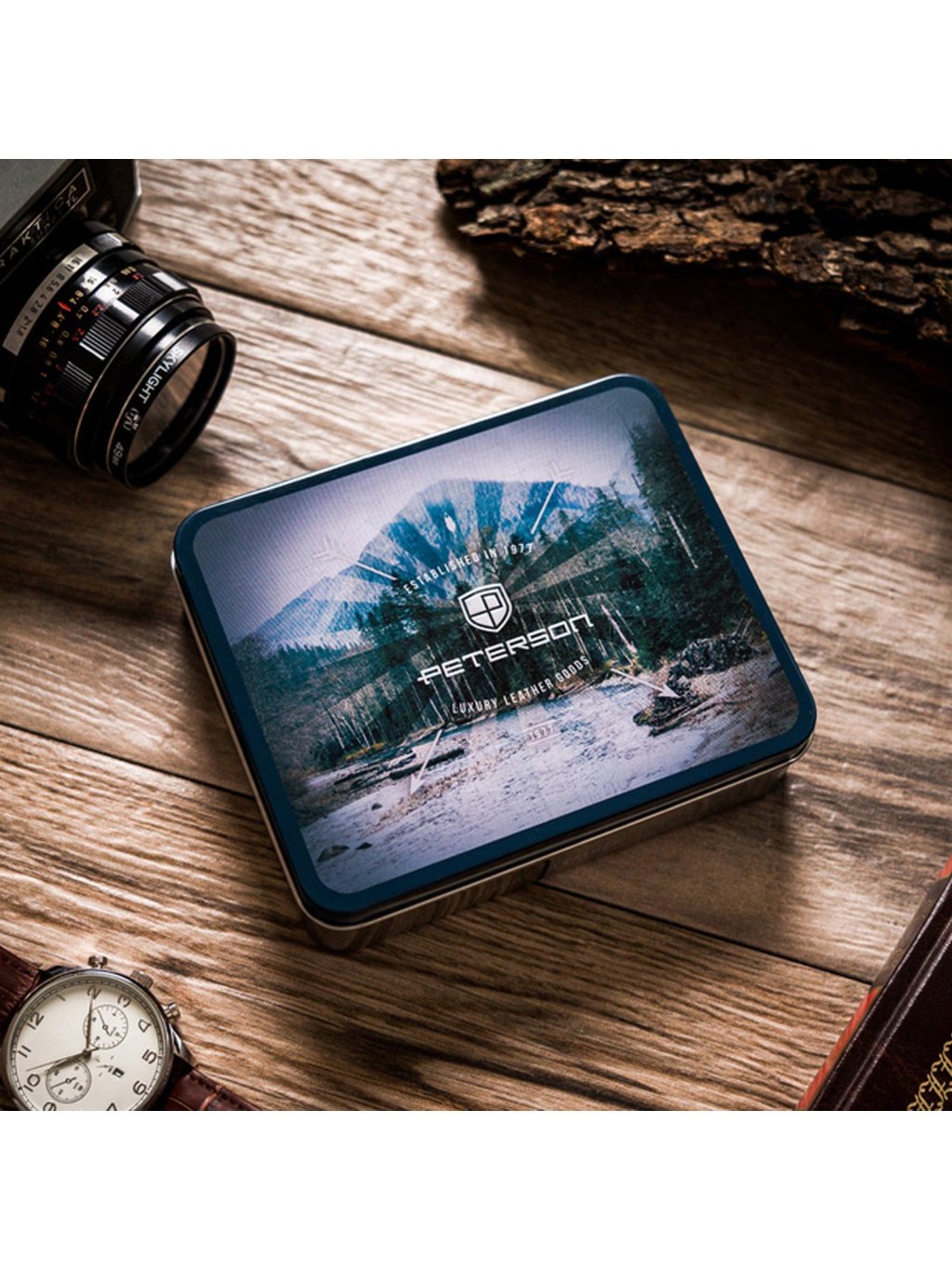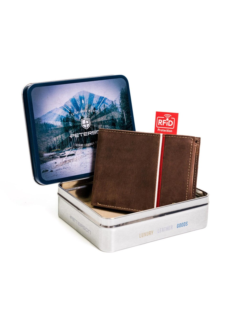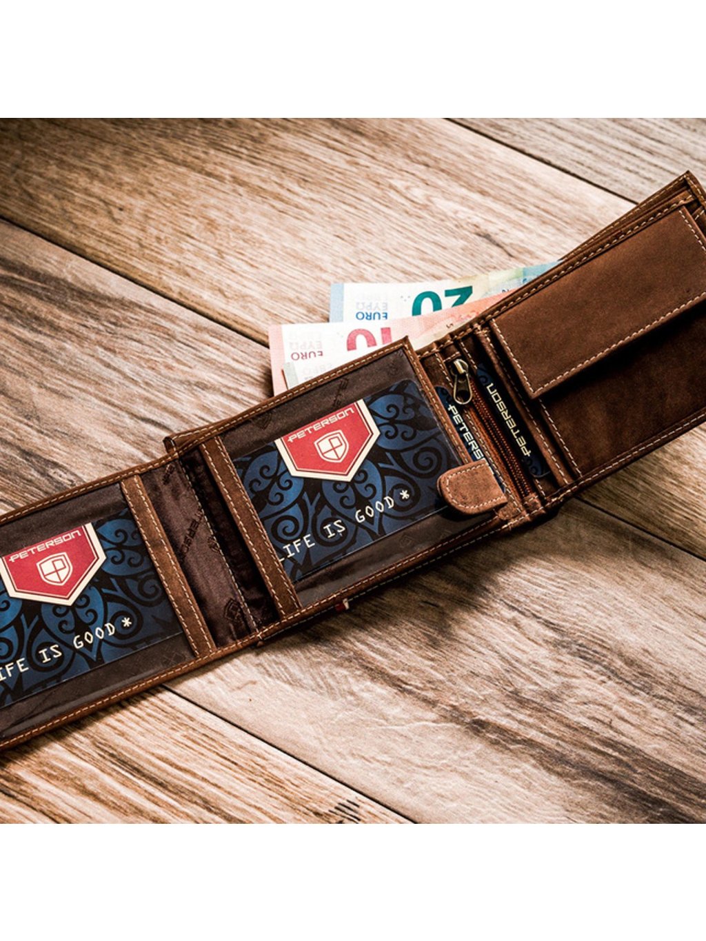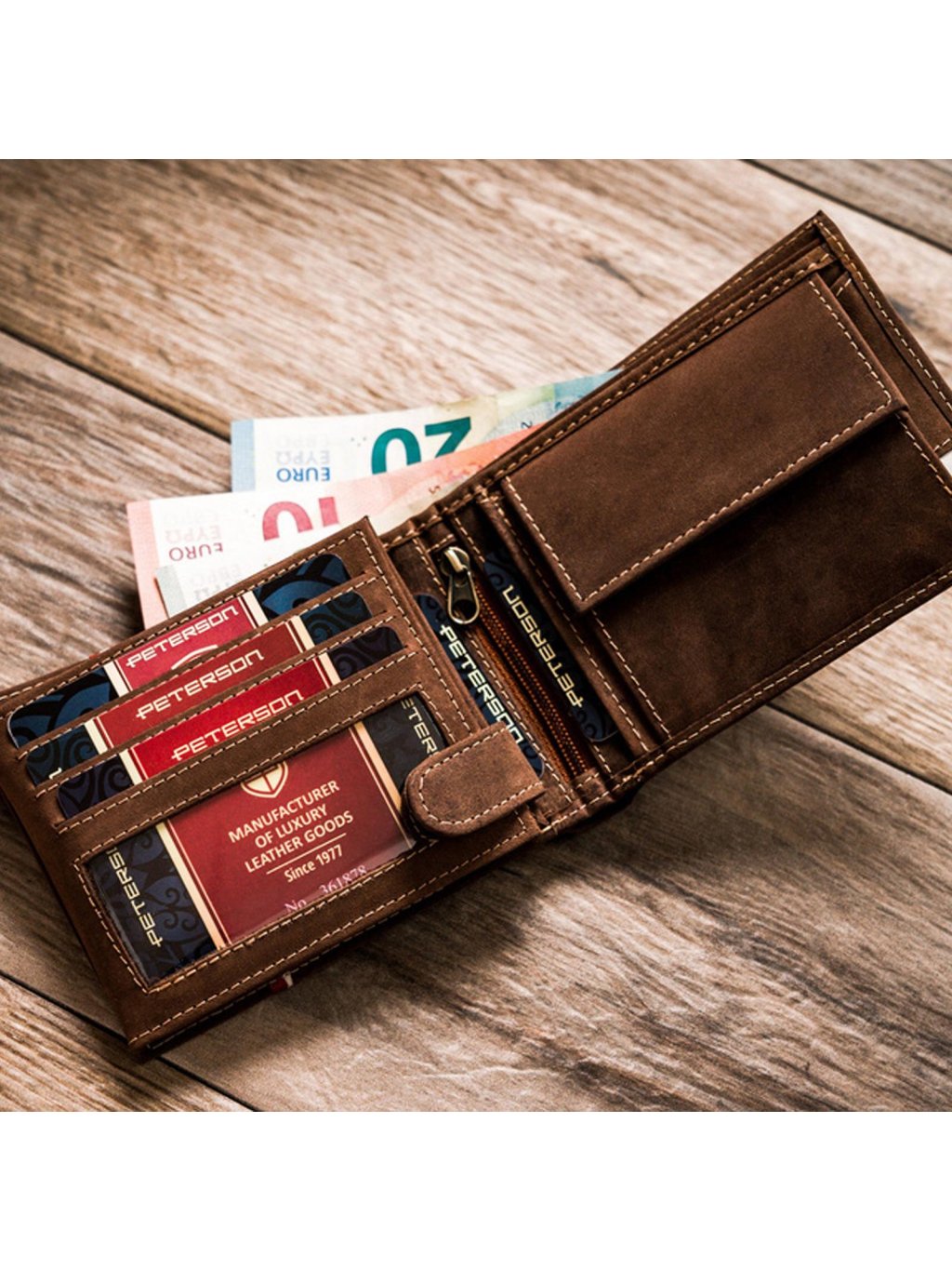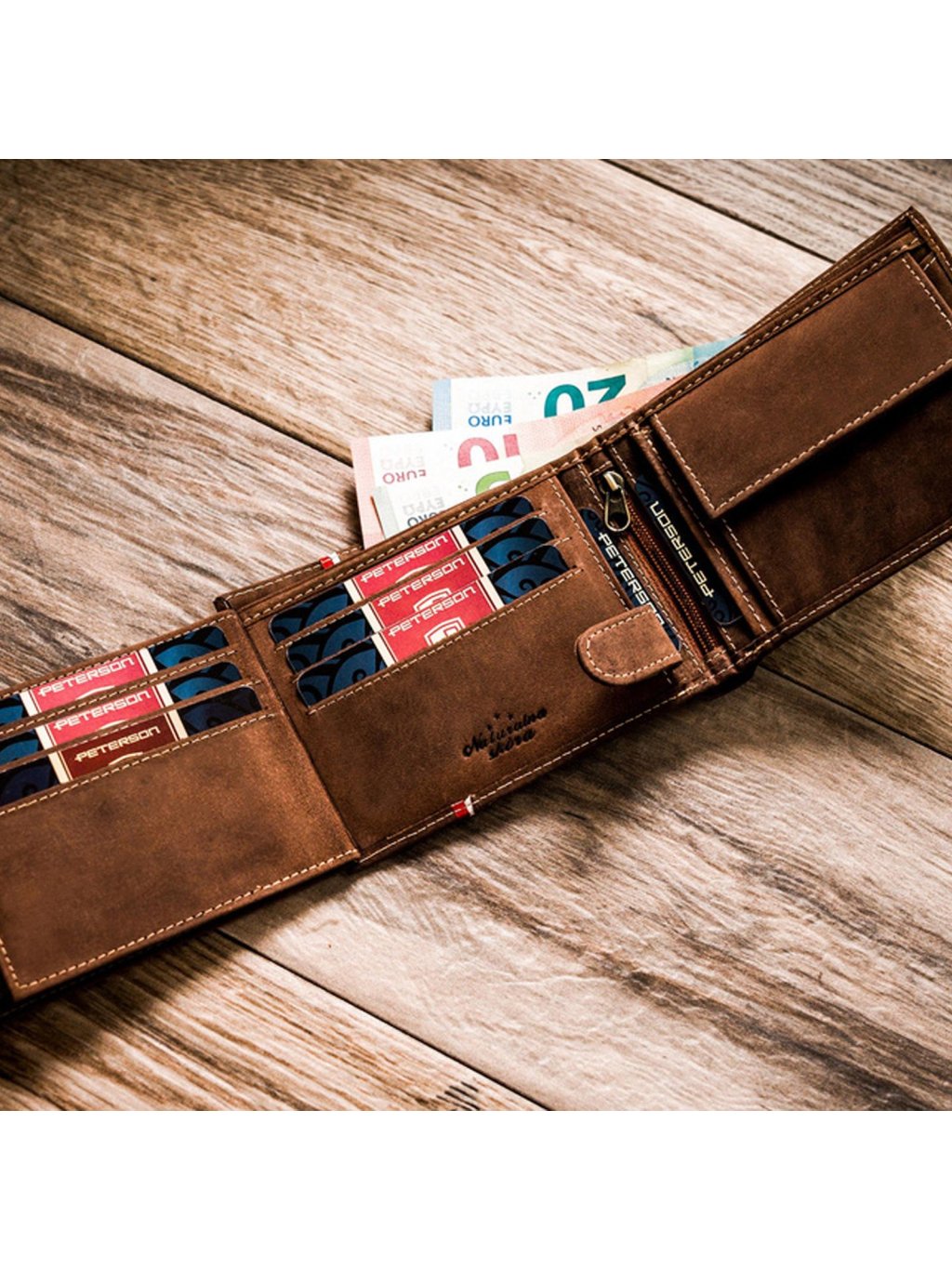 Pánská kožená na šířku orientovaná peněženka značky Peterson. Uvnitř peněženky najdete malou kapsičku na mince se zapínáním na druk, přihrádky na doklady, věrnostní karty a kreditní karty. V horní části peněženky jsou fochy na papírové bankovky, které jsou podšité látkovou podšívkou. Peněženka je ušita z kvalitní pravé kůže a po obvodu prošita silnou nití, což zvyšuje její odolnost.