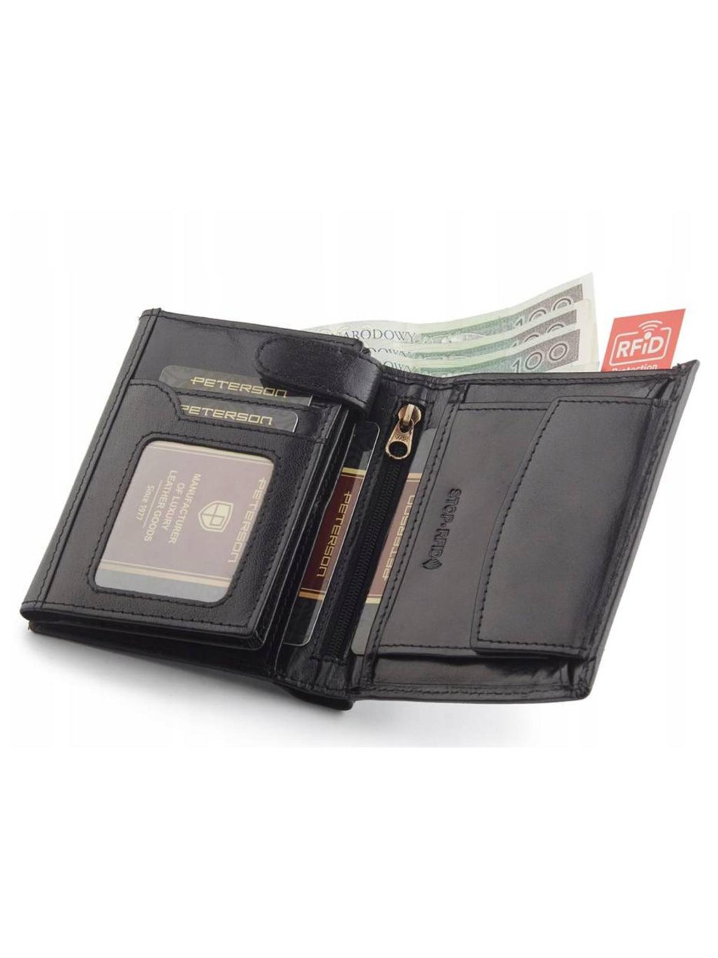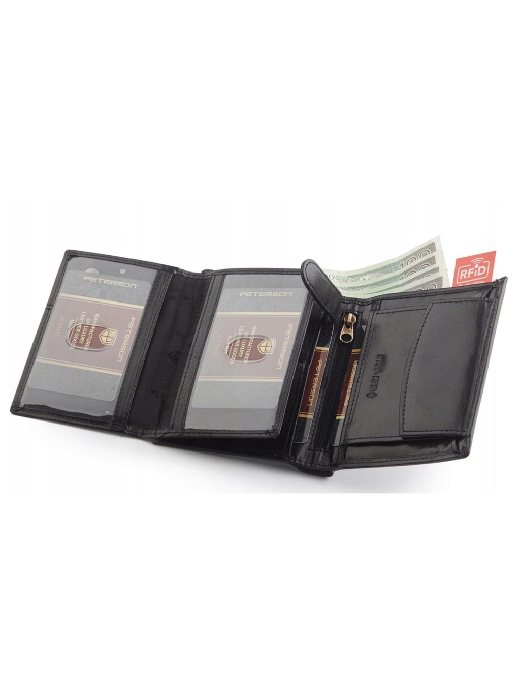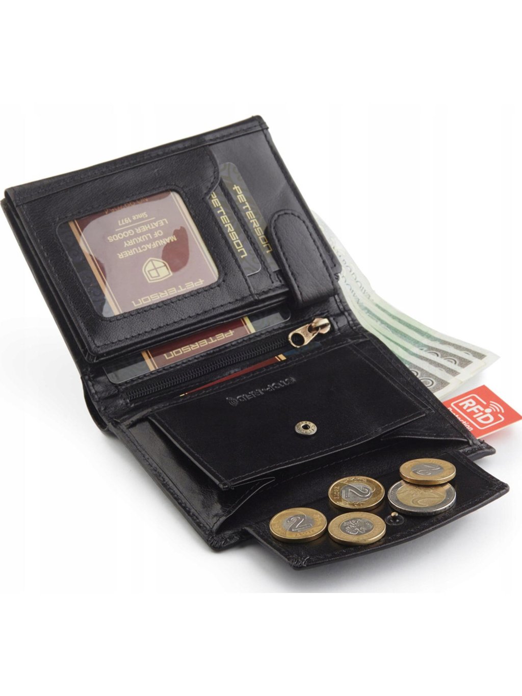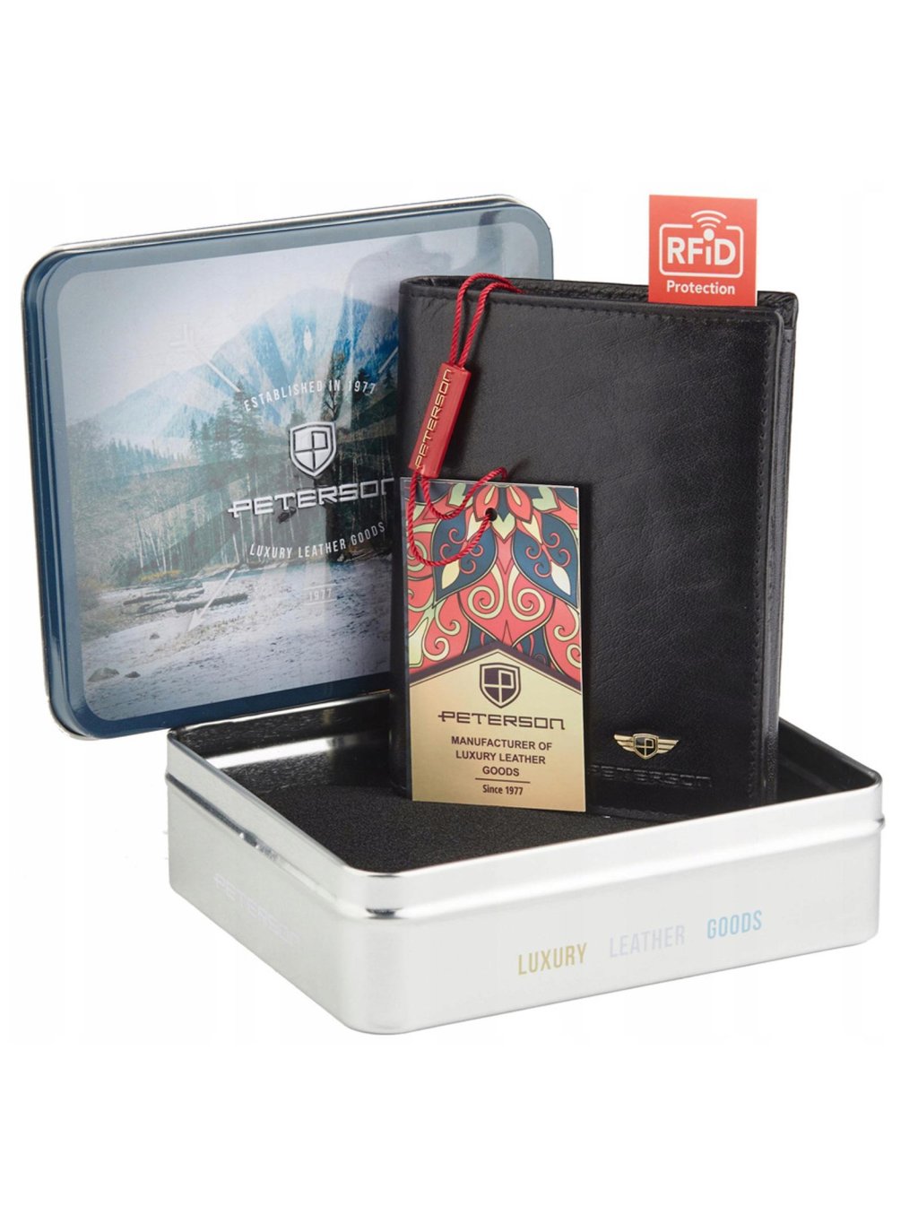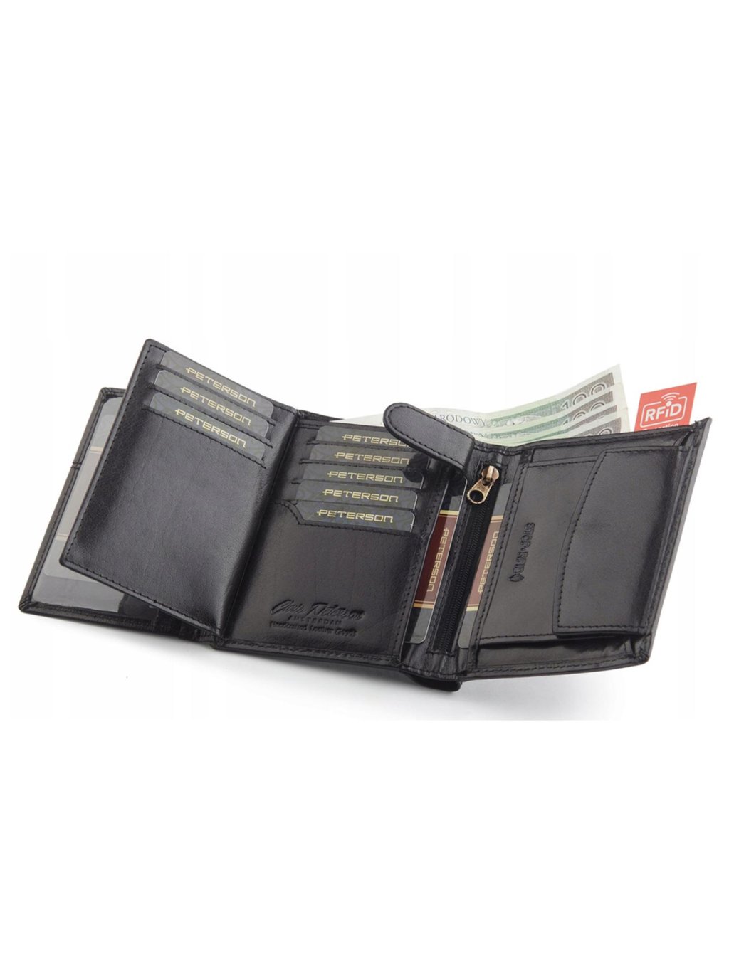 Pánská kožená na výšku orientovaná peněženka značky Peterson. Uvnitř peněženky najdete malou kapsičku na mince se zapínáním na druk, přihrádky na doklady, věrnostní karty a kreditní karty. V horní části peněženky jsou fochy na papírové bankovky, které jsou podšité látkovou podšívkou. Peněženka je ušita z kvalitní pravé kůže a po obvodu prošita silnou nití, což zvyšuje její odolnost.