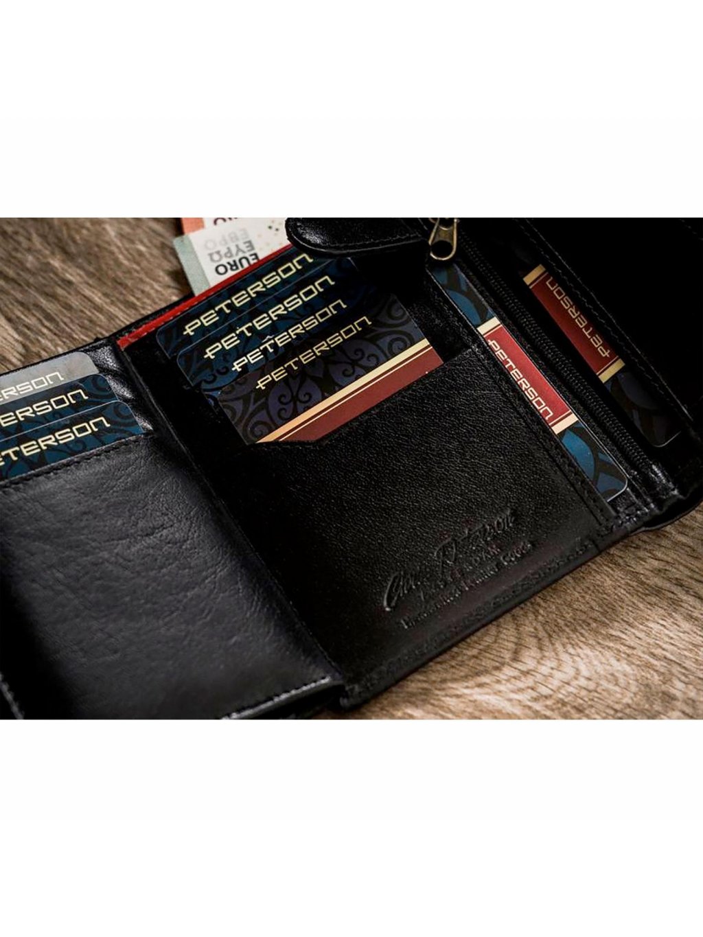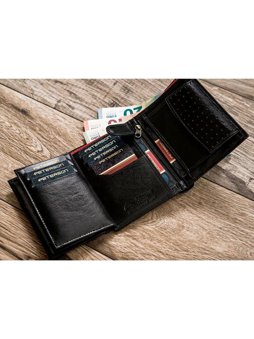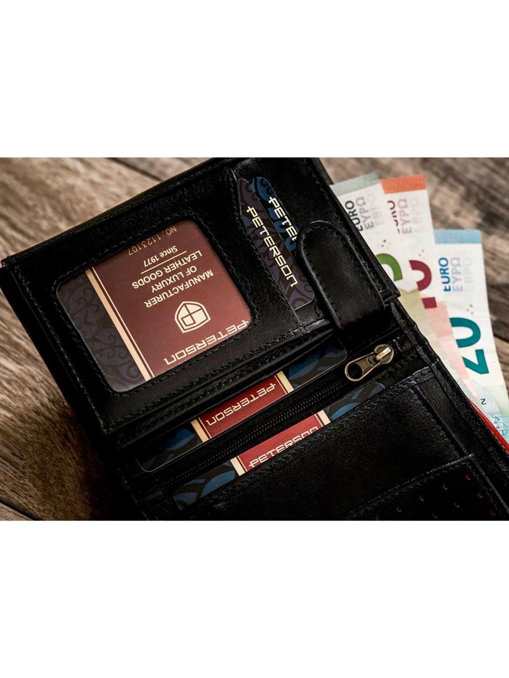 Pánská kožená na výšku orientovaná peněženka značky Peterson. Uvnitř peněženky najdete malou kapsičku na mince se zapínáním na zip, přihrádky na doklady, věrnostní karty a kreditní karty. V horní části peněženky jsou fochy na papírové bankovky, které jsou podšité látkovou podšívkou. Peněženka je ušita z kvalitní pravé kůže a po obvodu prošita silnou nití, což zvyšuje její odolnost.