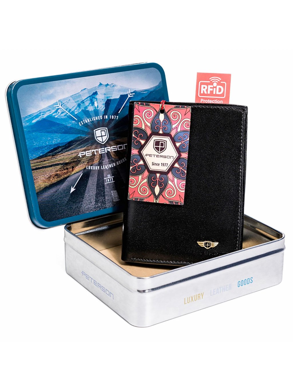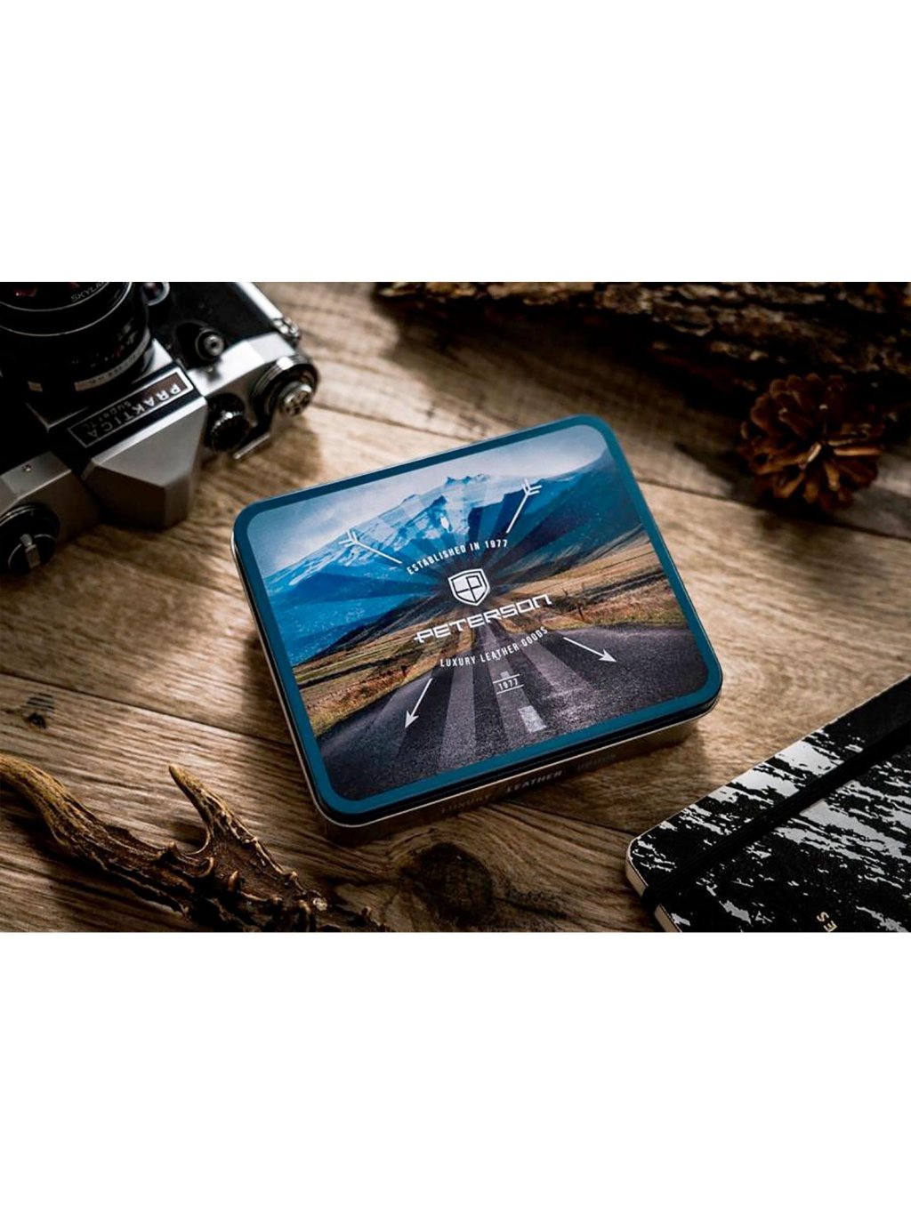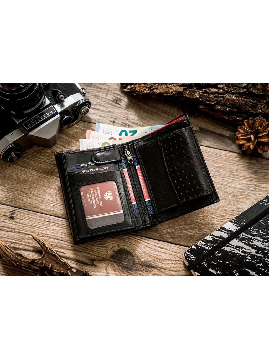 Pánská kožená na výšku orientovaná peněženka značky Peterson. Uvnitř peněženky najdete malou kapsičku na mince se zapínáním na zip, přihrádky na doklady, věrnostní karty a kreditní karty. V horní části peněženky jsou fochy na papírové bankovky, které jsou podšité látkovou podšívkou. Peněženka je ušita z kvalitní pravé kůže a po obvodu prošita silnou nití, což zvyšuje její odolnost.