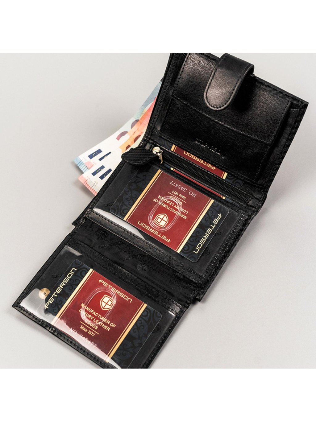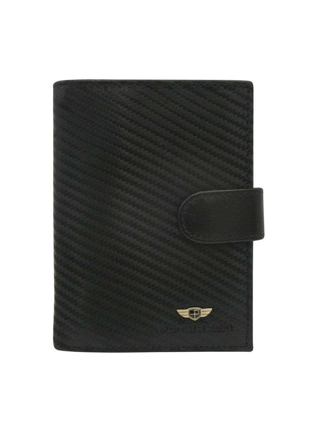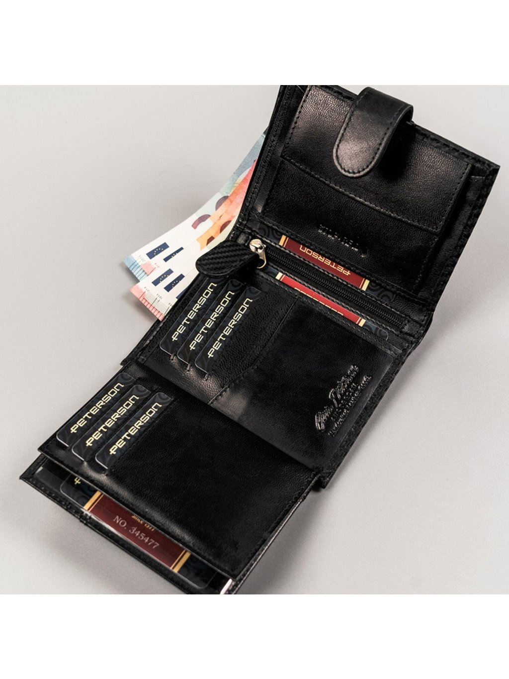 Pánská kožená na výšku orientovaná peněženka značky Peterson. Uvnitř peněženky najdete malou kapsičku na mince se zapínáním na druk, přihrádky na doklady, věrnostní karty a kreditní karty. V horní části peněženky jsou fochy na papírové bankovky, které jsou podšité látkovou podšívkou. Peněženka je ušita z kvalitní pravé kůže a po obvodu prošita silnou nití, což zvyšuje její odolnost. Praktická zápinka na druk zajistí, že z peněženky nic nevypadne.