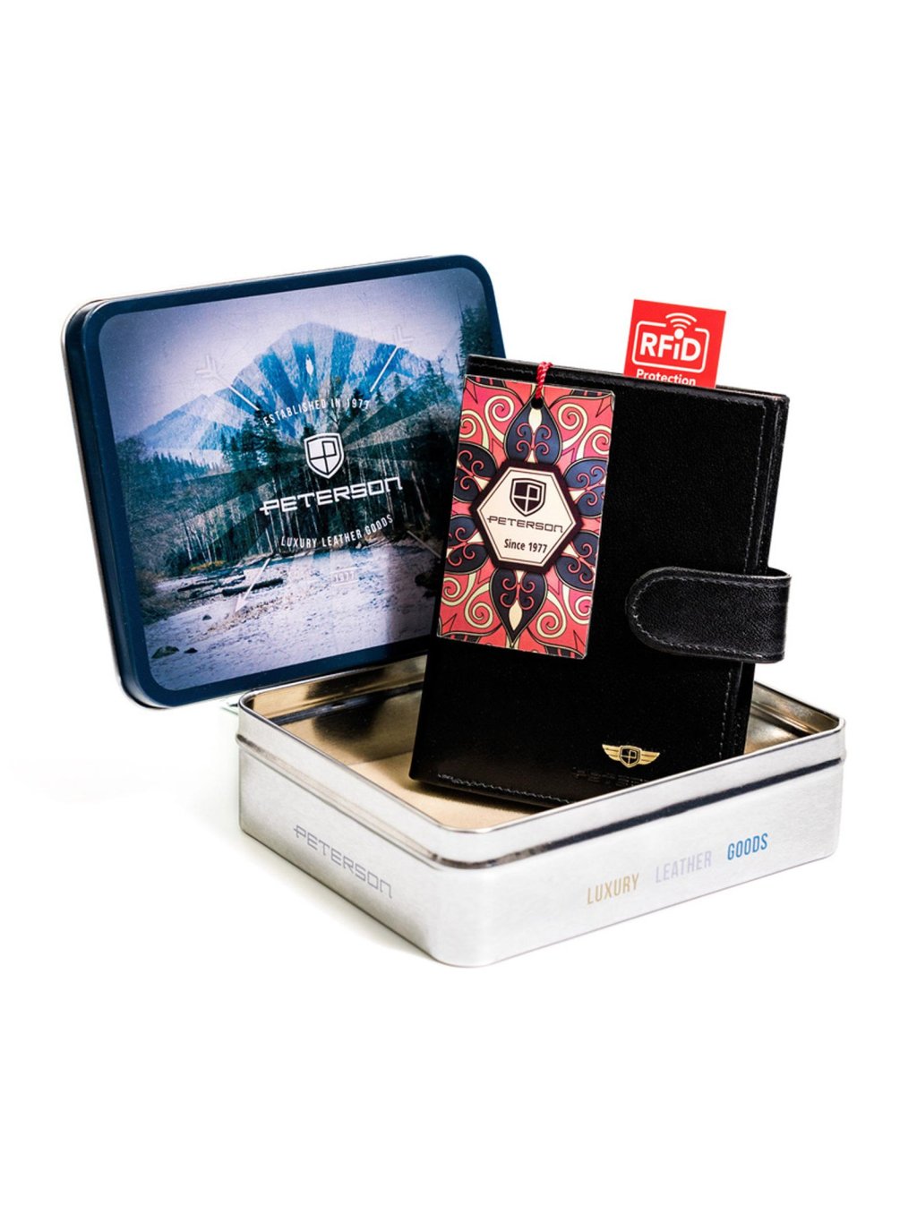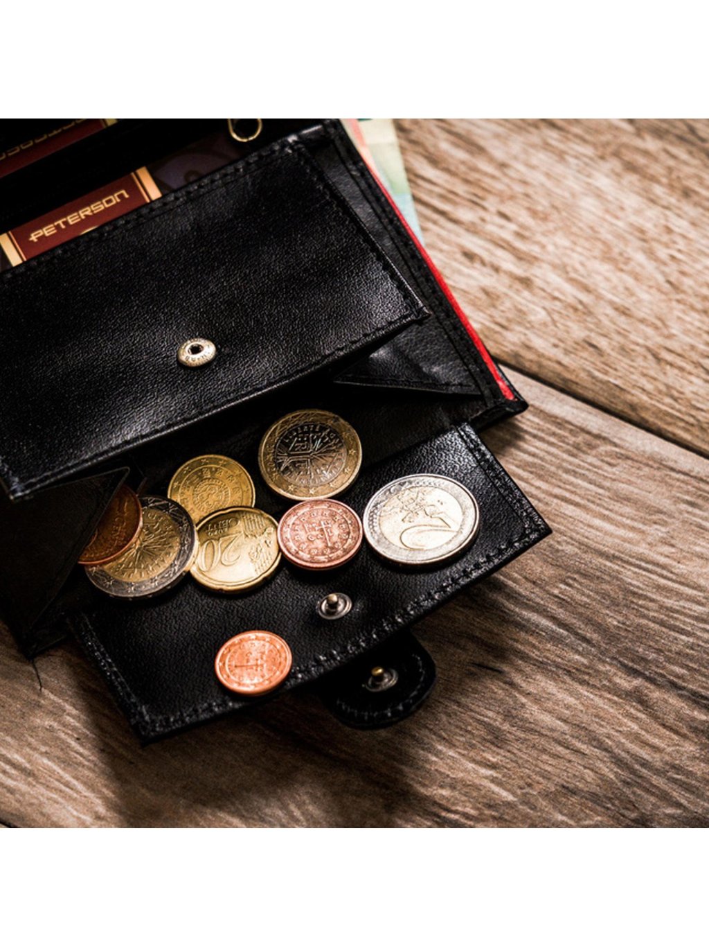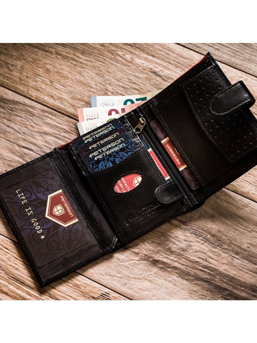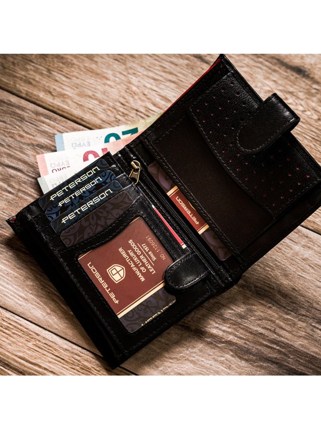 Pánská kožená na výšku orientovaná peněženka značky Peterson. Uvnitř peněženky najdete malou kapsičku na mince se zapínáním na druk, přihrádky na doklady, věrnostní karty a kreditní karty. V horní části peněženky jsou fochy na papírové bankovky, které jsou podšité látkovou podšívkou. Peněženka je ušita z kvalitní pravé kůže a po obvodu prošita silnou nití, což zvyšuje její odolnost. Praktická zápinka na druk zajistí, že z peněženky nic nevypadne.