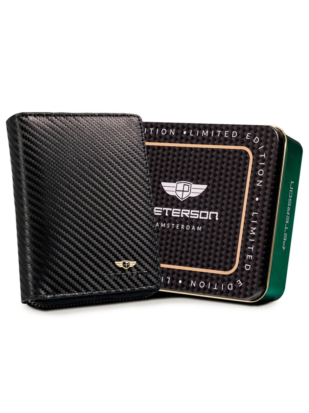 Pánská kožená na výšku orientovaná peněženka značky Peterson. Uvnitř peněženky najdete malou kapsičku na mince se zapínáním na druk, přihrádky na doklady, věrnostní karty a kreditní karty. V horní části peněženky jsou fochy na papírové bankovky, které jsou podšité látkovou podšívkou. Peněženka je ušita z kvalitní pravé kůže a po obvodu prošita silnou nití, což zvyšuje její odolnost. Peněženka je dodávaná v hliníkové krabičce, díky které se z ní může stát úžasný dárek.