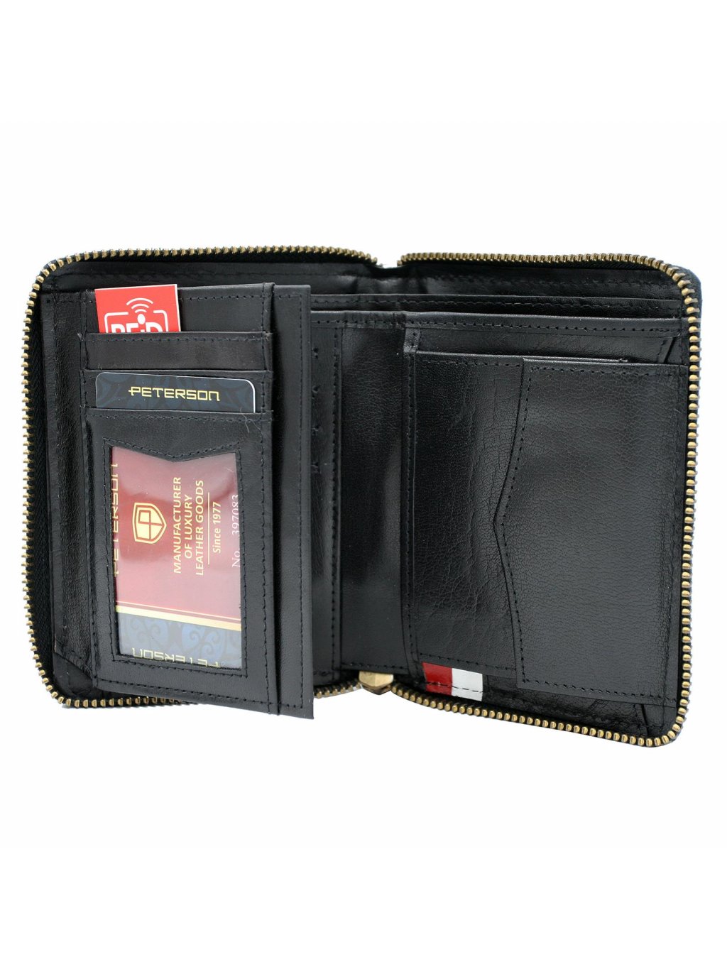 Pánská kožená na výšku orientovaná peněženka značky Peterson. Uvnitř peněženky najdete kapsičku na mince se zapínáním na druk, přihrádky na doklady, věrnostní i kreditní malou karty. V horní části peněženky jsou fochy na papírové bankovky, které jsou podšité látkovou podšívkou. Peněženka je ušita z kvalitní pravé kůže a po obvodu prošita silnou nití, což zvyšuje její odolnost. Peněženka se uzavírá zipem a je dodávána v hliníkové krabičce.