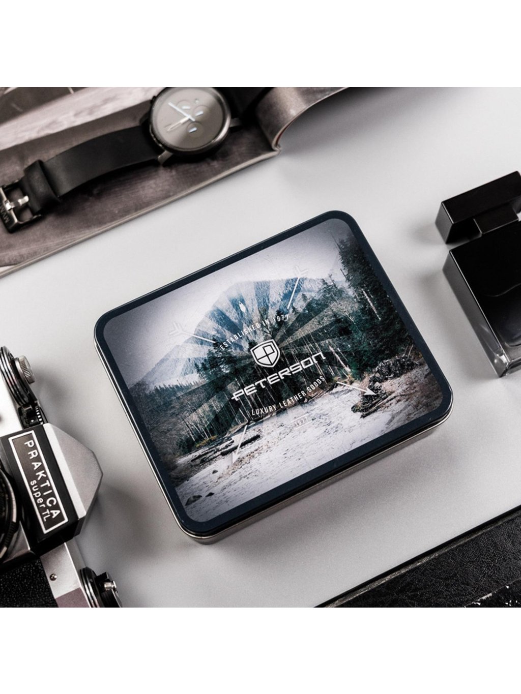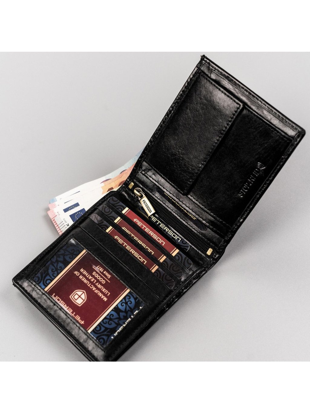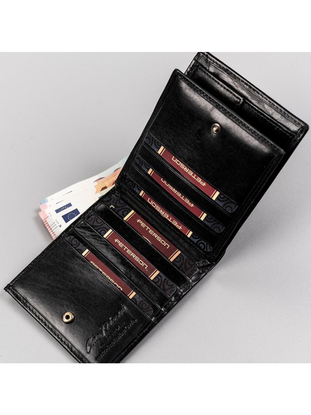Pánská kožená na šířku orientovaná peněženka značky Peterson. Uvnitř peněženky najdete malou kapsičku na mince se zapínáním na druk, přihrádky na doklady, věrnostní karty a kreditní karty. V horní části peněženky jsou fochy na papírové bankovky, které jsou podšité látkovou podšívkou. Peněženka je ušita z kvalitní pravé kůže a po obvodu prošita silnou nití, což zvyšuje její odolnost.