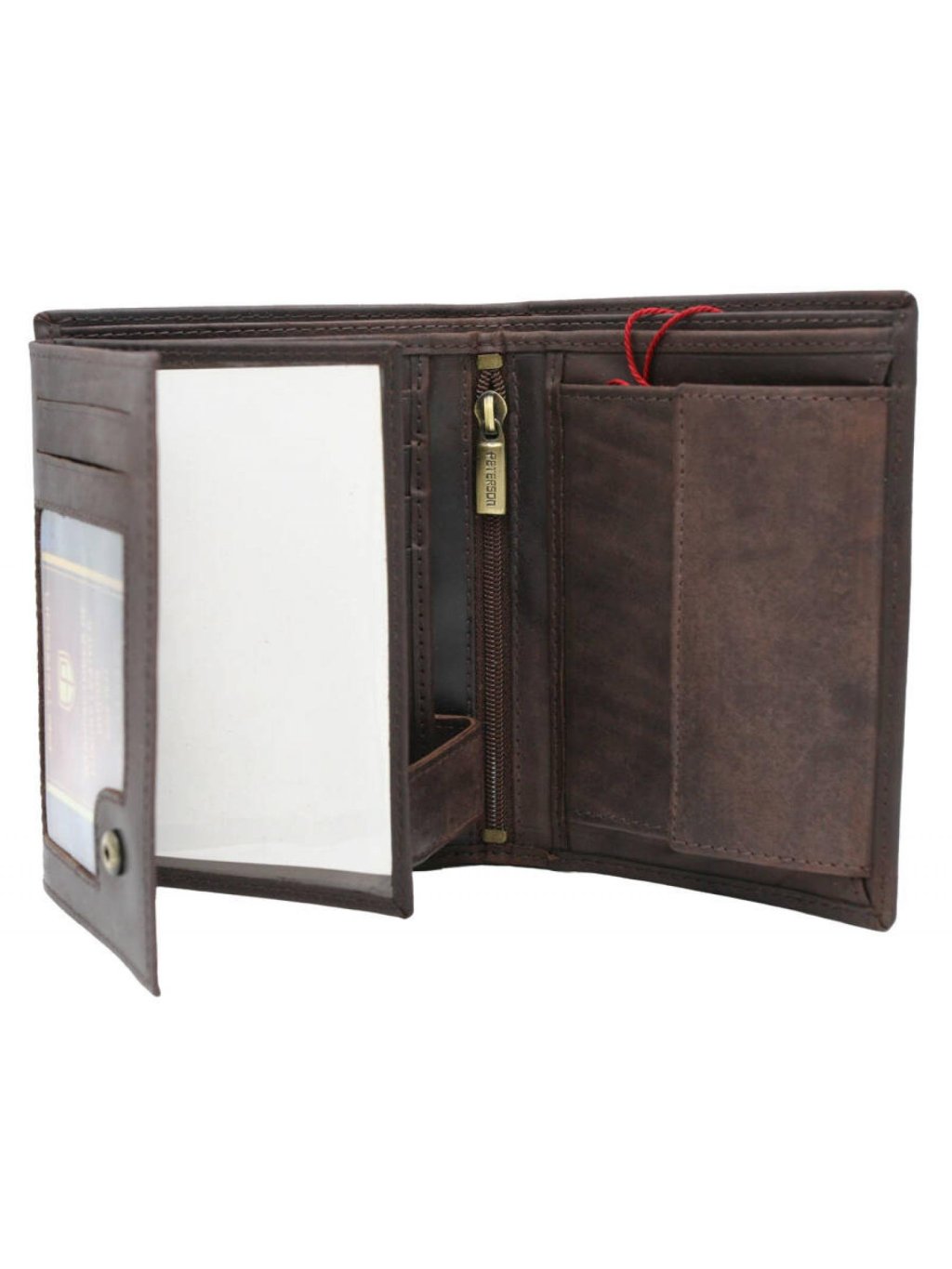 Pánská kožená na výšku orientovaná peněženka značky Peterson. Uvnitř peněženky najdete malou kapsičku na mince se zapínáním na druk, přihrádky na doklady, věrnostní karty a kreditní karty. V horní části peněženky jsou fochy na papírové bankovky, které jsou podšité látkovou podšívkou. Peněženka je ušita z kvalitní pravé kůže a po obvodu prošita silnou nití, což zvyšuje její odolnost.