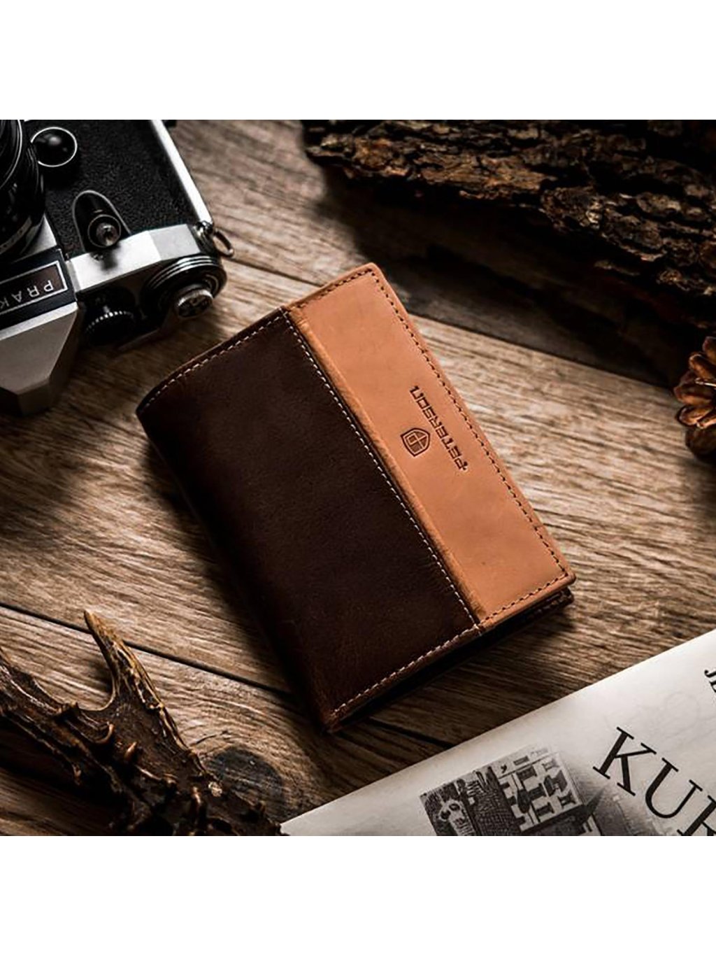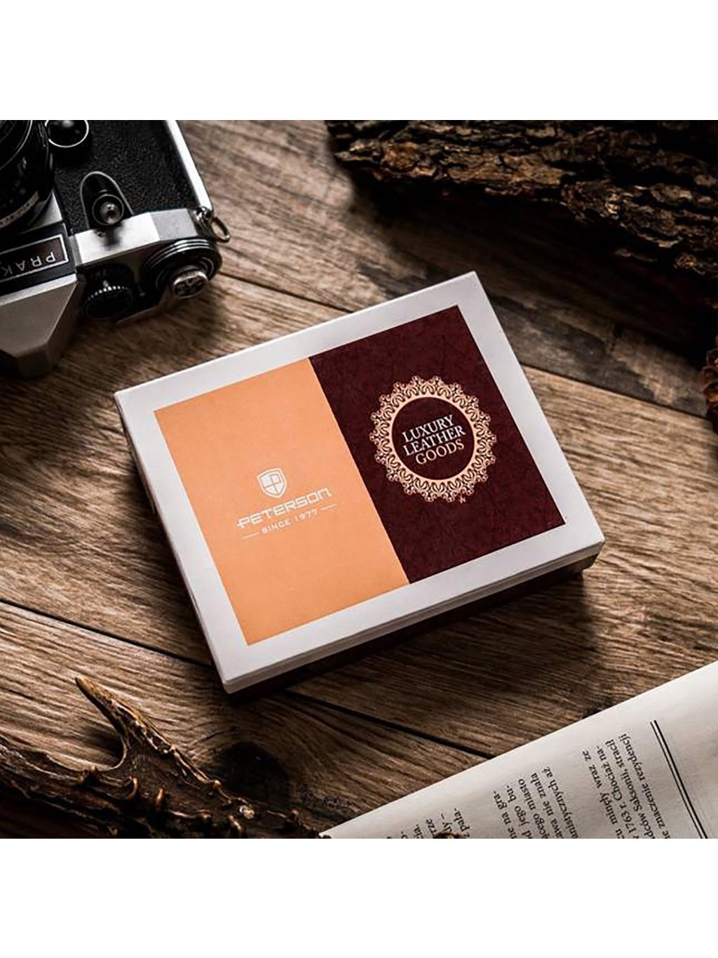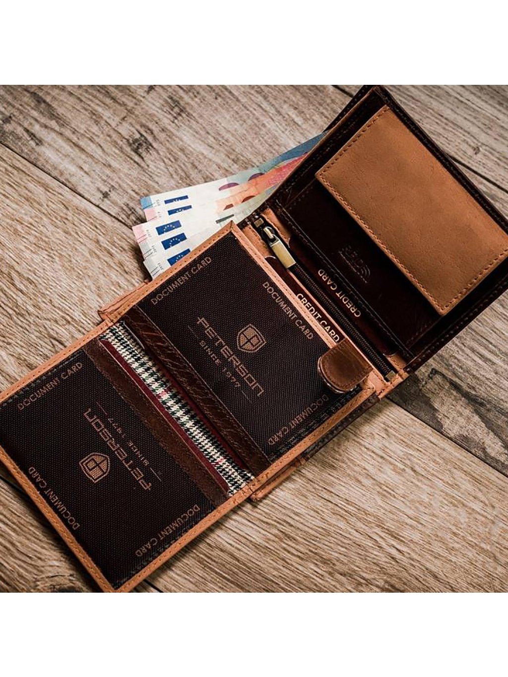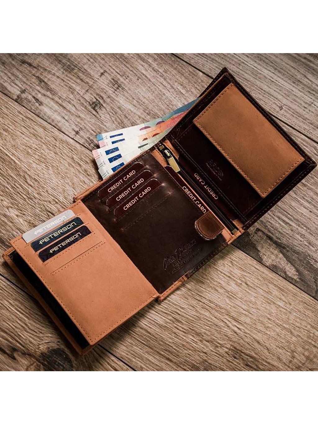 Pánská kožená na výšku orientovaná peněženka značky Peterson. Uvnitř peněženky najdete malou kapsičku na mince se zapínáním na druk, přihrádky na doklady, věrnostní i kreditní karty. V horní části peněženky jsou fochy na papírové bankovky, které jsou podšité látkovou podšívkou. Peněženka je ušita z kvalitní pravé kůže a po obvodu prošita silnou nití, což zvyšuje její odolnost. Peněženka je dodávaná v papírové krabičce, díky které se z ní může stát úžasný dárek.