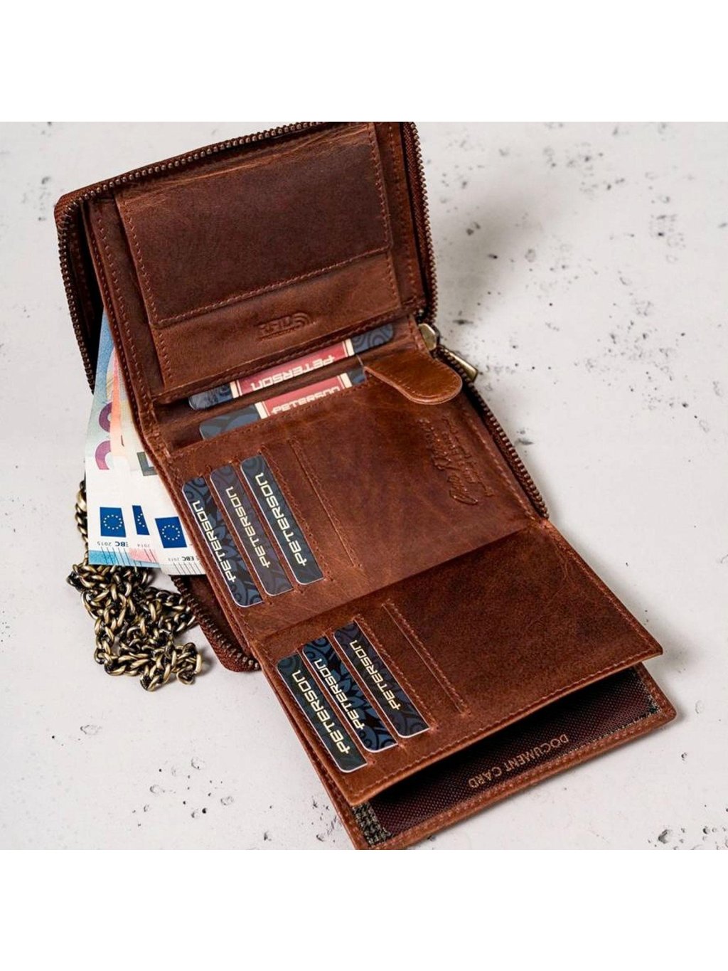 Pánská kožená na výšku orientovaná peněženka značky Peterson. Uvnitř peněženky najdete malou kapsičku na mince se zapínáním na druk, přihrádky na doklady, věrnostní karty a kreditní karty. V horní části peněženky jsou fochy na papírové bankovky, které jsou podšité látkovou podšívkou. Peněženka je ušita z kvalitní pravé kůže a po obvodu prošita silnou nití, což zvyšuje její odolnost.