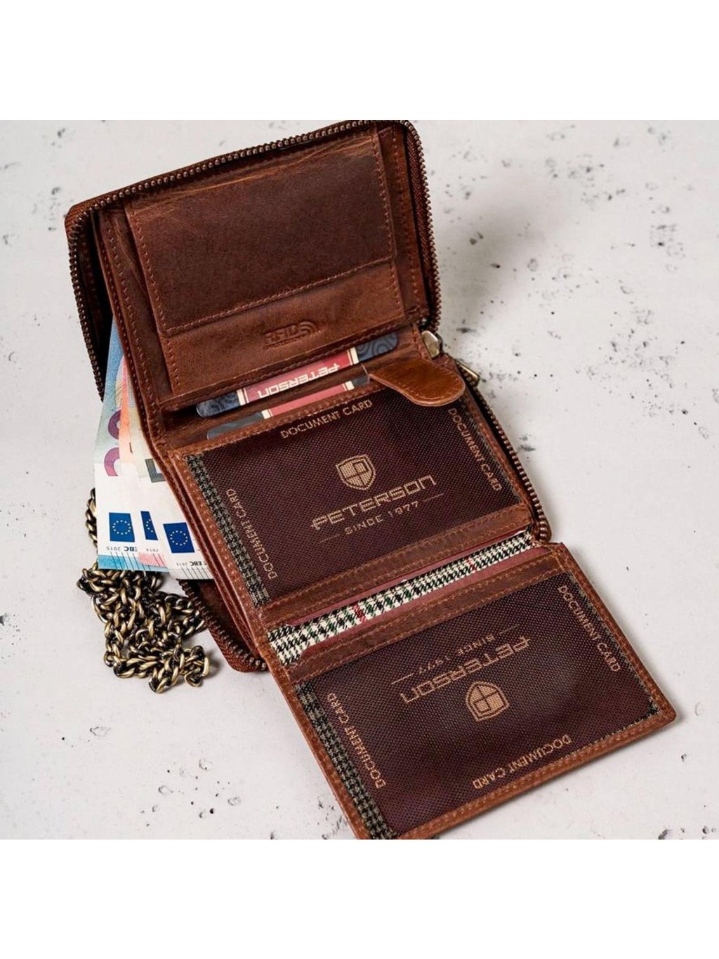 Pánská kožená na výšku orientovaná peněženka značky Peterson. Uvnitř peněženky najdete malou kapsičku na mince se zapínáním na druk, přihrádky na doklady, věrnostní karty a kreditní karty. V horní části peněženky jsou fochy na papírové bankovky, které jsou podšité látkovou podšívkou. Peněženka je ušita z kvalitní pravé kůže a po obvodu prošita silnou nití, což zvyšuje její odolnost.