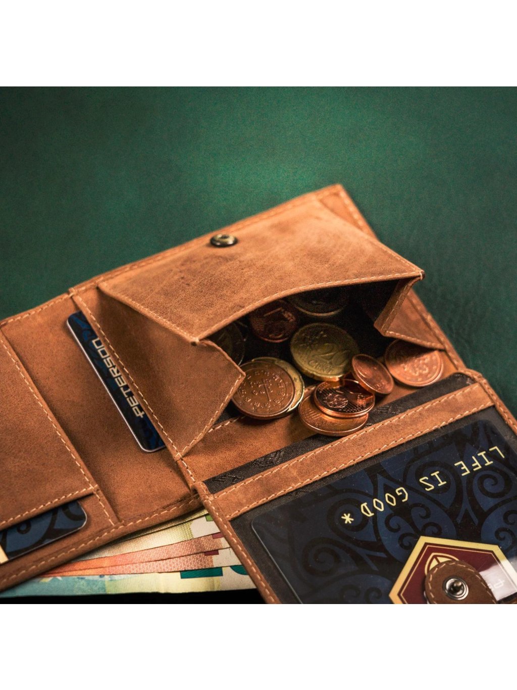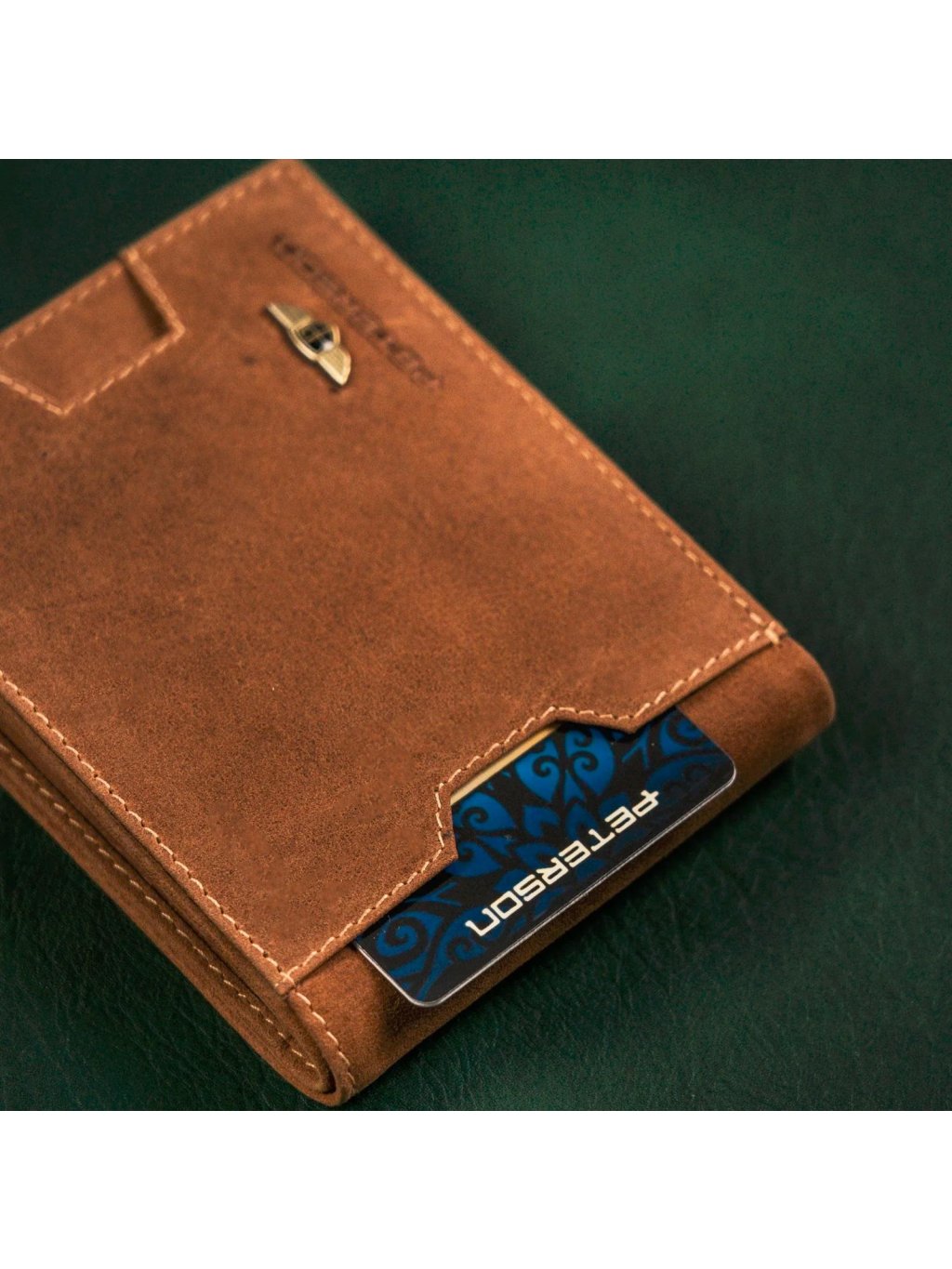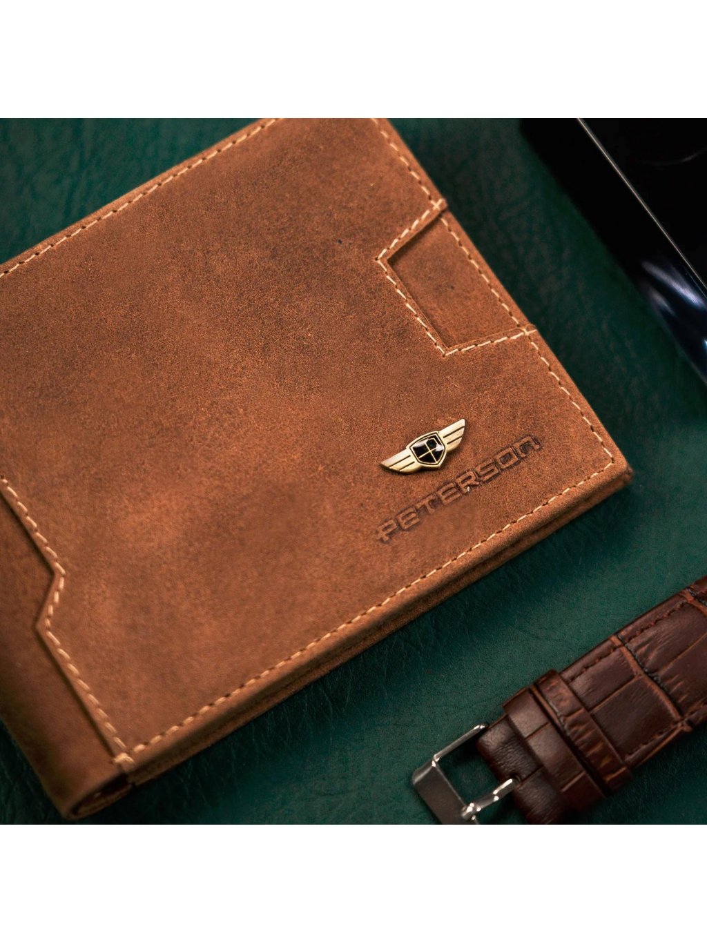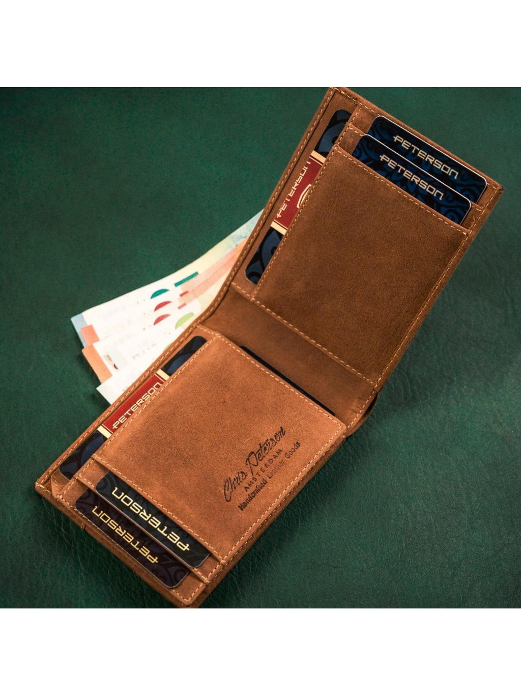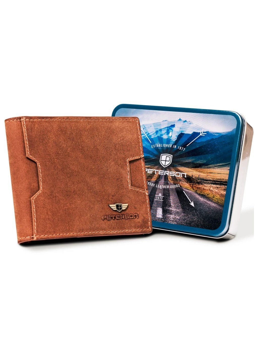 Pánská kožená na šířku orientovaná peněženka značky Peterson. Uvnitř peněženky najdete malou kapsičku na mince se zapínáním na druk, přihrádky na doklady, věrnostní i kreditní karty. V horní části peněženky jsou fochy na papírové bankovky, které jsou podšité látkovou podšívkou. Peněženka je ušita z kvalitní pravé kůže a po obvodu prošita silnou nití, což zvyšuje její odolnost. Peněženka je dodávaná v hliníkové krabičce, díky které se z ní může stát úžasný dárek.