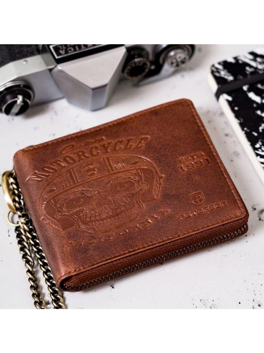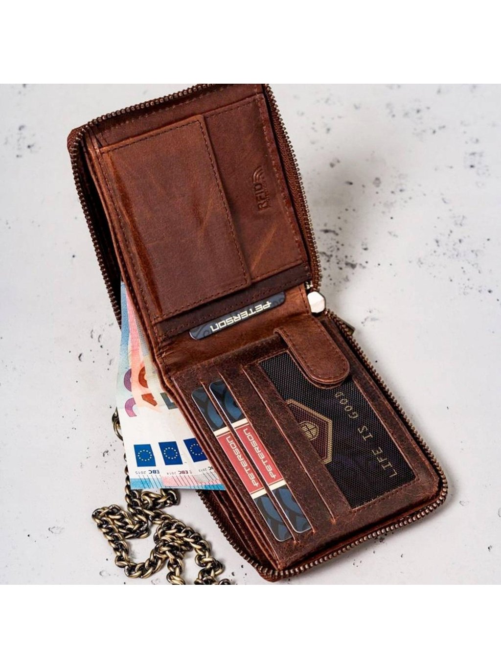 Pánská kožená na šířku orientovaná peněženka značky Peterson. Uvnitř peněženky najdete malou kapsičku na mince se zapínáním na druk, přihrádky na doklady, věrnostní karty a kreditní karty. V horní části peněženky jsou fochy na papírové bankovky, které jsou podšité látkovou podšívkou. Peněženka je ušita z kvalitní pravé kůže a po obvodu prošita silnou nití, což zvyšuje její odolnost.