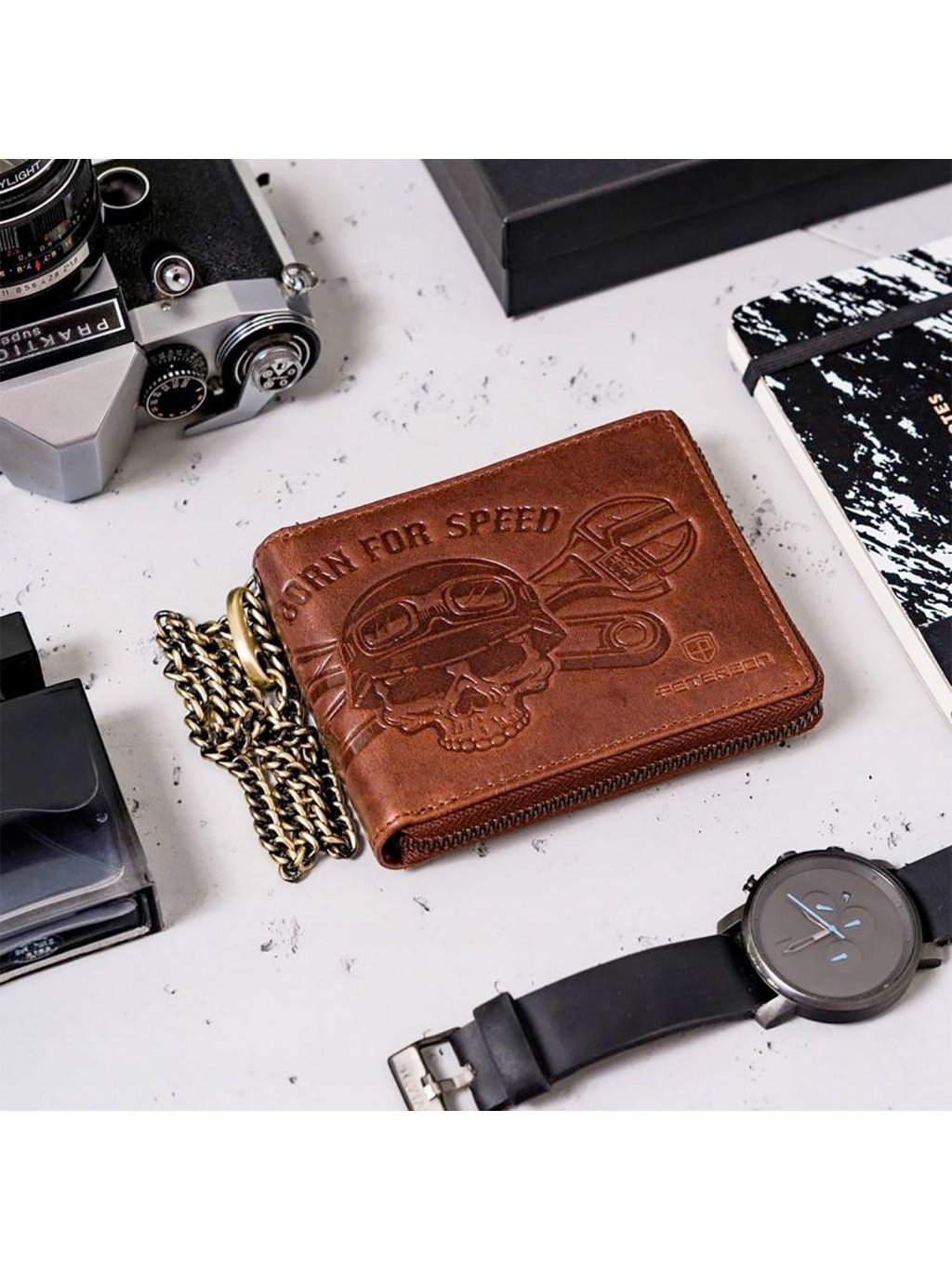 Pánská kožená na šířku orientovaná peněženka značky Peterson. Uvnitř peněženky najdete kapsičku na mince se zapínáním na druk, přihrádky na doklady, věrnostní i kreditní malou karty. V horní části peněženky jsou fochy na papírové bankovky, které jsou podšité látkovou podšívkou. Peněženka je ušita z kvalitní pravé kůže a po obvodu prošita silnou nití, což zvyšuje její odolnost. Peněženka se uzavírá na zip, má připínací řetízek a je dodávána v papírové krabičce.