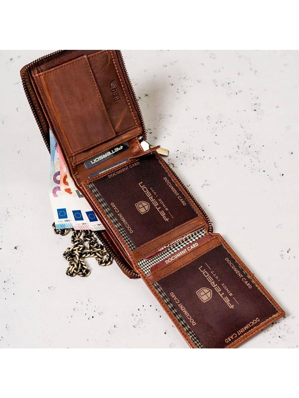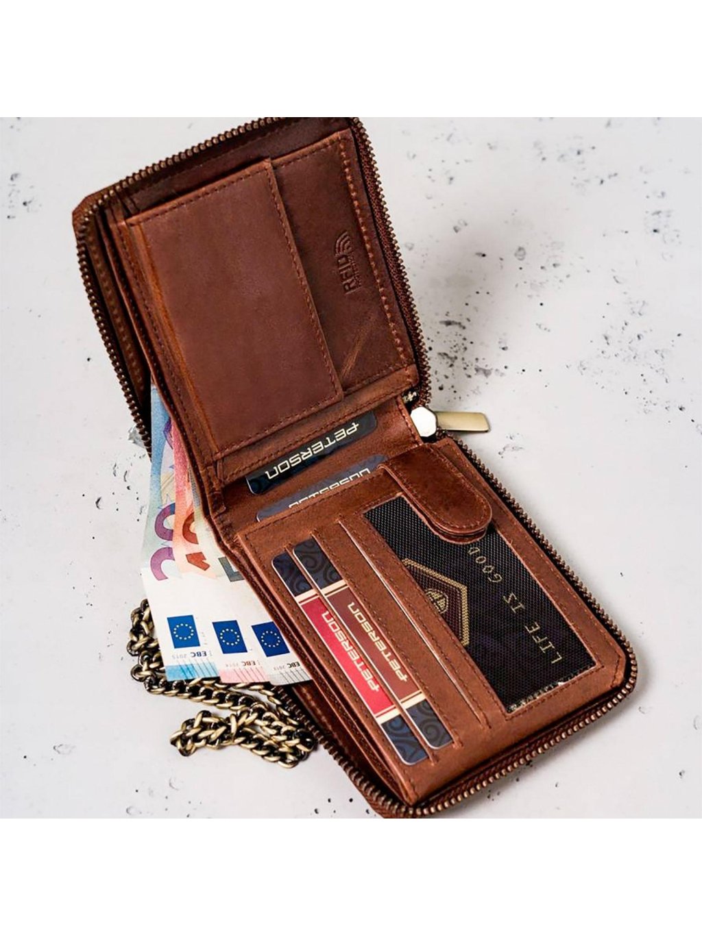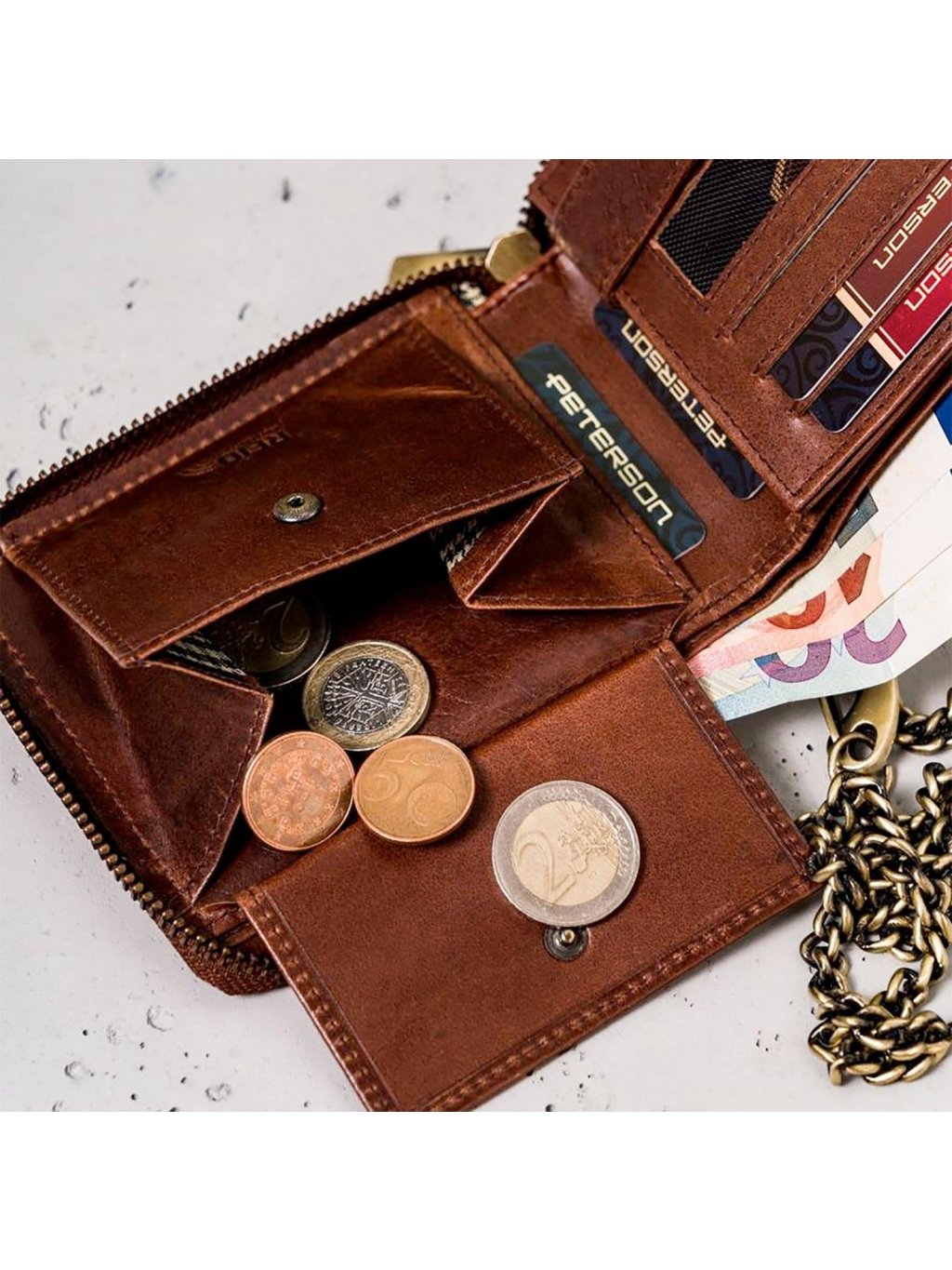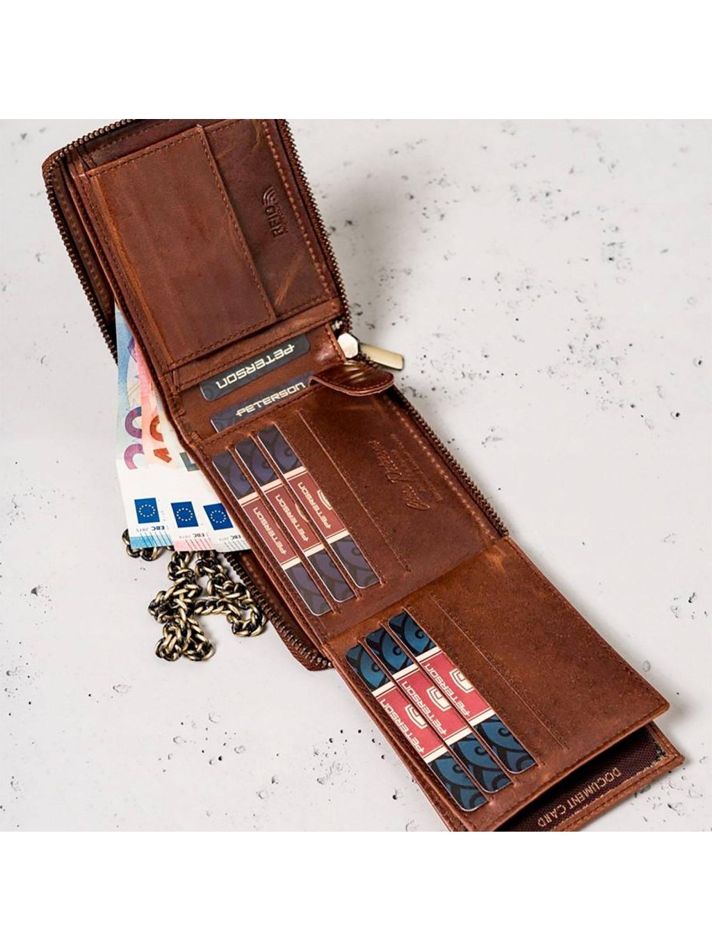 Pánská kožená na šířku orientovaná peněženka značky Peterson. Uvnitř peněženky najdete kapsičku na mince se zapínáním na druk, přihrádky na doklady, věrnostní i kreditní malou karty. V horní části peněženky jsou fochy na papírové bankovky, které jsou podšité látkovou podšívkou. Peněženka je ušita z kvalitní pravé kůže a po obvodu prošita silnou nití, což zvyšuje její odolnost. Peněženka se uzavírá na zip, má připínací řetízek a je dodávána v papírové krabičce.