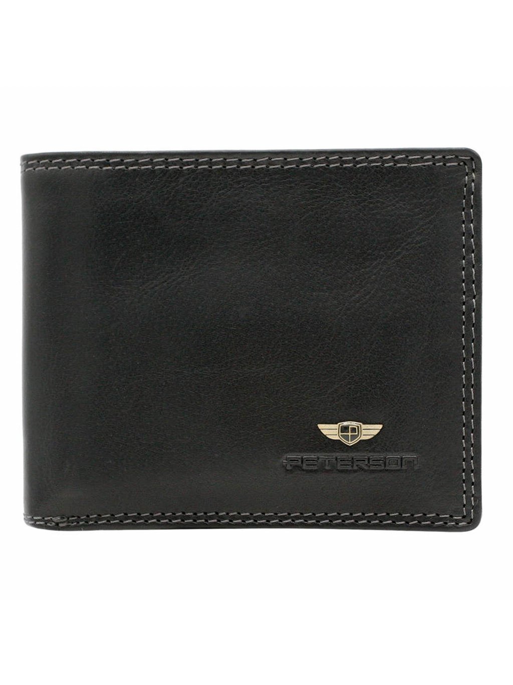 Pánská kožená na šířku orientovaná peněženka značky Peterson. Uvnitř peněženky najdete malou kapsičku na mince se zapínáním na druk, přihrádky na doklady, věrnostní i kreditní karty. V horní části peněženky jsou fochy na papírové bankovky, které jsou podšité látkovou podšívkou. Peněženka je ušita z kvalitní pravé kůže a po obvodu prošita silnou nití, což zvyšuje její odolnost.
