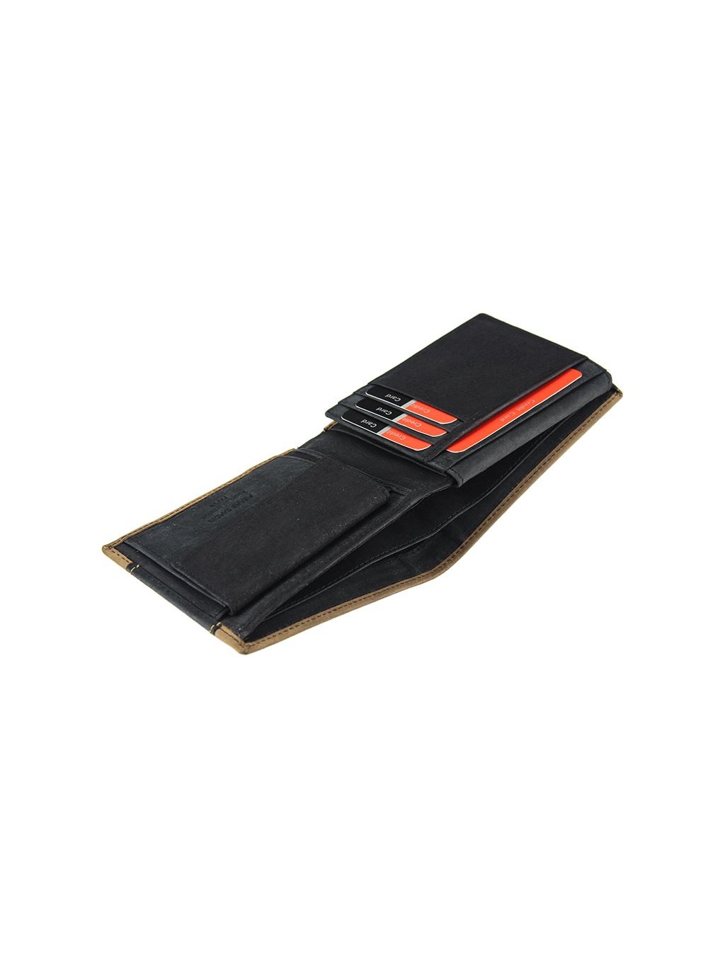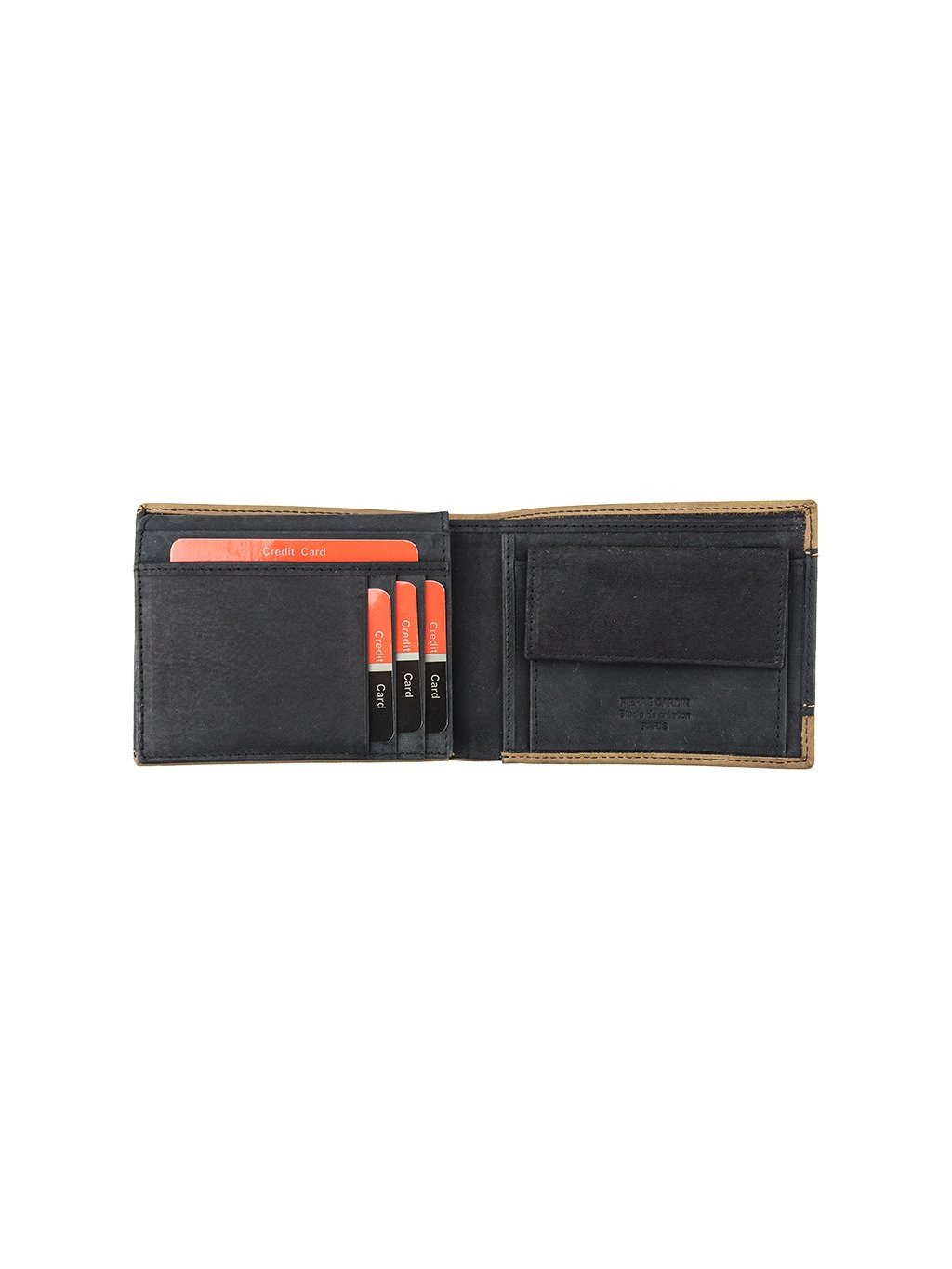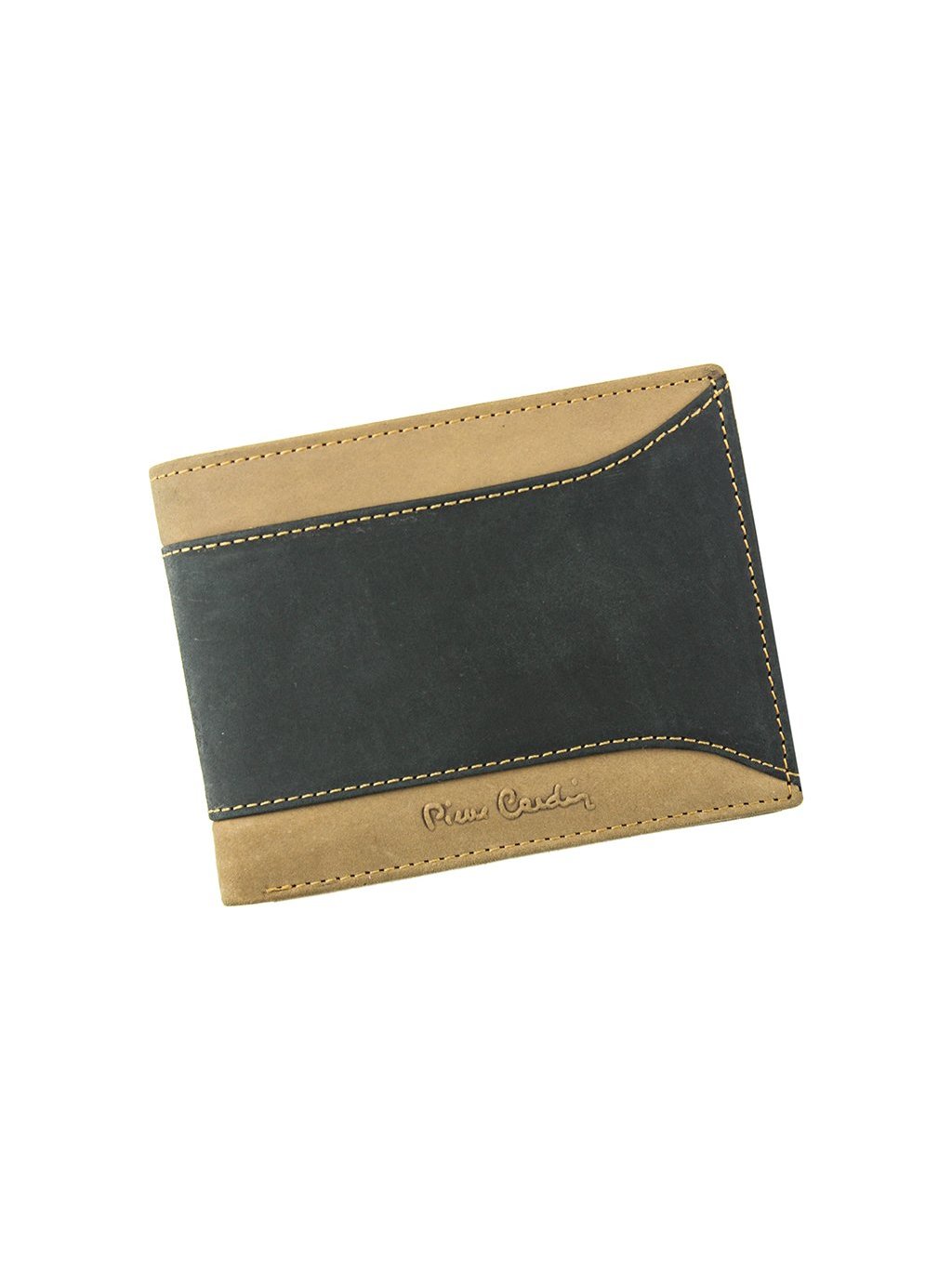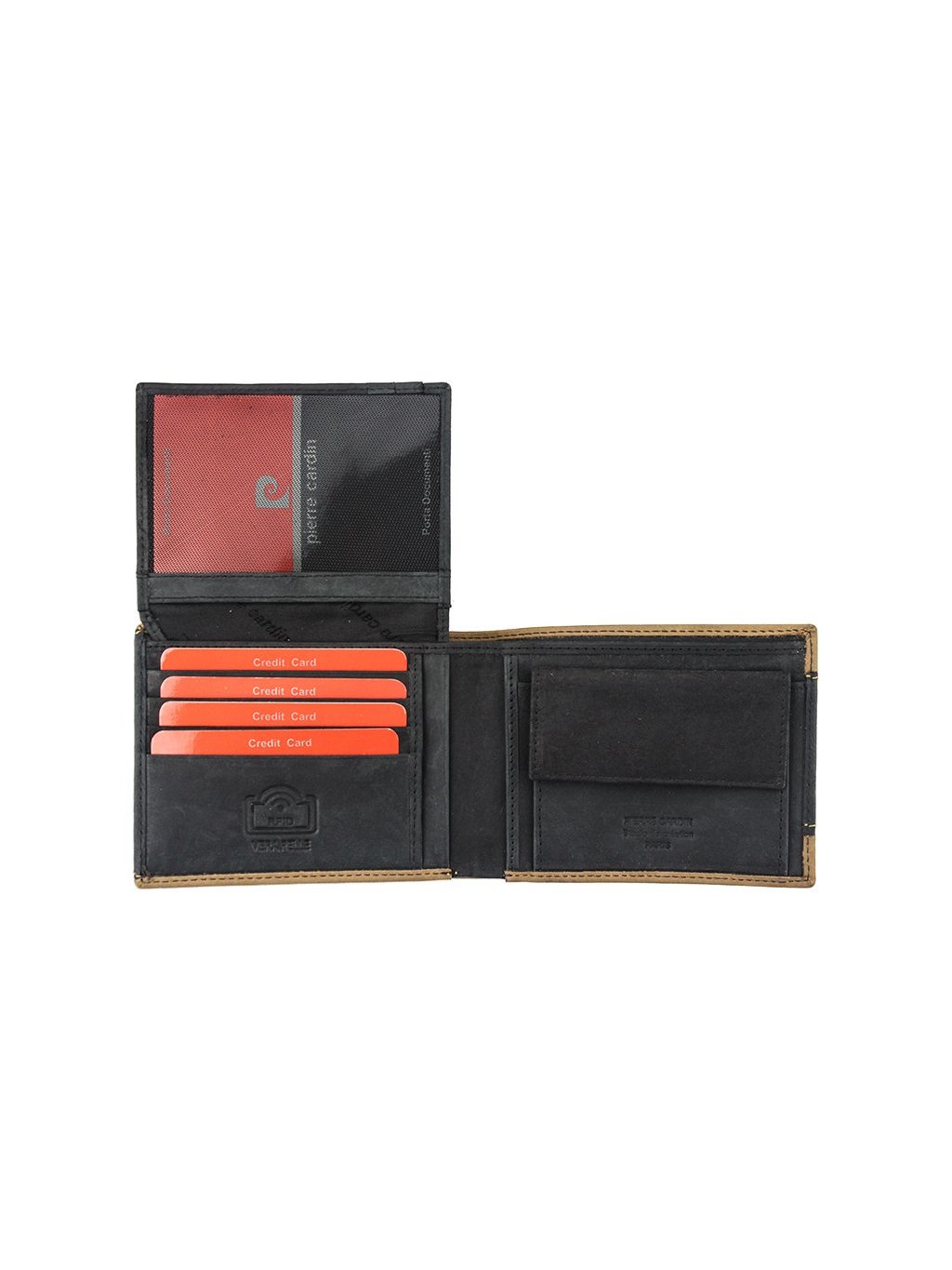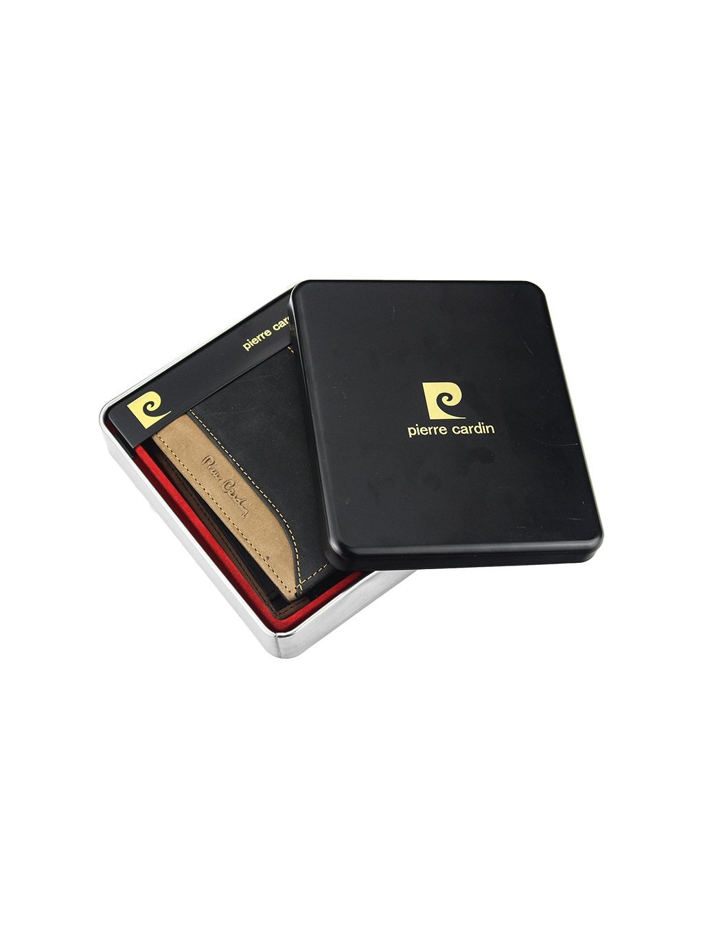 Luxusní pánská kožená peněženka francouzské značky Pierre Cardin v černo – hnědém provedení. Peněženka je ušitá z hladké přírodní kůže. Na přední straně je vyraženo logo výrobce. Celá peněženka je po obvodu prošitá což zvyšuje její životnost. Uvnitř nalezneme dva fochy na papírové bankovky a mincovník na druk. Podšívka u peněženky je tmavé barvy s potiskem loga výrobce. Přihrádky na doklady a kreditní karty jsou samozřejmostí. Peněženka je uložená v plechové krabičce.
