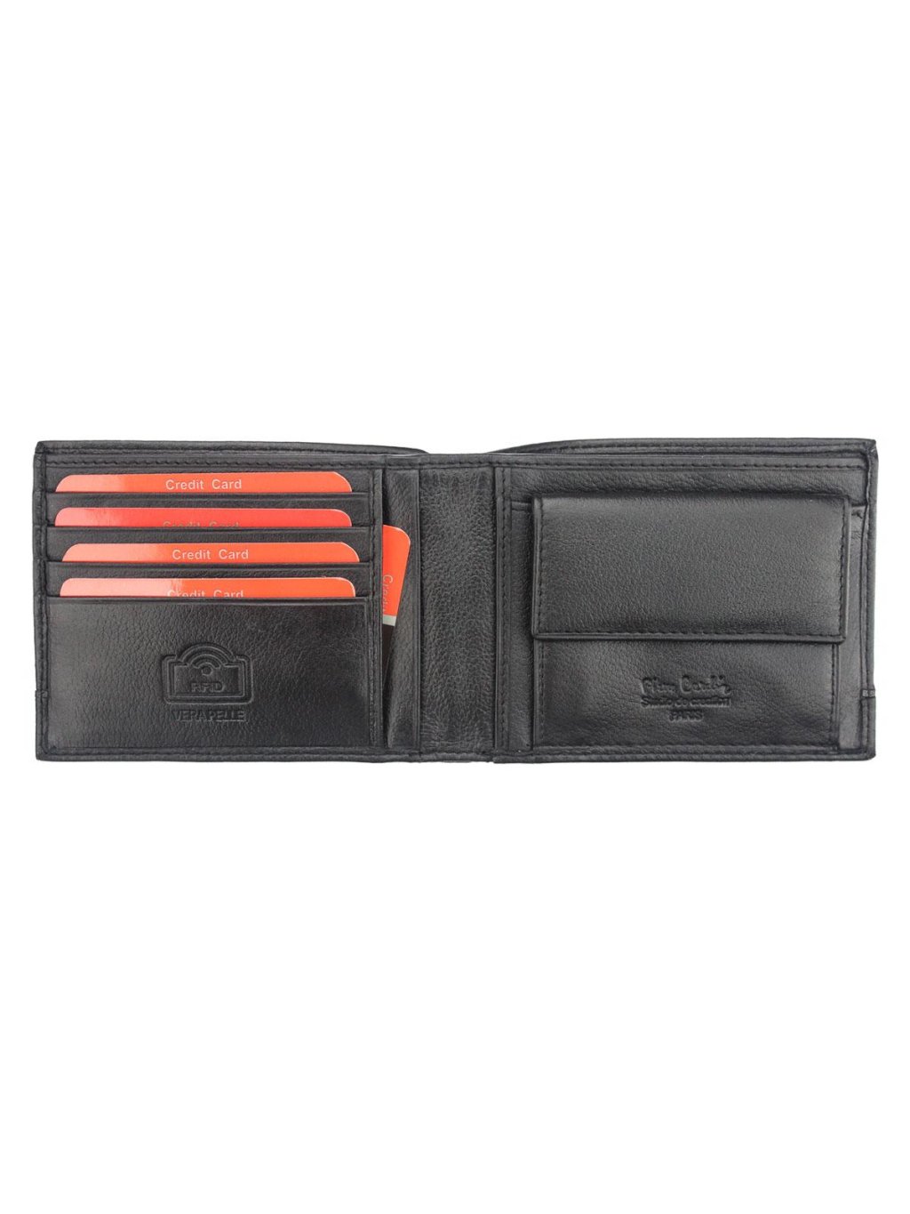 Elegantní pánská peněženka z dílen francouzské módní značky Pierre Cardin, která je ušitá z pravé přírodní měkké hovězí kůže. Peněženka je orientovaná na šířku. Vnitřní část je přehledně členěná. Na pravé straně nalezneme mincovník na drobné mince, který se zavírá drukem. Na levé straně se nachází přihrádky na kreditní karty, věrnostní karty i doklady. Na papírové bankovky má peněženka dva fochy na vrchní straně. Celá peněženka je podšitá látkovou podšívku s vyobrazeným logem francouzské značky. Peněženka je dodávaná v pevné papírové krabičce. Logo francouzské značky je na přední straně peněženky.