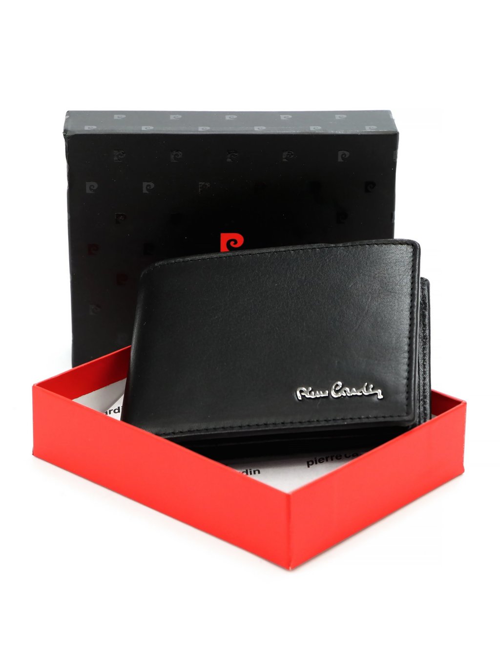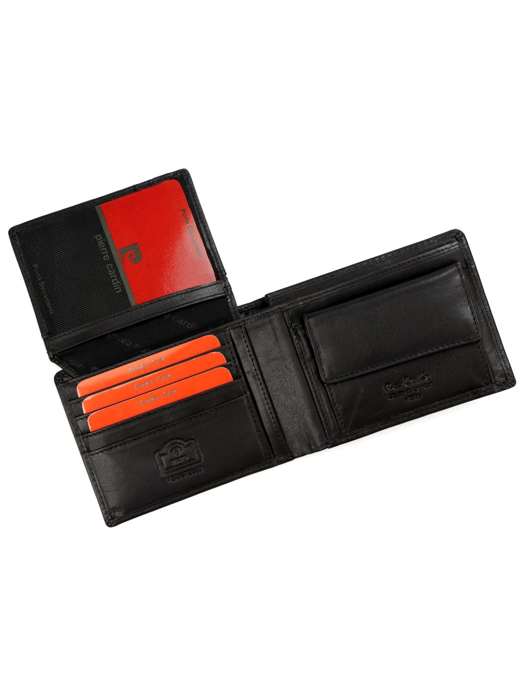 Pánská kožená na šířku orientovaná peněženka značky Pierre Cardin. Uvnitř peněženky najdete malou kapsičku na mince se zapínáním na druk, přihrádky na doklady, věrnostní karty a kreditní karty. V horní části peněženky jsou fochy na papírové bankovky, které jsou podšité látkovou podšívkou. Peněženka je ušita z kvalitní pravé kůže a po obvodu prošita silnou nití, což zvyšuje její odolnost.