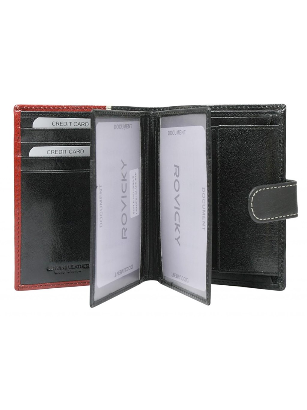 Pánská kožená na výšku orientovaná peněženka značky Rovicky. Uvnitř peněženky najdete malou kapsičku na mince se zapínáním na druk, přihrádky na doklady, věrnostní i kreditní karty. V horní části peněženky jsou fochy na papírové bankovky, které jsou podšité látkovou podšívkou. Peněženka je ušita z kvalitní pravé kůže a po obvodu prošita silnou nití, což zvyšuje její odolnost. Praktická zápinka na druk zajistí, že z peněženky nic nevypadne.