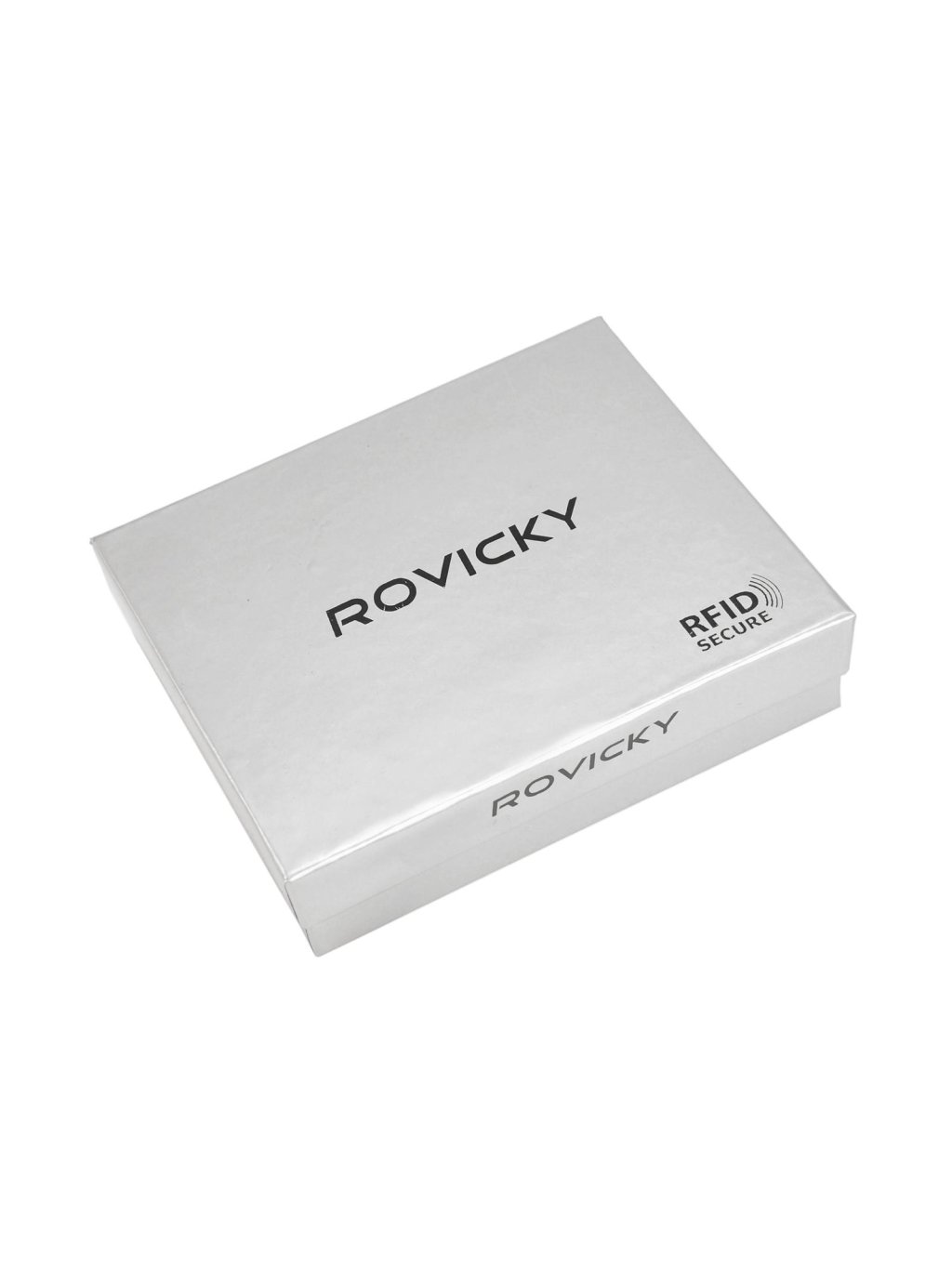 Elegantní pánská kožená peněženka značky ROVICKY. Uvnitř peněženky najdete drukem uzavíratelnou kapsičku na drobné mince, přihrádky na doklady, věrnostní karty i platební karty. Fochy na papírové bankovky jsou podšité látkovou podšívkou. Peněženka je ušitá z kvalitní přírodní kůže a je po obvodu prošitá pevnou nití, což zvyšuje její životnost.