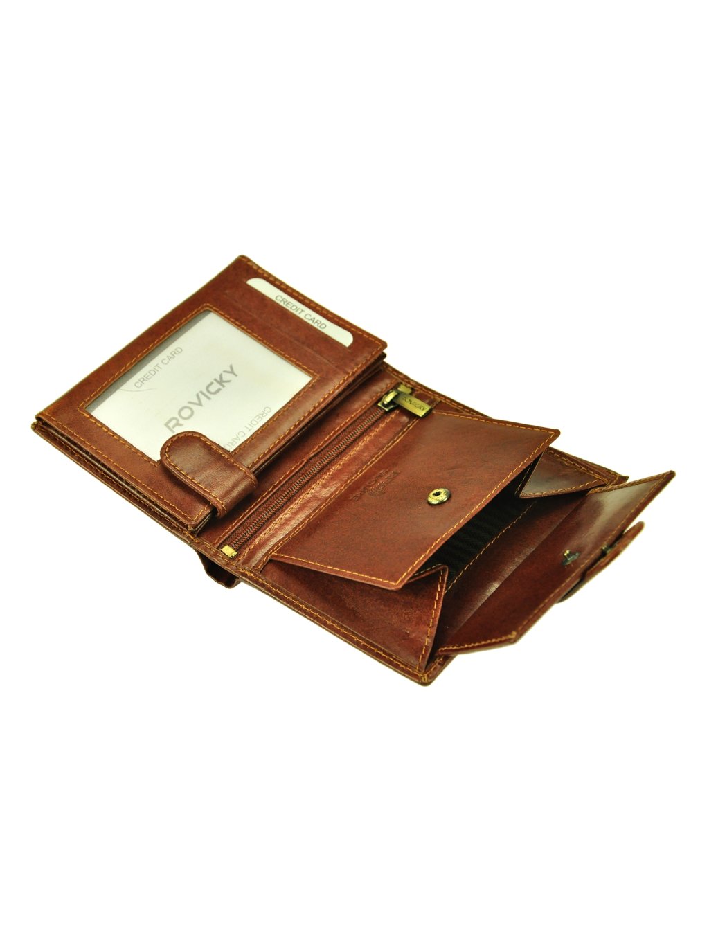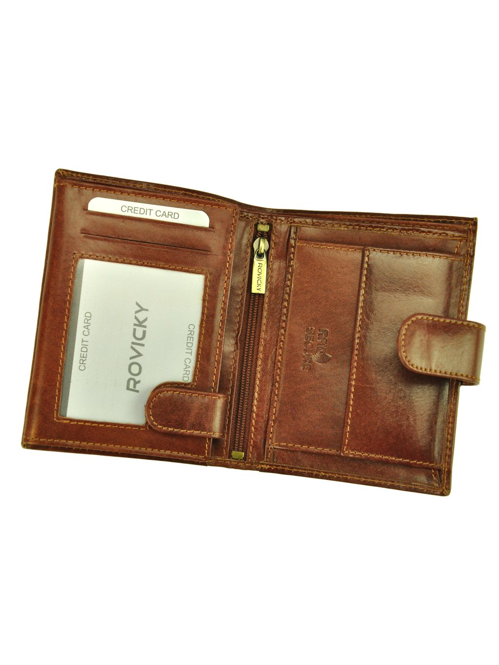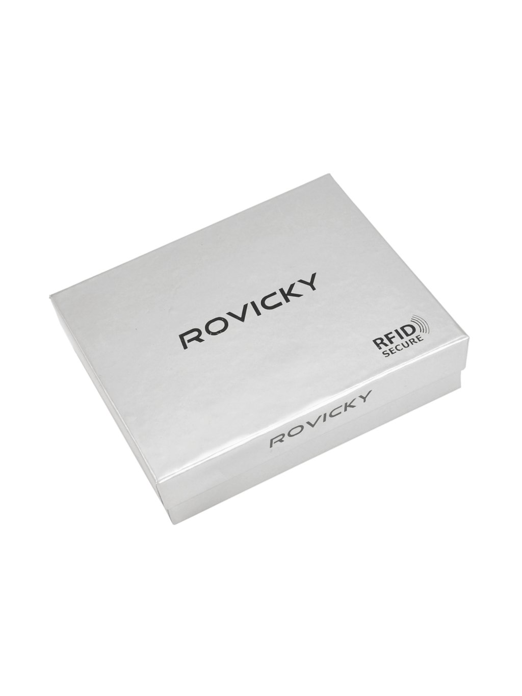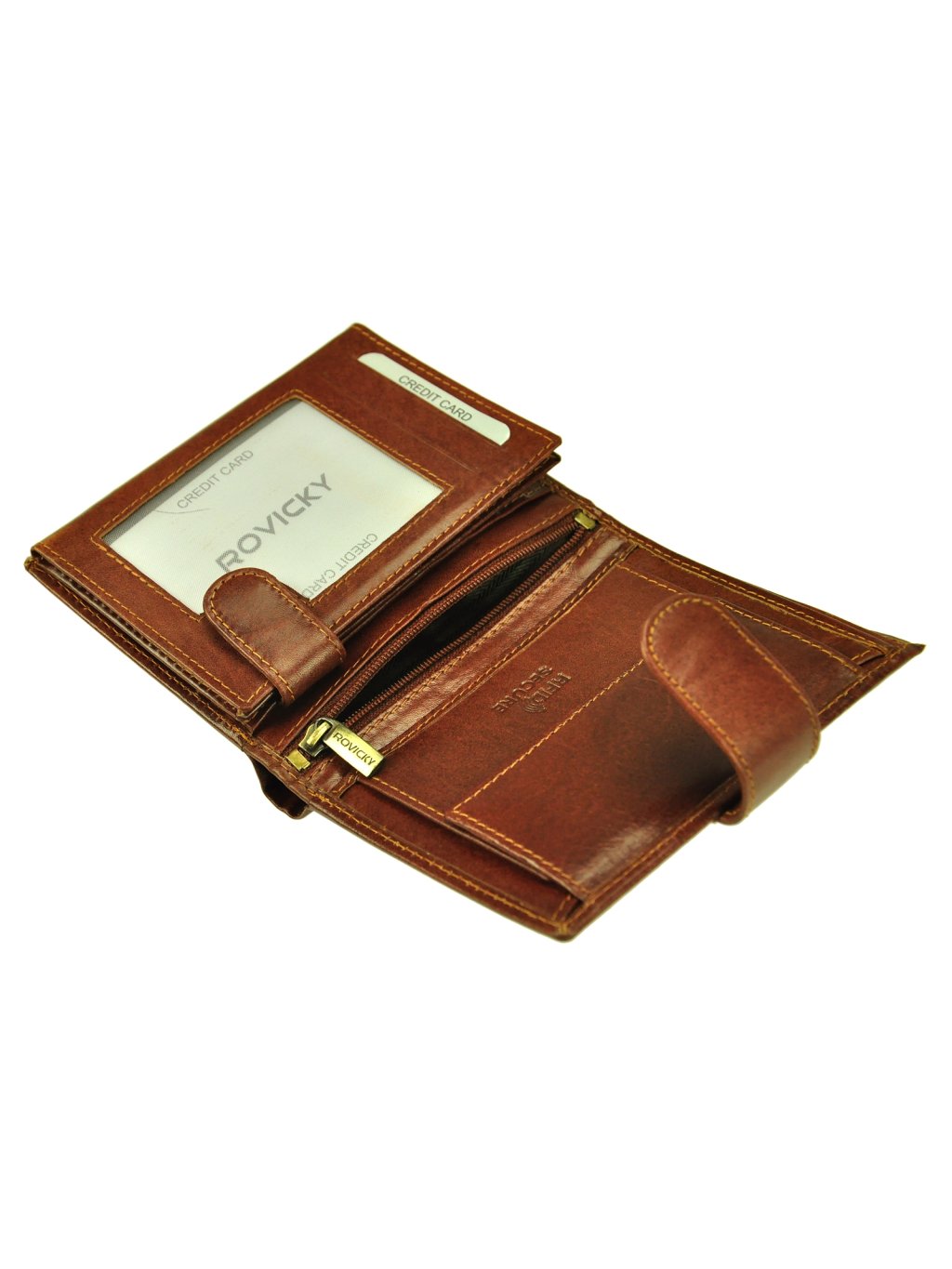 Elegantní pánská kožená peněženka značky ROVICKY. Uvnitř peněženky najdete drukem uzavíratelnou kapsičku na drobné mince, přihrádky na doklady, věrnostní karty i platební karty. Fochy na papírové bankovky jsou podšité látkovou podšívkou. Peněženka je ušitá z kvalitní přírodní kůže a je po obvodu prošitá pevnou nití, což zvyšuje její životnost. Praktická zápinka zajistí, že Vám z peněženky nic nevypadne.